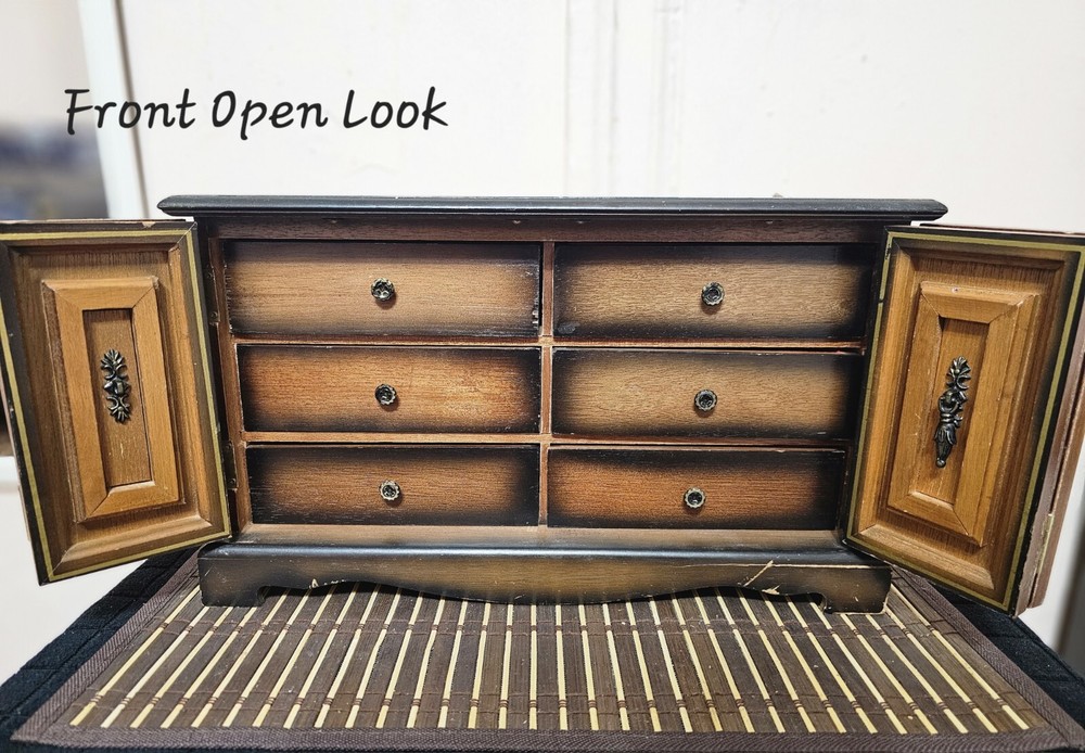 This stunning vintage jewelry box takes me back in time! The solid wood craftsmanship is beautiful, and I love the intricate metal details. Six drawers and two side doors keep my jewelry neatly organized, and the music box adds such a sweet, nostalgic touch. Finding a piece in this condition from the 1950s feels like discovering a hidden treasure β it's both elegant and practical.