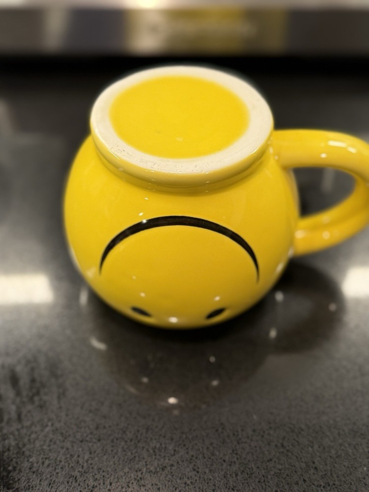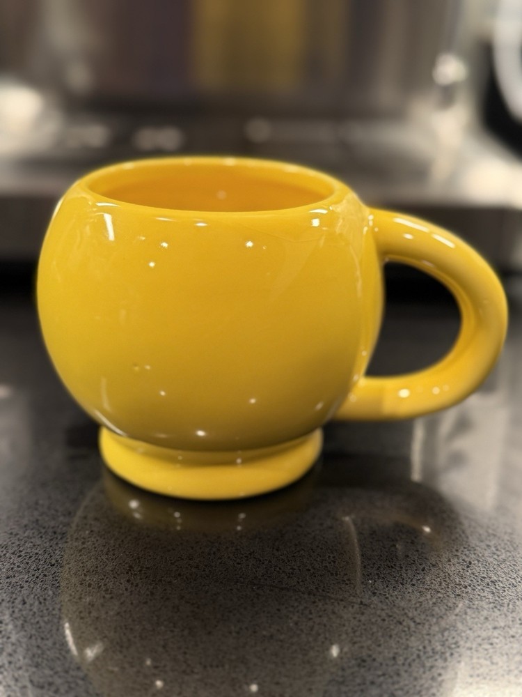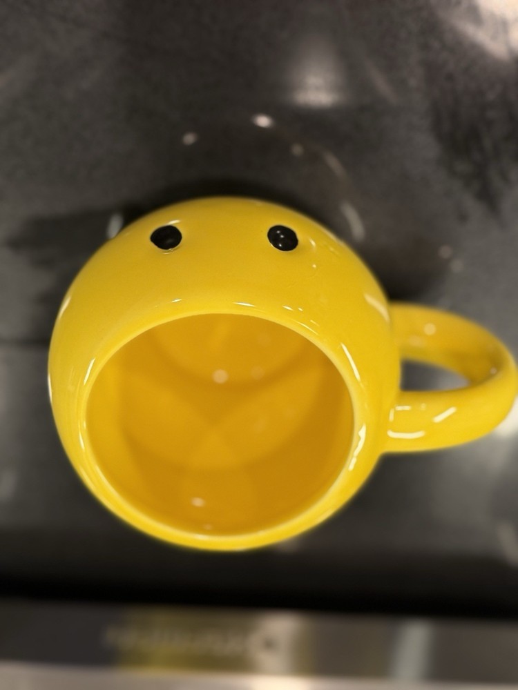 Brighten your day (and your kitchen shelf) with this retro yellow smiley face mug! With its classic round shape and bold black smile, this mug is perfect for anyone who loves a dose of joy with their morning coffee.