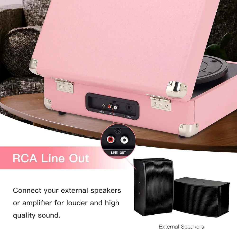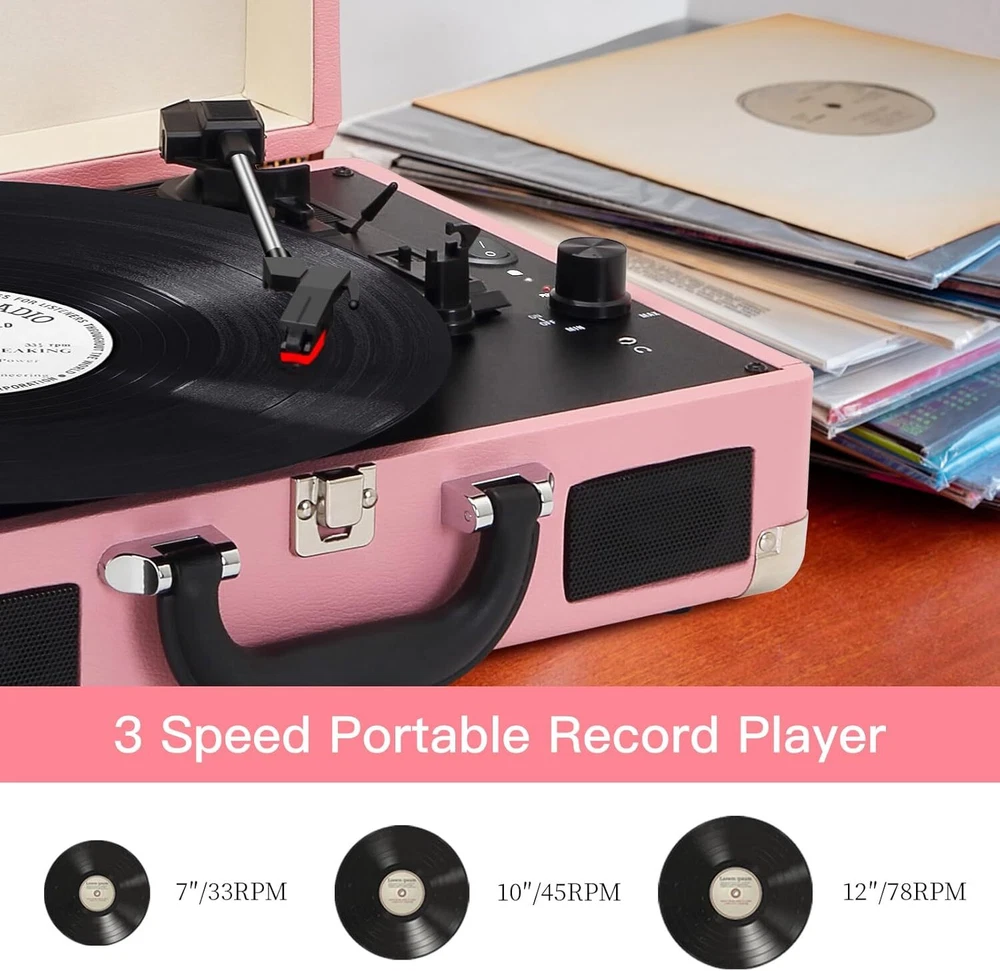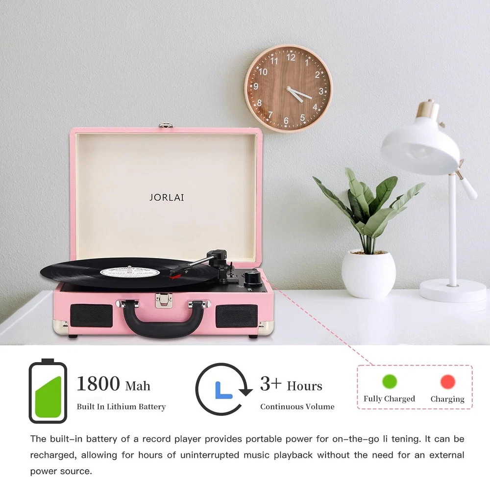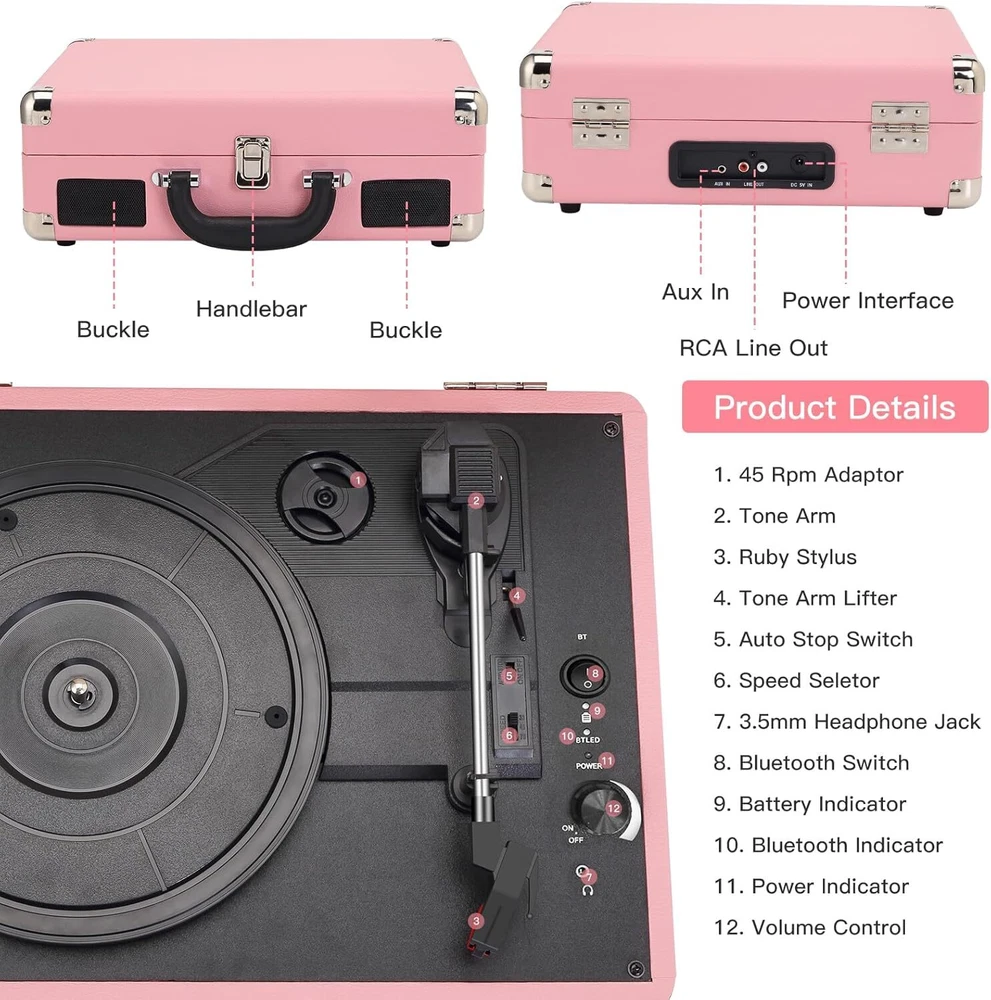 【3 Speed Record Player】Play all your favorite records with ease on record player. Features include three-speed playback (33/45/78 RPM) to accommodate vinyl records. The RCA output allows you to connect to a variety of sound systems. Enjoy your vinyl collection like never before with the smooth and seamless playback of our record player. 【Wireless Bluetooth】Stream your music wirelessly with our record player's Bluetooth capability. With the ability to connect to your smartphone, tablet, or any other Bluetooth-enabled device, you can enjoy all your favorite tunes with the touch of a button. With high-quality built-in stereo speakers, you can enjoy powerful sound outside. 【Built in Battery & Portable Design】With built-in stereo speakers and a 1800 Mah(up to 3 hours play) long-lasting battery, you can listen to your favorite records for hours without interruption. Perfect for music lovers who value quality and portability. 【Built in Speakers】 Take your vinyl collection to new heights with our record player's built-in stereo speakers. No need for external sound systems, this turntable delivers powerful and clear audio right out of the suitcase. With Product Description