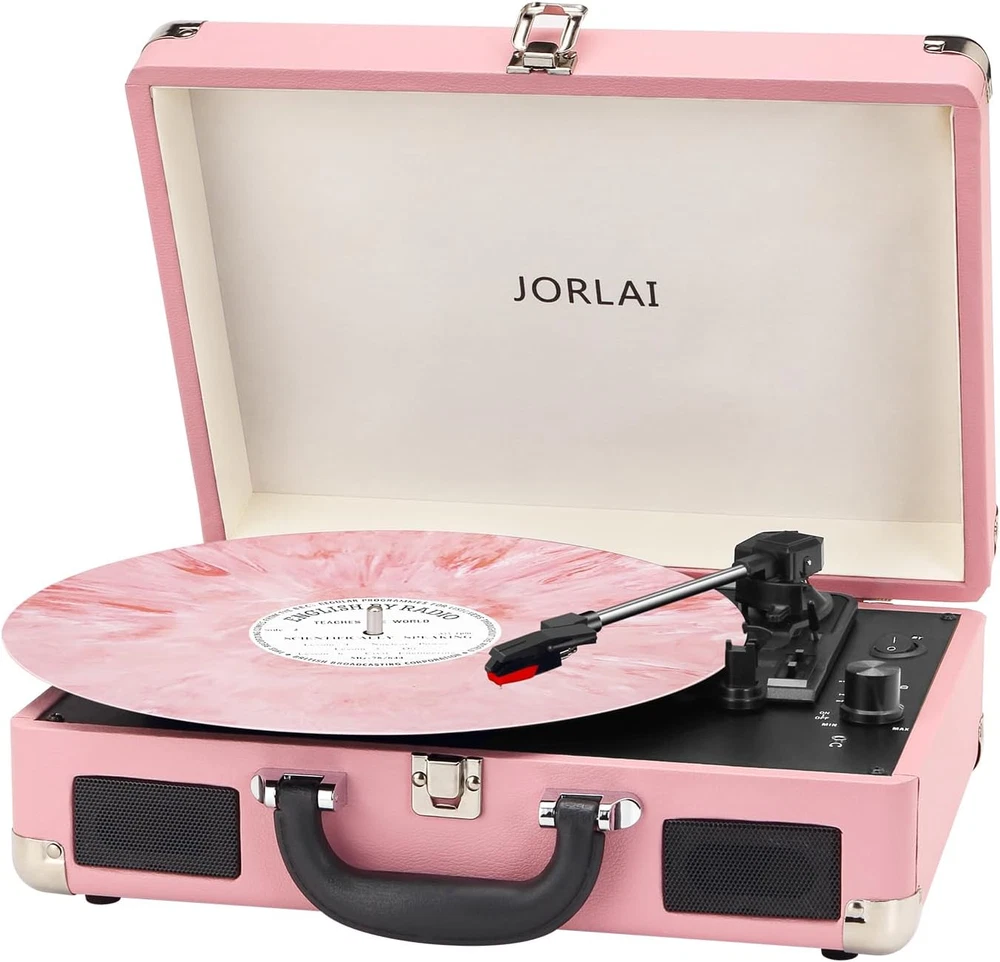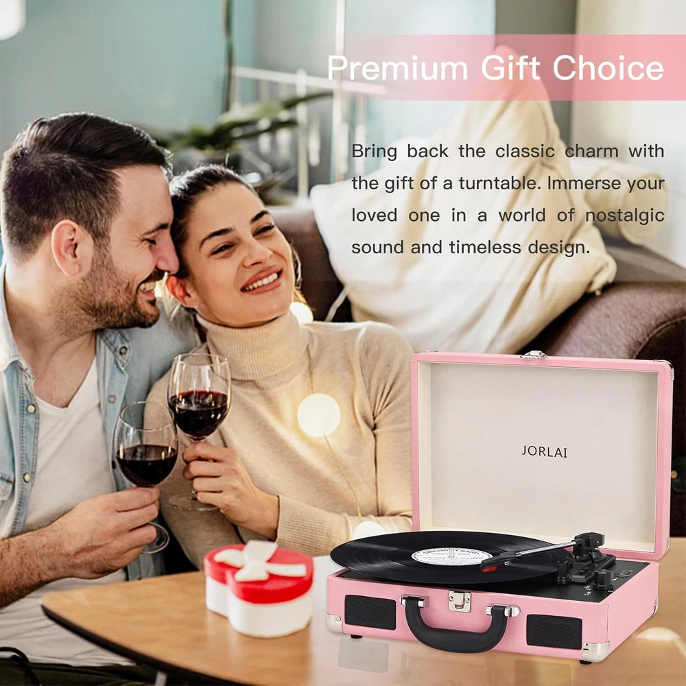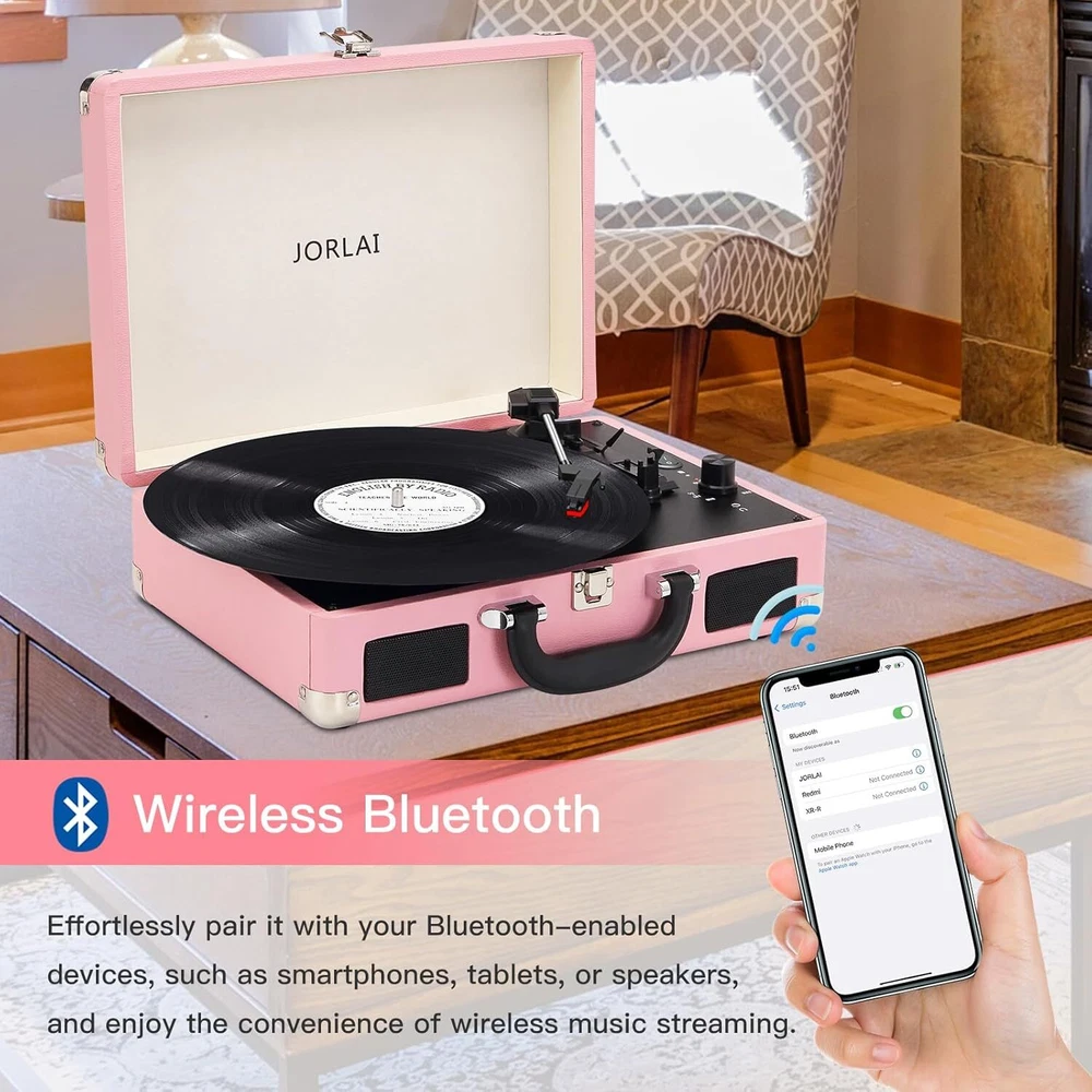 【3 Speed Record Player】Play all your favorite records with ease on record player. Features include three-speed playback (33/45/78 RPM) to accommodate vinyl records. The RCA output allows you to connect to a variety of sound systems. Enjoy your vinyl collection like never before with the smooth and seamless playback of our record player. 【Wireless Bluetooth】Stream your music wirelessly with our record player's Bluetooth capability. With the ability to connect to your smartphone, tablet, or any other Bluetooth-enabled device, you can enjoy all your favorite tunes with the touch of a button. With high-quality built-in stereo speakers, you can enjoy powerful sound outside. 【Built in Battery & Portable Design】With built-in stereo speakers and a 1800 Mah(up to 3 hours play) long-lasting battery, you can listen to your favorite records for hours without interruption. Perfect for music lovers who value quality and portability. 【Built in Speakers】 Take your vinyl collection to new heights with our record player's built-in stereo speakers. No need for external sound systems, this turntable delivers powerful and clear audio right out of the suitcase. With Product Description