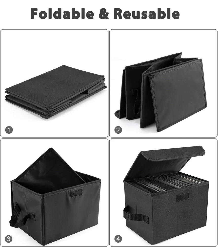 is committed to manufacturing high-quality, durable, comfortable, healthy, and reliable products, providing you with the best service! Are you angry about looking for vinyl records everywhere? Do you feel a headache about the increasingly messy vinyl records? Say goodbye to these troubles with vinyl records! Foldable record storage box Protect and store your precious vinyl records with our foldable burlap storage box. The box is spacious and has enough space to accommodate over 90 single player albums Foldable Multifunctional File Storage Manager - The storage manager can accommodate files of letter size and legal size, as well as other items besides files. Can be used as a very durable file box, very suitable for hanging folders, suitable for regular cube shelves or closet shelves. Perfect size, perfect for storing documents, legal letters, books, etc. in the office, and also the best gift and assistance VINYL STORAGE - Please Note,This Stylish Vinyl Records Storage Holder Only for 7-inch Records,Decorative Black Nylon Case 1-Piece Set, designed for organizing and storing your favorite vinyl records!,The selection of high-density cardboard and durable fabric ensures its durability.Get ready to rock with the vinyl record holder, a stylish way to organize, store and protect your records and easily organize your album collection EASILY SORT AND CATEGORIZE VINYL RECORDS:Our album record holder also includes a sticky note on the front to mark the genre or genre recorded in your collection.No more annoying searches for your favorite records, so you always have the album you want FOLDABLE OR STACKABLE FOR SPACE SAVING STORAGE: Our vinyl record holder make the most of available space,easily fold vinyl organizers when not in use or stack multiple boxes seamlessly together - a great way to keep everything tidy STURDY AND SPACIOUS VINYL STORAGE: You can completely rely on a sturdy, durable vinyl record case to keep your records safe! The record case provides ample space for more than 90 single vinyl records.Thanks to the practical lid of each LP storage case, your records are well protected from dust EASY-TO-CARRY VINYL STORAGE: This record organizer lays flat for quick assembly or disassembly.Beautiful record album storage is very convenient and easy to carry,with two side handles,ready to use. Your favorite sounds are right where you want them!
