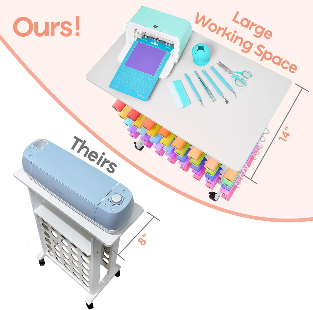 Store New Arrivals Add to Favorite View Feedback Contact Vinyl Storage Cart 40 Vinyl Roll Holders for Cricut Organization and Storage Compatible with All Cricut Machines, Compact Craft Cart with Wheels & Tool Holders for Craft Rooms - White Description Item model number Mini Metal Cart White Number of Shelves 1 Assembly Required Yes Color White Product Dimensions 1"D x 1"W x 1"H Material Metal Item Weight 1 pounds Handle Material Metal Frame Material Metal Caster Type Swivel Number of Wheels 4 Target Audience Unisex Adult Weight Limit 80 Pounds Tailored for All Cricut Machines - Perfectly designed for all Cricut Machines, offering a dedicated top shelf and a second self for Heat press and other accessories like cutting mats, iVyne light pad, iVyne berry and vinyl weeding tools for easy access during your crafting sessions Maximized Vinyl Storage - Holds up to 40 vinyl rolls, keeping your materials neatly organized and easily accessible, ideal for serious crafters with a growing collection Compact & Efficient Design - Measuring 24" L x 14" W x 30" H, this crafting desk fits seamlessly into small spaces, making it the perfect solution for optimizing your craft room or workspace Smooth & Secure Mobility - Features four 360° swivel wheels, including two with brakes, allowing for easy movement and secure positioning wherever you need it in your crafting area Durable & Sturdy Build - Constructed from premium MDF with a robust frame, this cart supports up to 80 lbs, ensuring long-lasting stability even when fully loaded All-In-One Craft Organizer - Equipped with a spacious shelfs and side hooks for tools, this versatile cart keeps all your crafting essentials in one place, helping you maintain a tidy and efficient workspace Mini Metal Cart Pink ABOUT US We offer the best prices around on high quality products. Our E-store includes media such as books, movies, music and games while offering electronics, toys, sporting apparel, clothing, tools, general home, garden items and more. SHIPPING We are always working hard to ensure your package arrives as soon as possible. Please understand that some factors like weather, high postal traffic, and the performance of shipping companies are outside of our control. We offer free shipping to the lower 48 states and ship within 2 business days of payment, usually sooner. We do not accept P.O. Boxes. Please provide a physical address. RETURNS We offer a 30-Day Return Policy on items which you are not completely satisfied with. You have the option for a full-refund or an exchange of the item. No returns are available on items shipped outside of the USA. PAYMENT We accept PayPal. CONTACT US This page content is yet to come Please ad us to your favorite seller and visit again later Thank You CUSTOMER SATISFACTION We try our very best to make sure every customer is completely satisfied. If there's a problem, message us! We're happy to help.