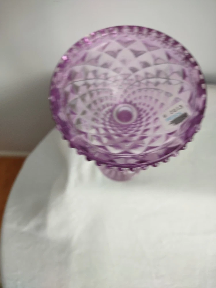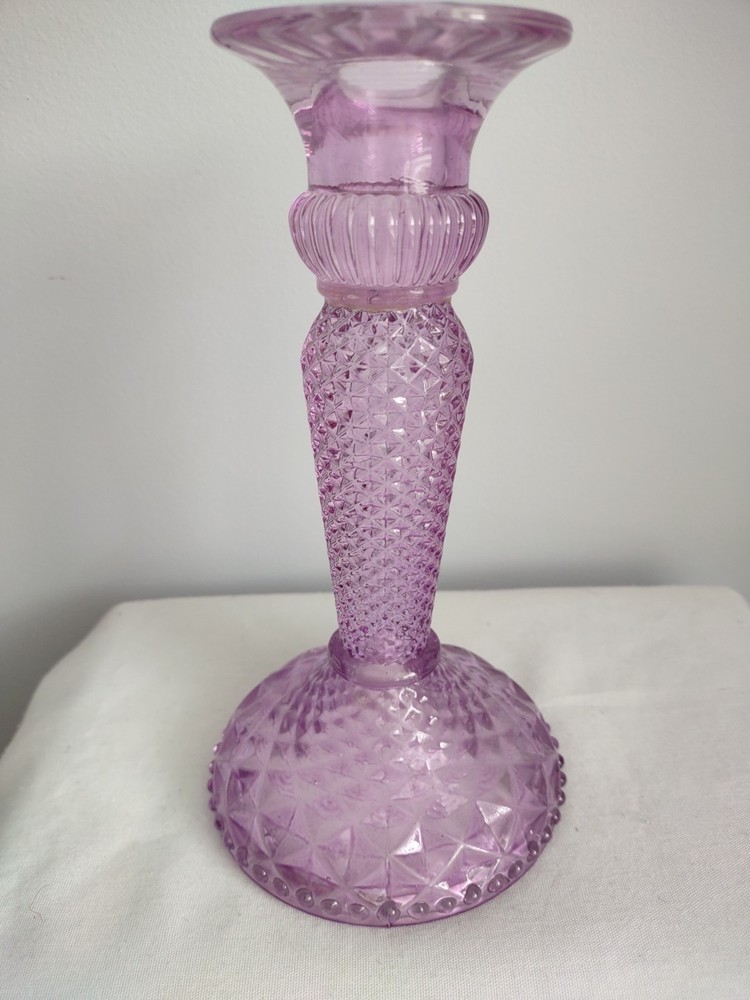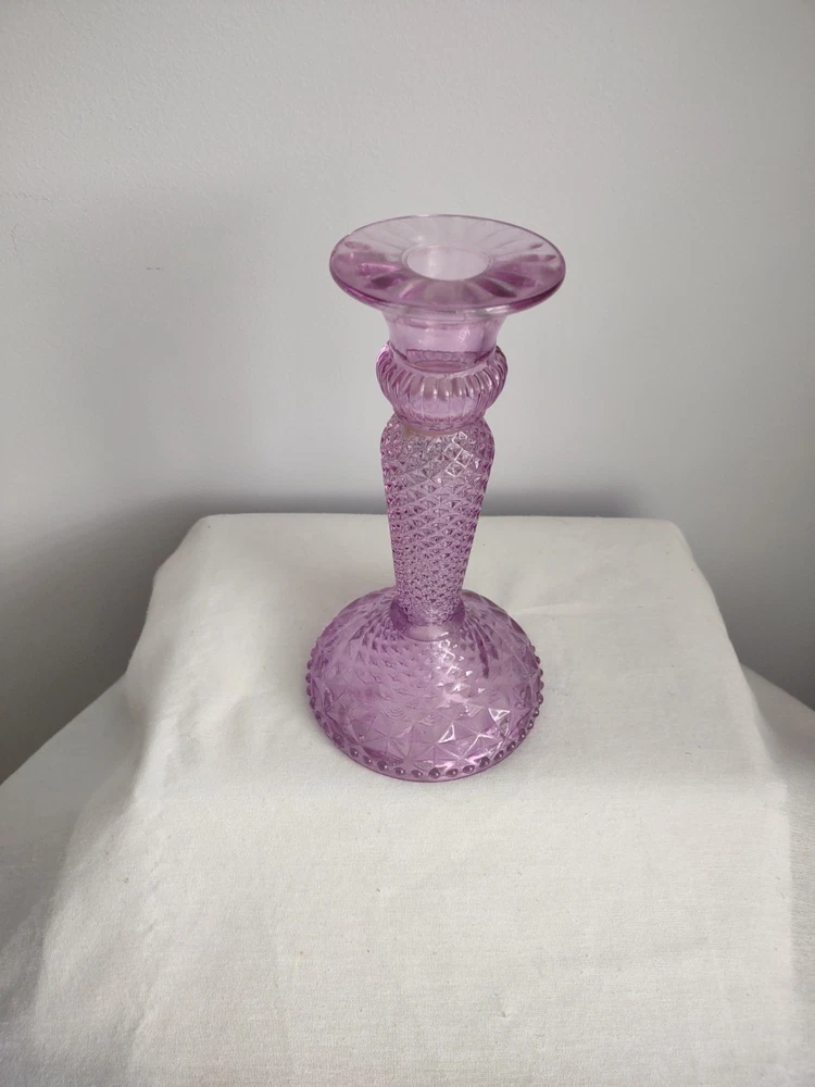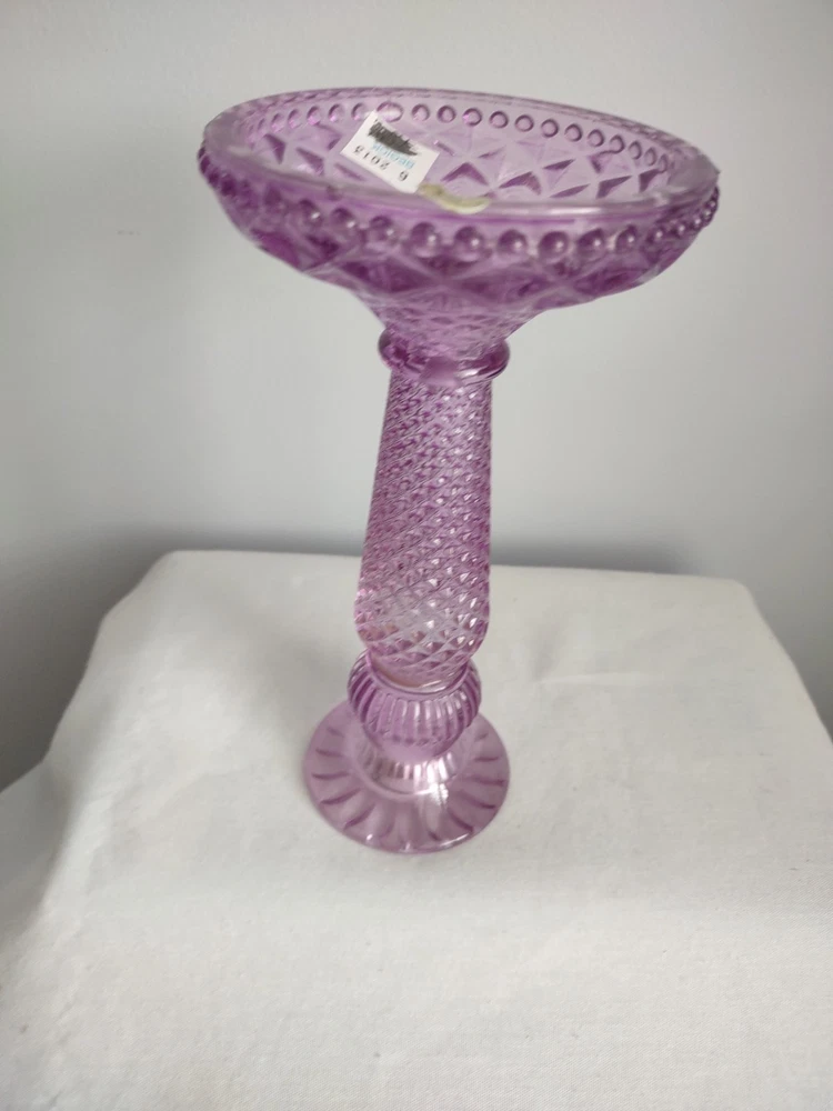 Beautiful Violet Pillar Candle Holder. The measurements are approx 7.25 inches tall, 2.25 inch round top, 4 inch round base, and holds a 1 inch round candle. Very Good Condition. Smoke Free Home