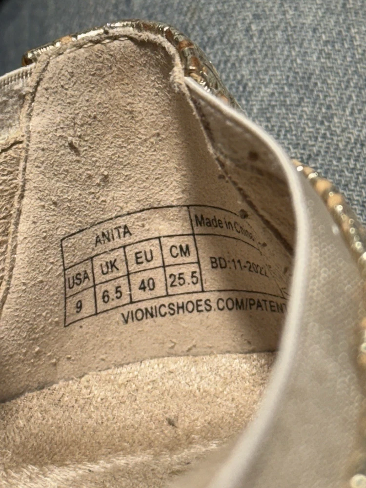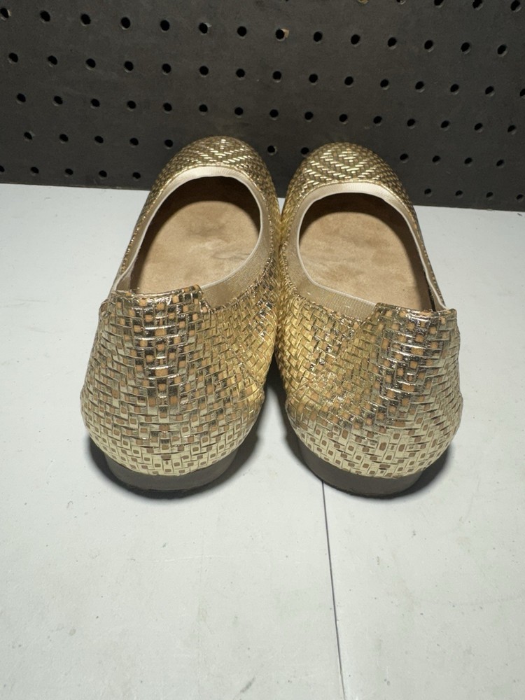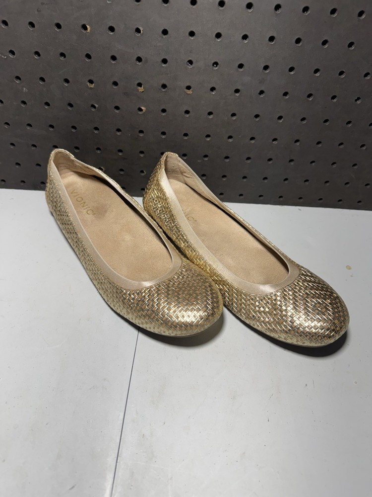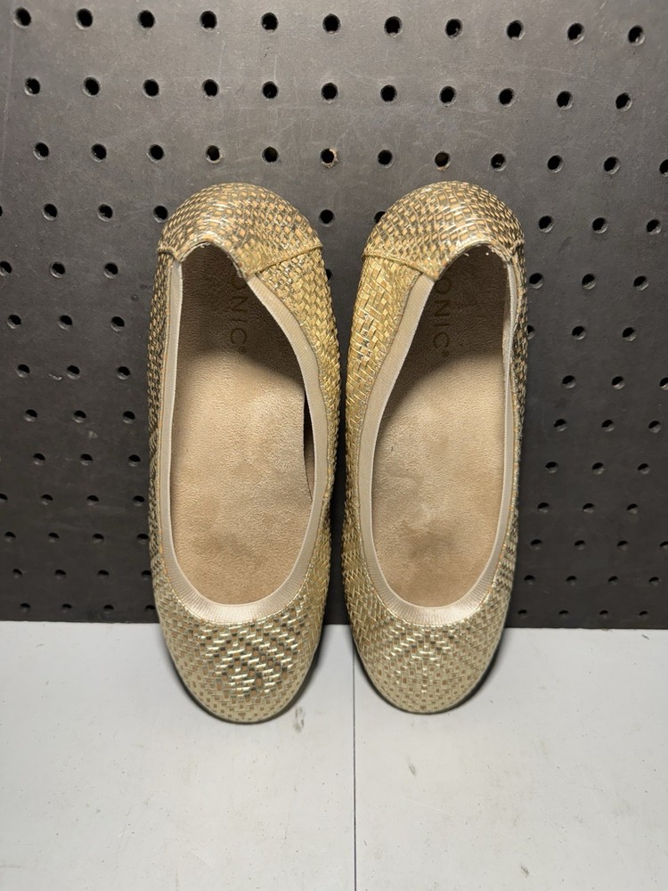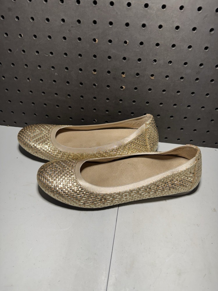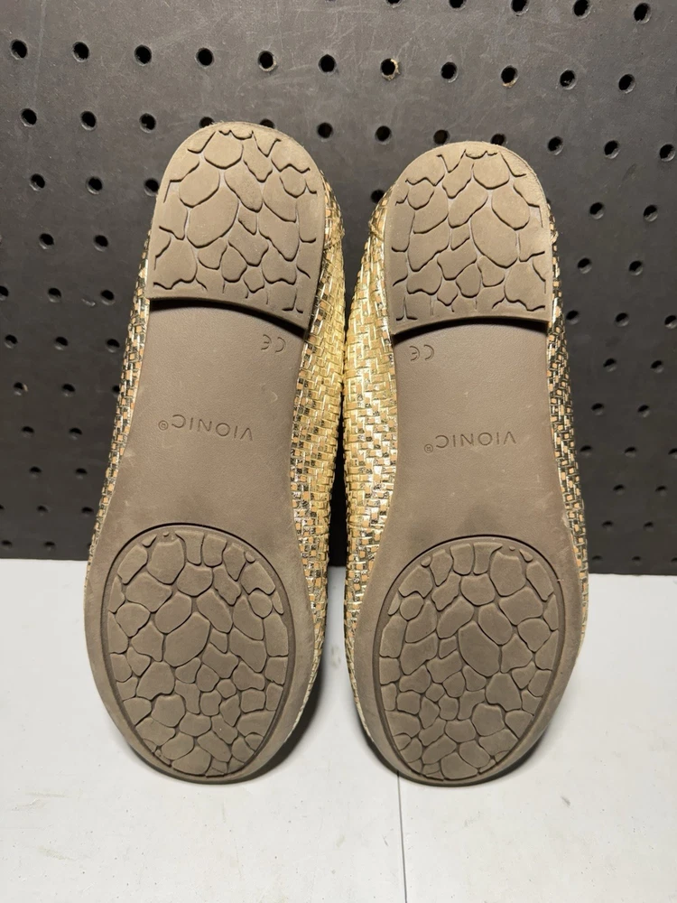 Experience both comfort and style with the Vionic Anita Women's Flats & Oxfords, featuring a chic gold geo suede design. These size 9 ballet flats bring a touch of elegance to your footwear collection, perfect for complementing a variety of outfits. The flats are part of the Vionic brand, known for their quality and foot-friendly design. Crafted with a soft suede upper and designed for the modern woman, these shoes provide a blend of fashion and function that's hard to overlook.