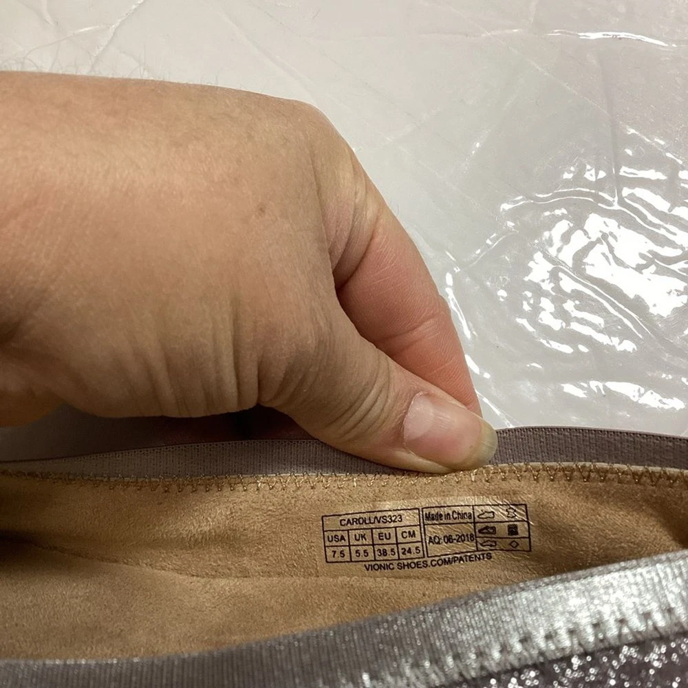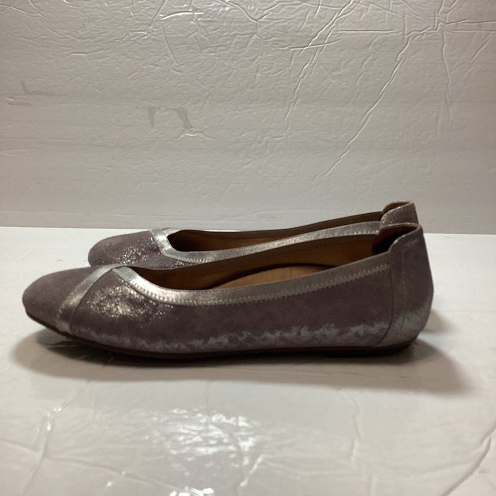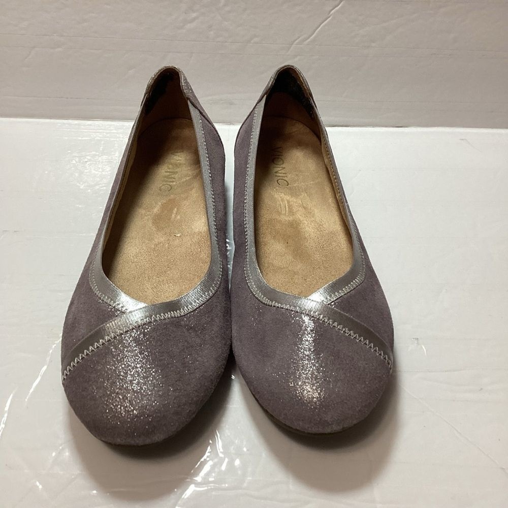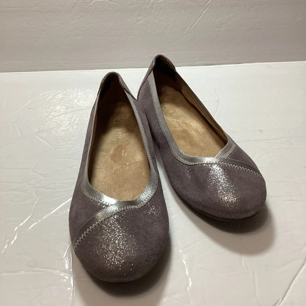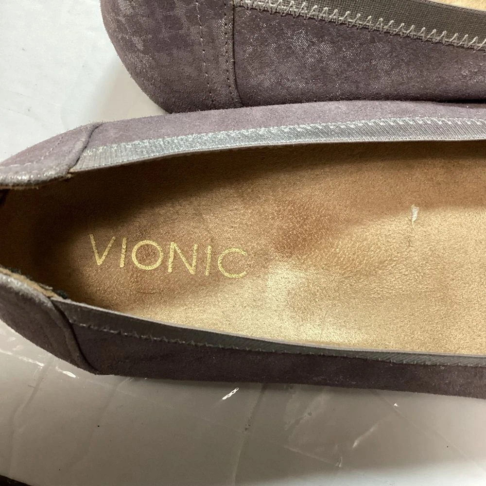 Vionic women’s carol ballet flats, purple shimmer leather, gently used no flaws no original package still in great shape. has a pad on the back of shoe that I cannot take it off Color gray shimmer Size 7.5