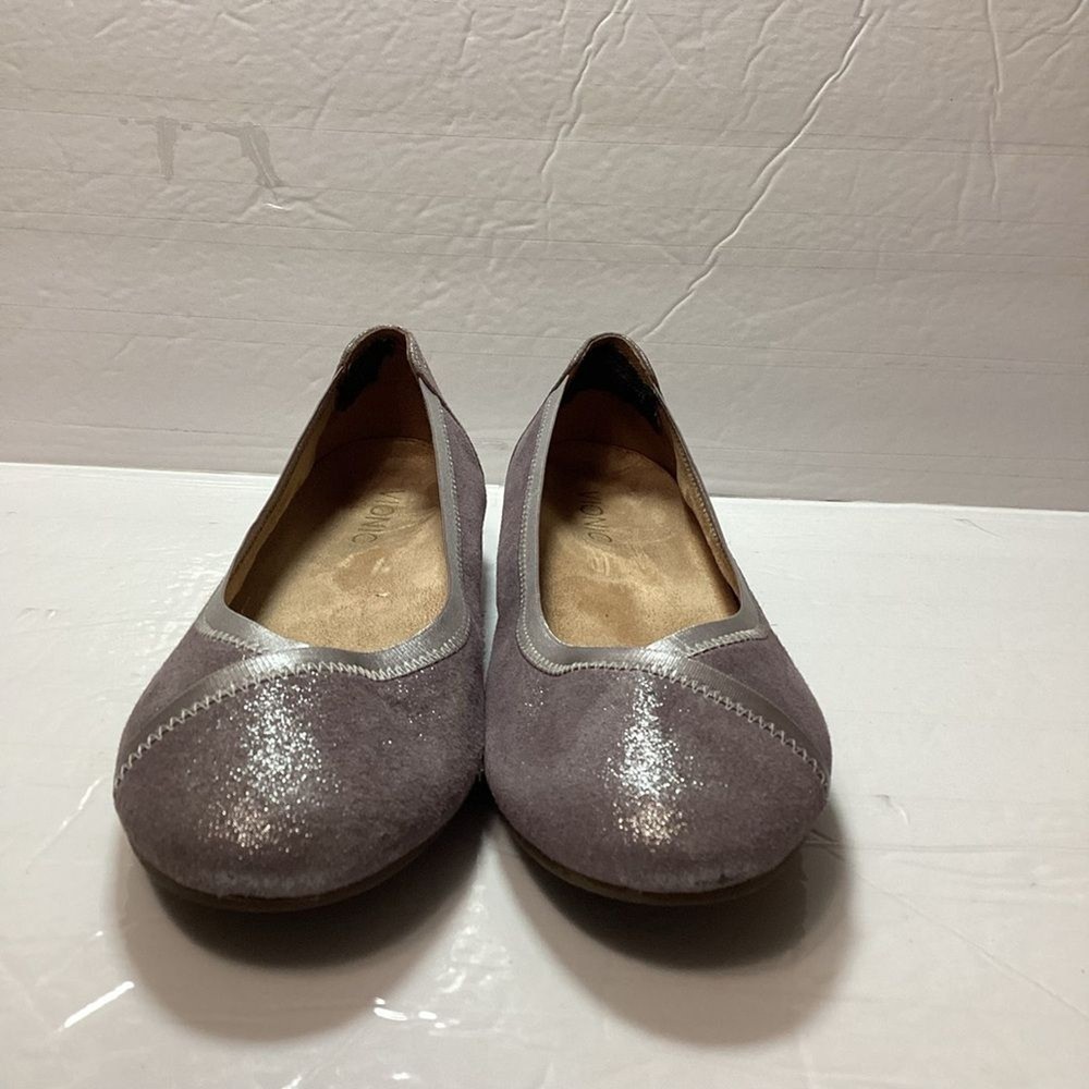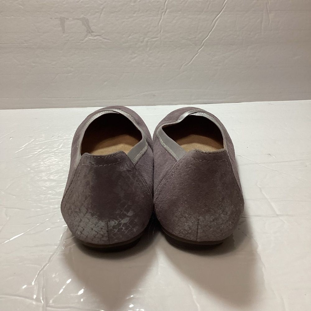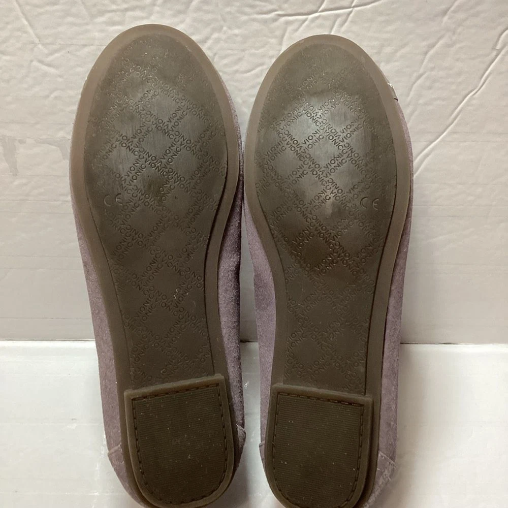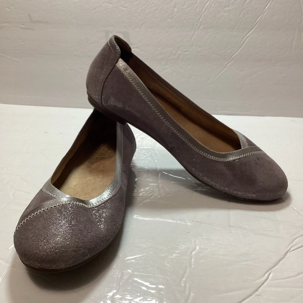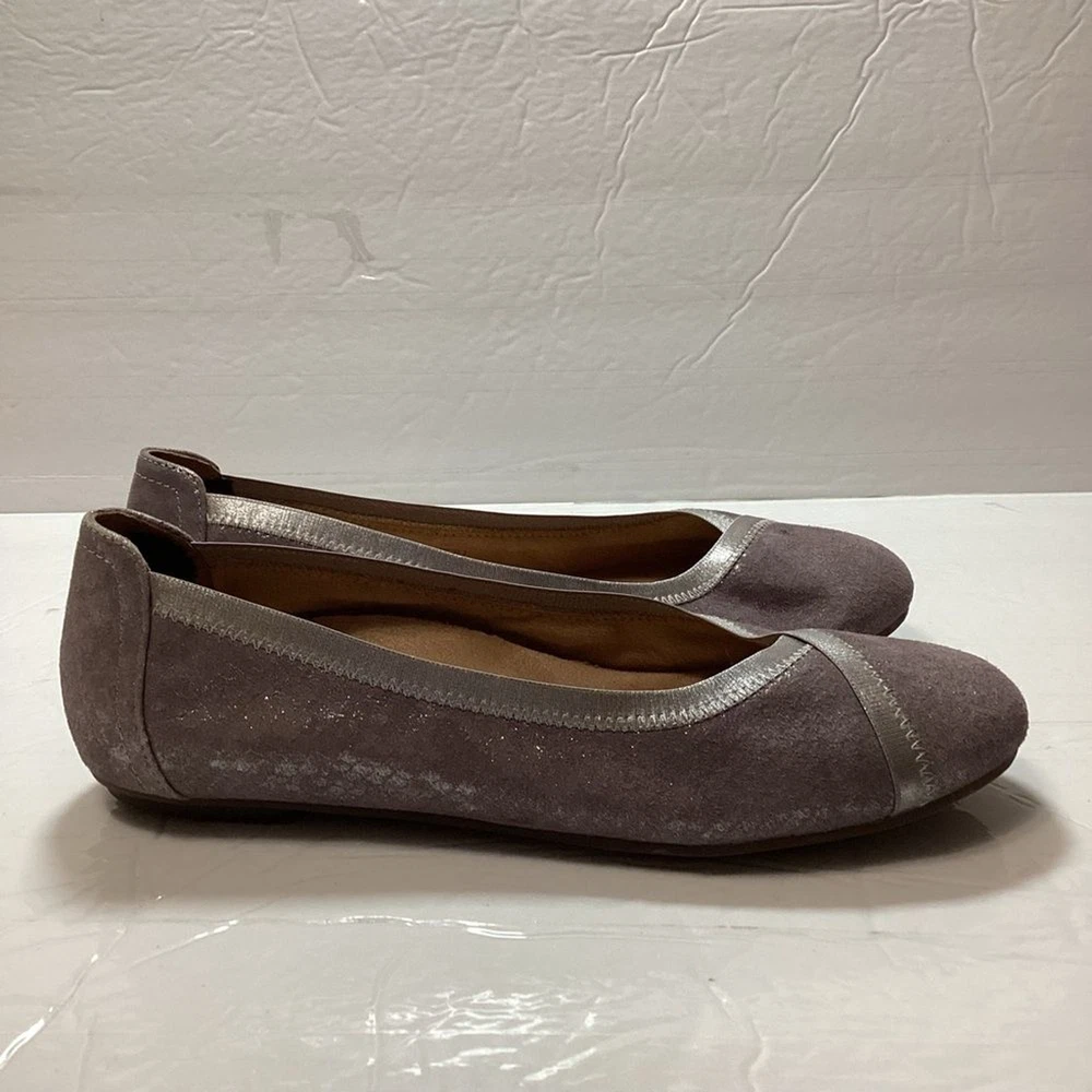 Vionic women’s carol ballet flats, purple shimmer leather, gently used no flaws no original package still in great shape. has a pad on the back of shoe that I cannot take it off Color gray shimmer Size 7.5