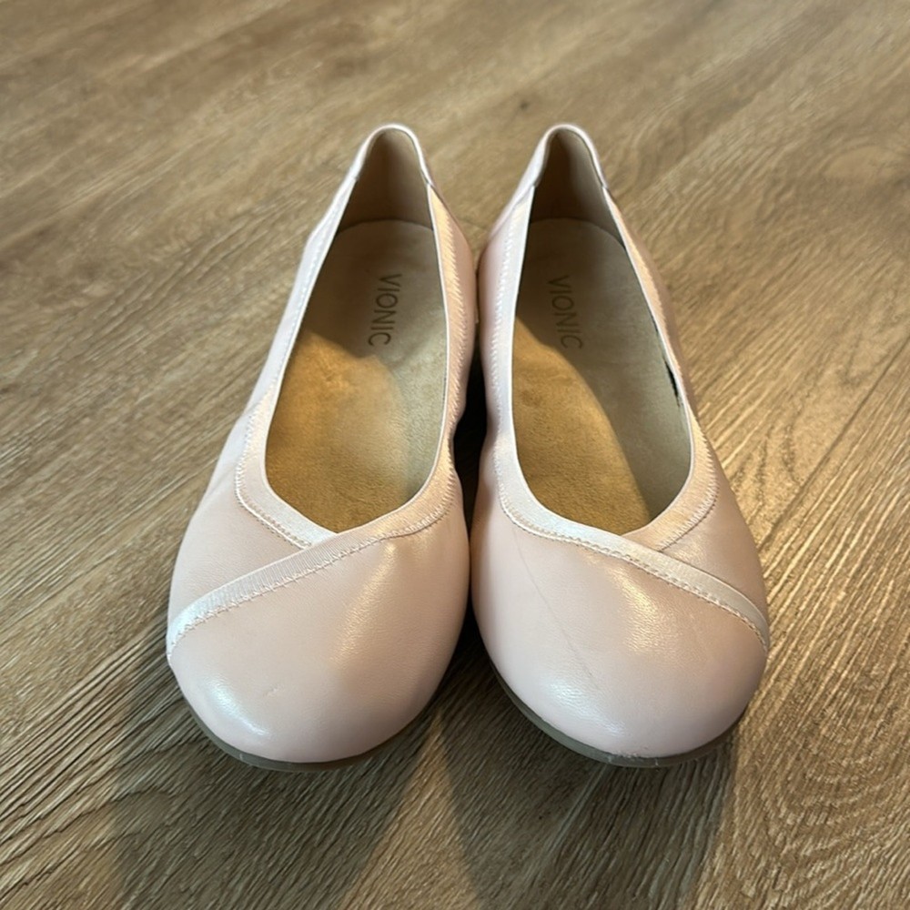 Excellent preowned condition No holes or stains; small scuff on one side, barely visible Size: 8 Color: Light Pink -Leather upper -Comfy elastic top line with cross over detail -Biomechanically designed to hug your arches -Removable microfiber wrapped footbed