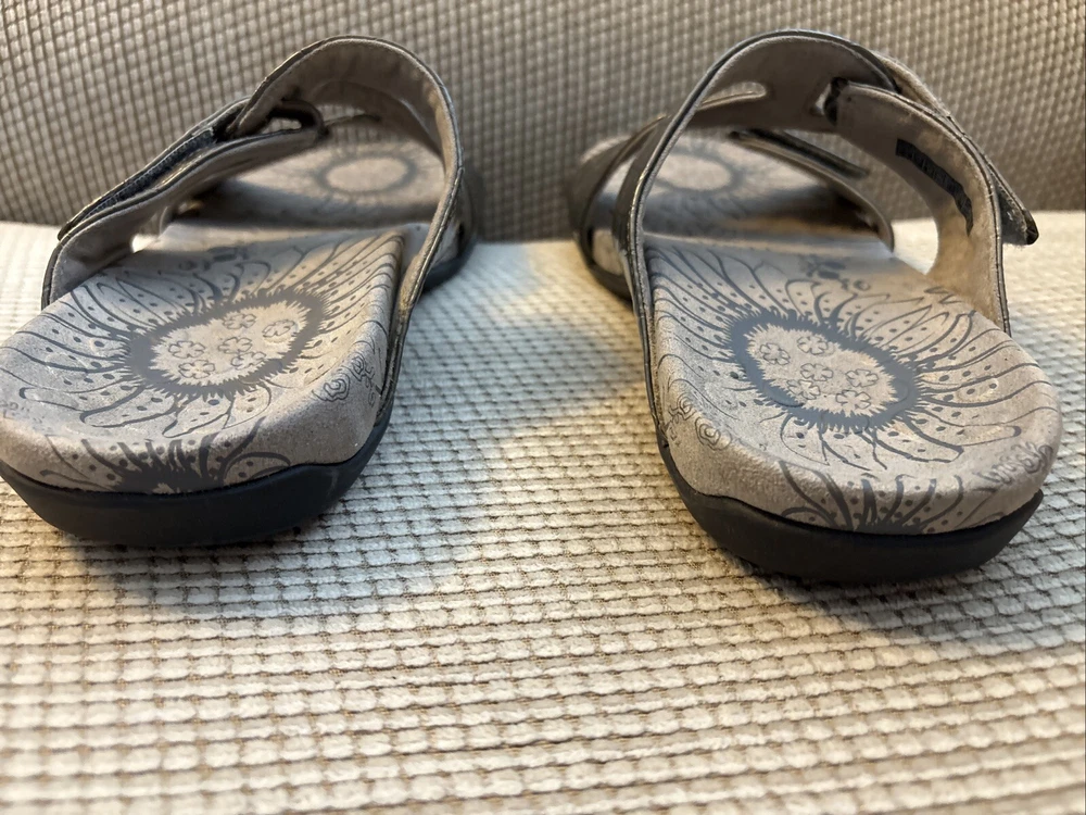The Vionic Lauren Sandals are women's slip-on sandals in a stylish gray croc pattern with a shiny finish. These sandals are designed with a podiatrist-approved construction, featuring arch support and cushioning for maximum comfort. The adjustable strap allows for a customizable fit, while the breathable synthetic upper material and rubber outsole provide durability and support. Perfect for everyday wear, these sandals are a fashionable and practical choice for those looking for both style and foot support.