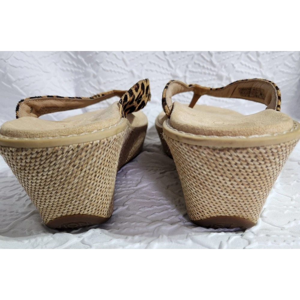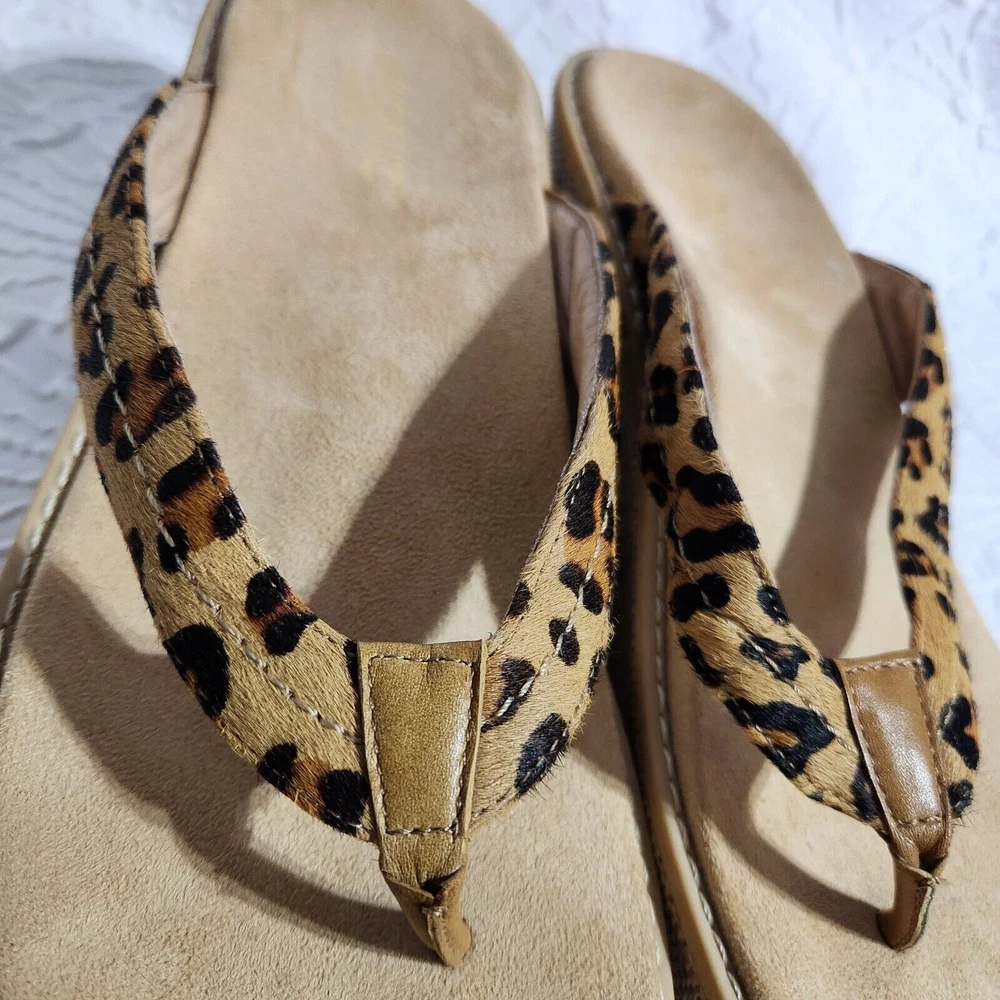The Womens Vionic Orthaheel Grenada Leopard Print Thong Wedge Heel Sandals are a pre-owned pair of shoes designed for casual occasions. They feature a slip-on closure and a medium (B, M) shoe width. The sandals have a multicolor animal print pattern and a patent upper material. The outsole is made of rubber and the insole is made of Vionic material. The sandals are orthopedic and comfortable, with a wedge heel style. They are a size 11 and were manufactured in China.