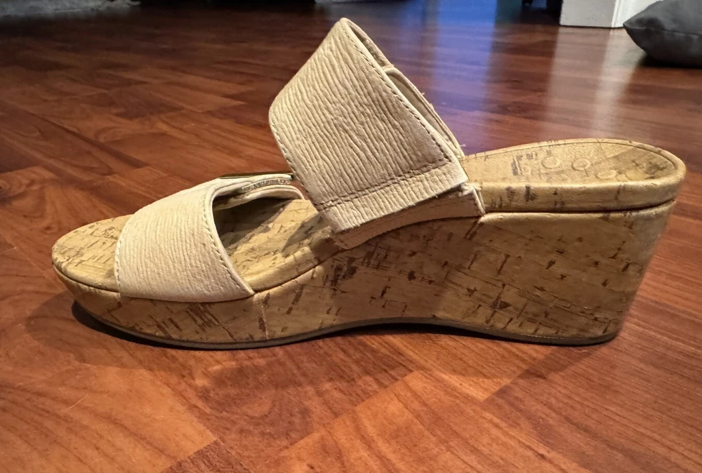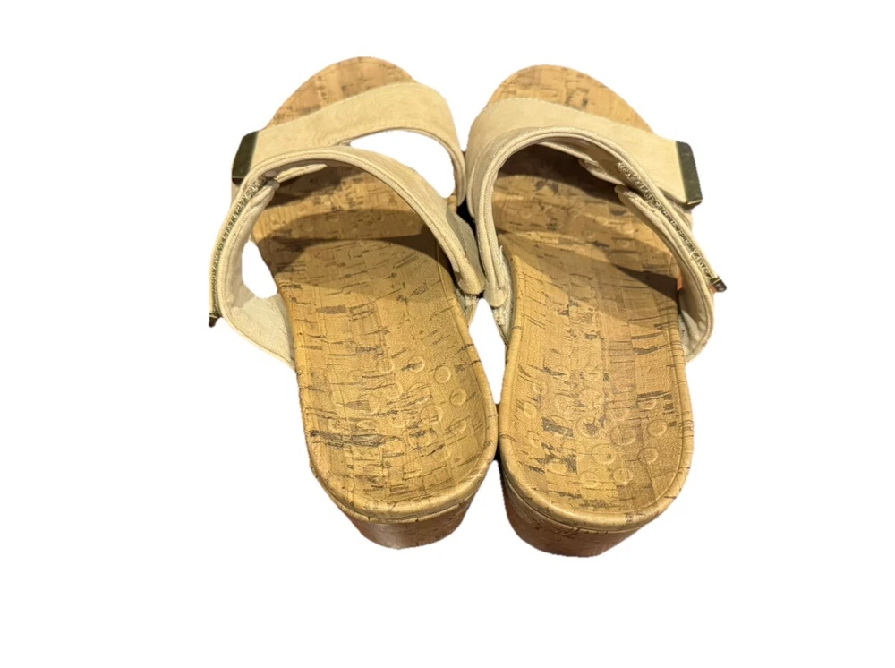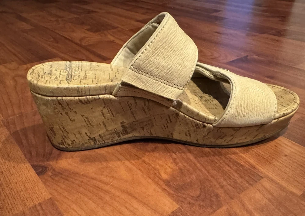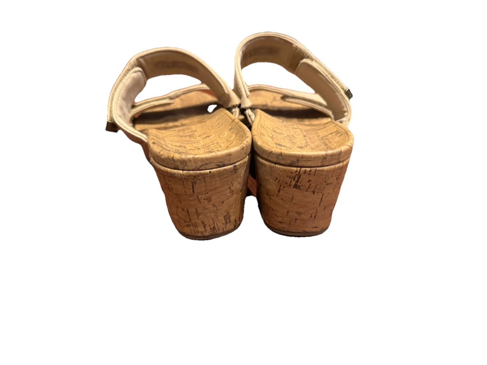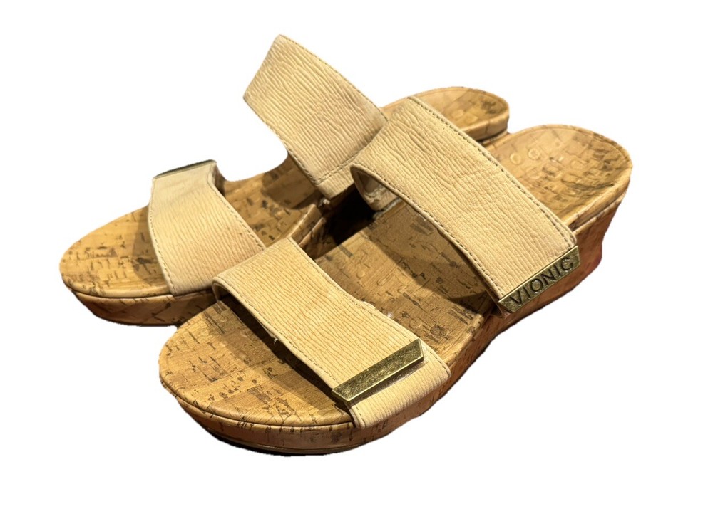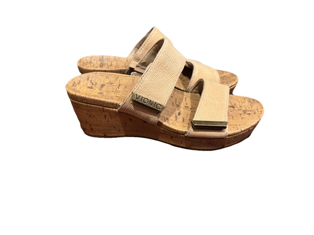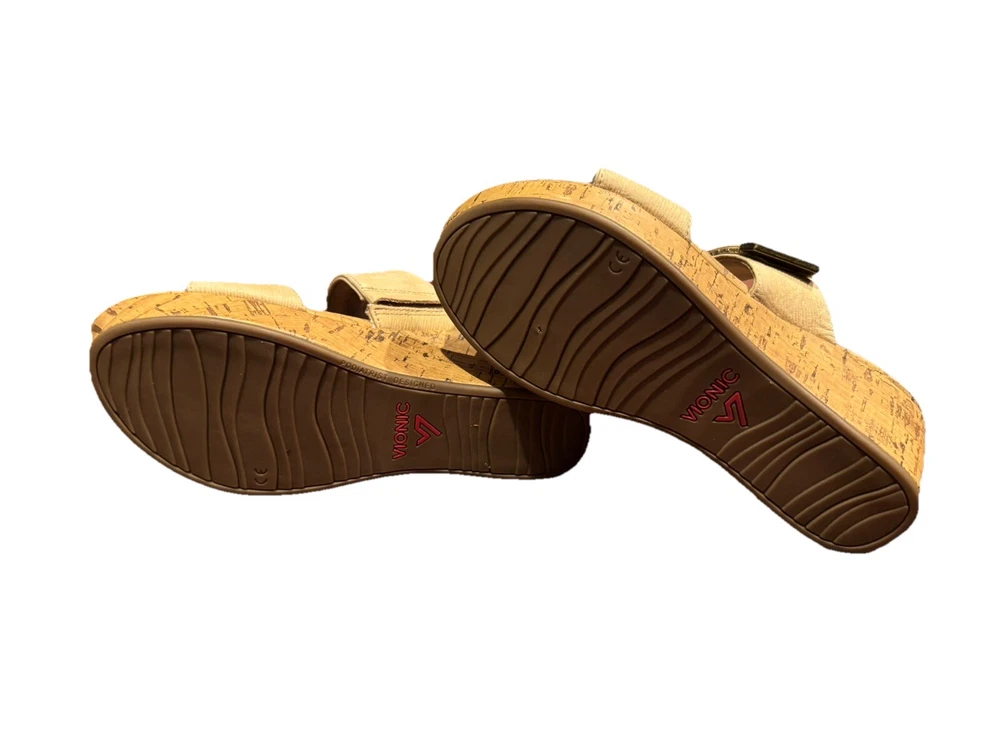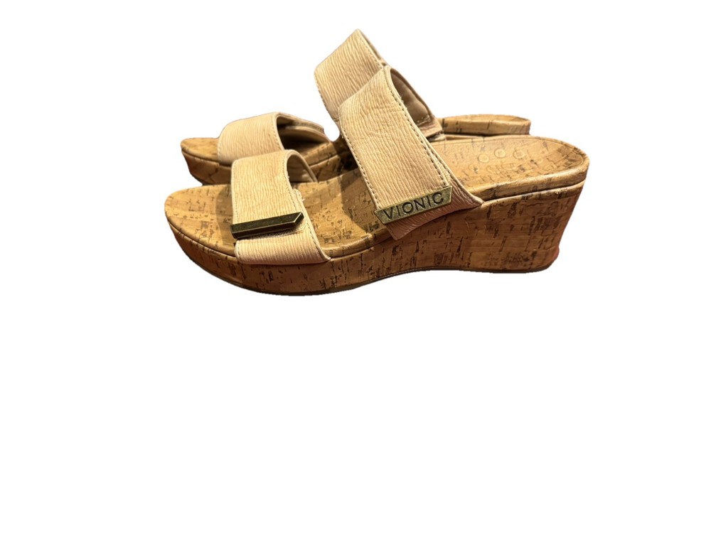 These Vionic Pepper sandals are a stylish and comfortable choice for women. They feature a cork-wrapped wedge heel with embossed leather in a tan color. Designed with arch support and a non-slip outsole, they also have adjustable straps for a secure fit. Perfect for summer and spring, these slip-on sandals are both fashionable and supportive. Condition: Excellent pre-owned. No flaws to note. Coming from a smoke -free home. Upper: Embossed Leather Footbed: Cork Wrapped EVA Outsole: Durable Rubber Full-contact support hugs your foot's curves. Vionic's Elevated Support technology gives you comfort and style in their wedges and heels. Heel seat stabilizes and positions foot. Ball-of-foot cushioning for all-day comfort. Vionic's Elevated Support technology helps you walk and stand in comfort throughout the day - even in heels and wedges. Ideal for anyone looking for great arch support and comfortable shoes. We suggest wearing these for a few hours at a time for the first few days to allow your body to adapt to Vionic's biomechanical orthotic technology.