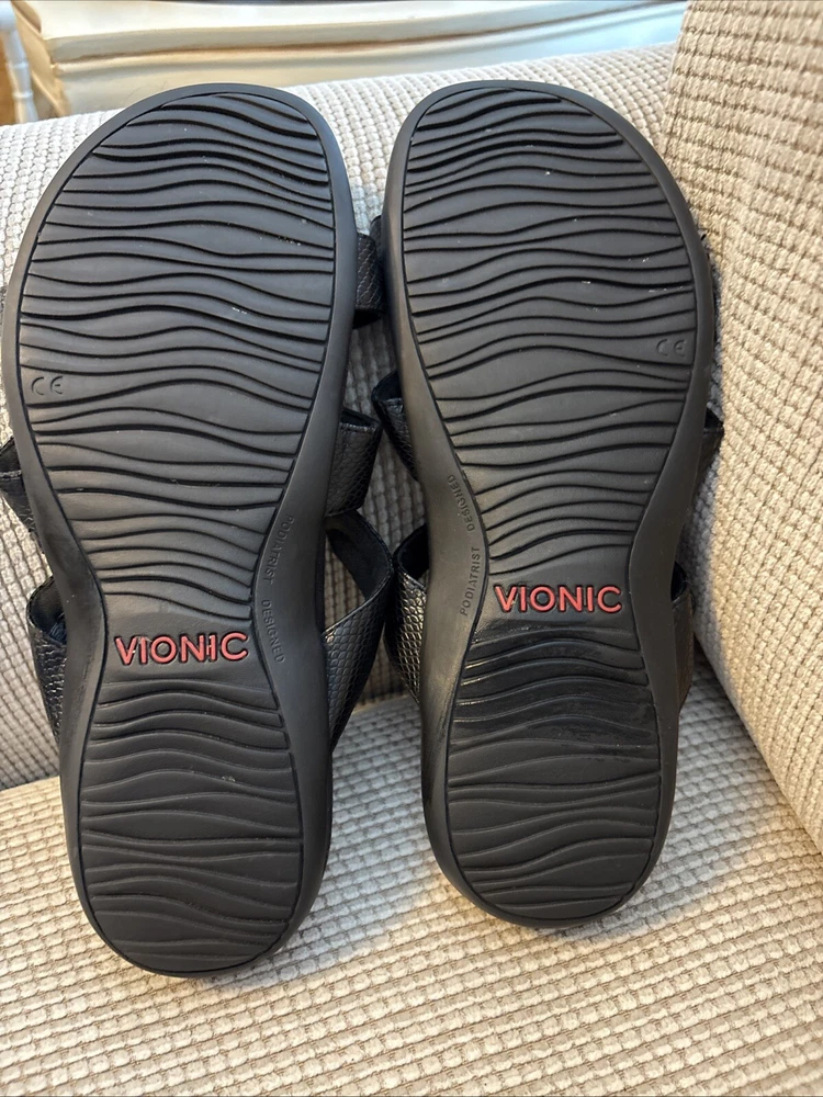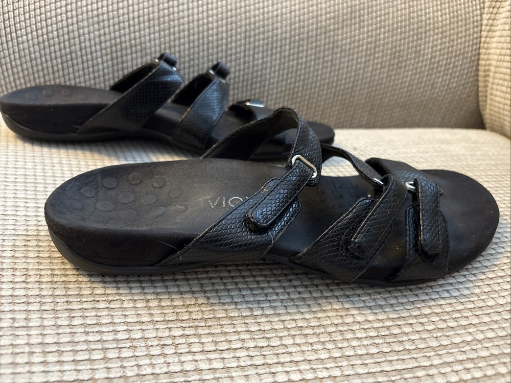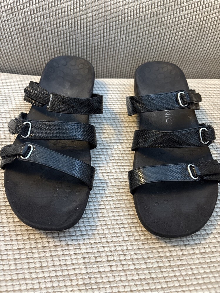 These Vionic women's sandals in black feature a slip-on style with three adjustable straps for a secure and comfortable fit. With a flat heel and a snakeskin pattern accent, these sandals are perfect for casual occasions during the summer and spring seasons. The model, Aubry, is designed with a lightweight and comfortable construction, making them an ideal choice for everyday wear. The sandals are a size 10 in US, 8 in UK, and 42 in EU, with a medium width.