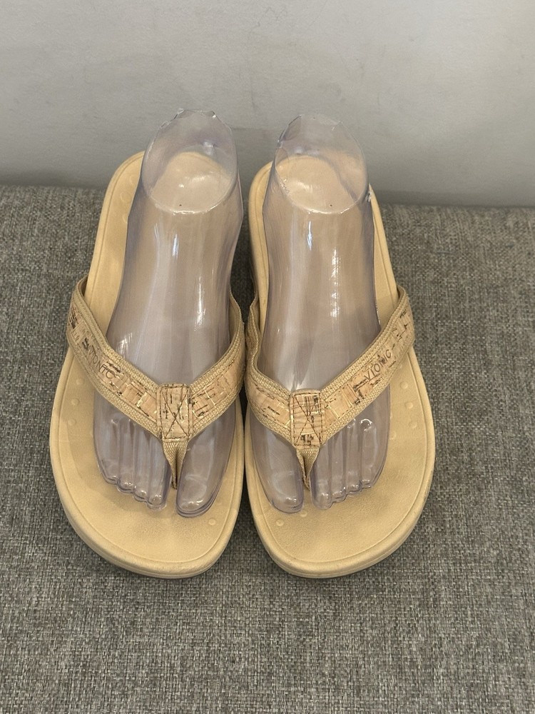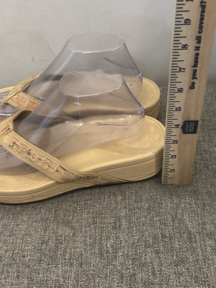 The Vionic Women's High Tide platform sandals in tan cork color size 10 are stylish and comfortable sandals for women. These slip-on sandals feature a mid-height wedge heel and a solid brown color with a thong style design. With arch support and orthopedic features, these sandals are designed for comfort and provide a trendy logo accent. The synthetic upper material and flop character make them a great choice for everyday wear, perfect for women who want both fashion and functionality in their footwear. Preowned Good Condition