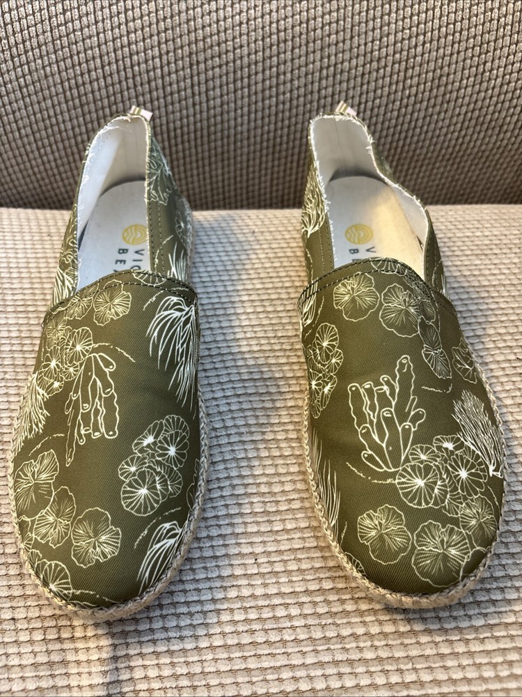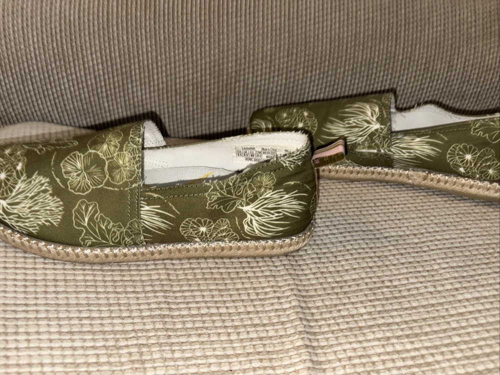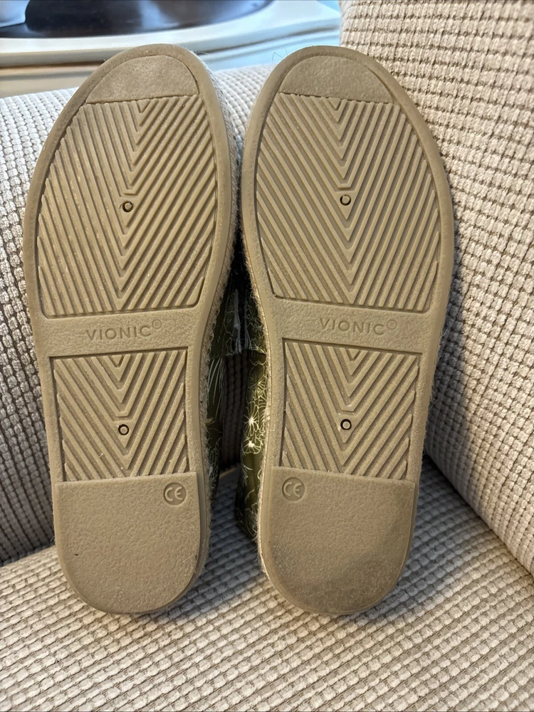 The Vionic Beach Women's Laguna Seaweed Green Slip-On Espadrilles in size 8.5 W are comfortable and lightweight flats perfect for travel or casual wear. These round toe shoes feature a multicolor floral pattern on canvas fabric with a rubber outsole for durability. With a slip-on style and W shoe width, they offer a classic look and are designed for comfort with a synthetic insole. Ideal for summer, fall, and spring seasons, these Vionic flats add a touch of style to any outfit.