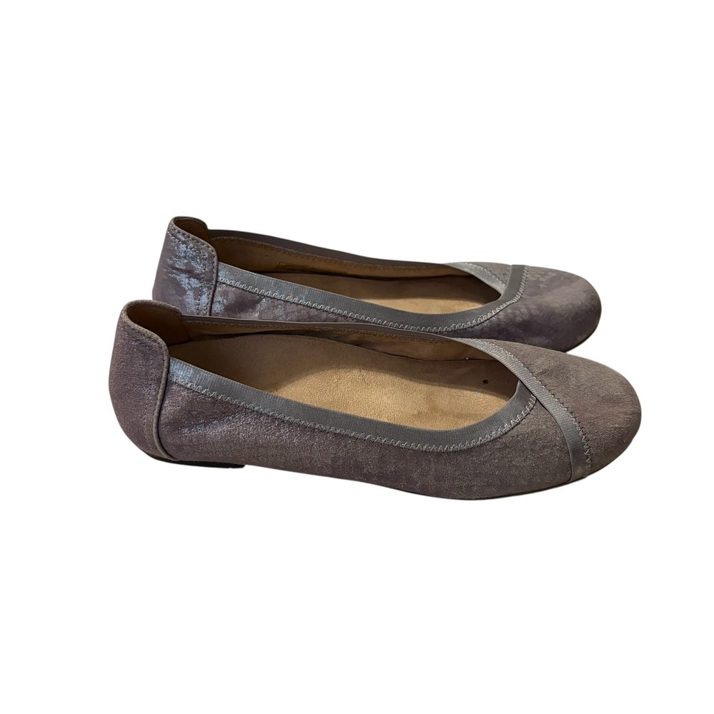 The Vionic Women’s Spark Caroll Pewter Leather Ballet Flats in size 7 are stylish and comfortable slip-on shoes perfect for everyday wear. With a solid silver color, round toe shape, and wide shoe width, these flats offer excellent arch support and cushioning, making them ideal for all-day comfort. The ballet style design with a city and preppy theme adds a touch of sophistication to any outfit, while the leather material ensures durability and quality. Perfect for the summer, fall, and spring seasons, these Vionic flats are a must-have for any fashion-forward woman's shoe collection.