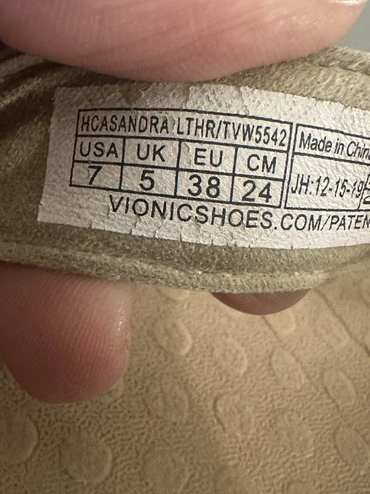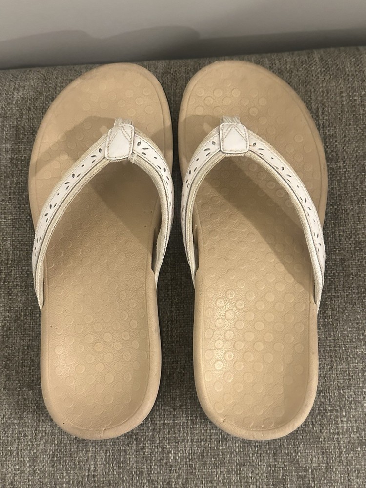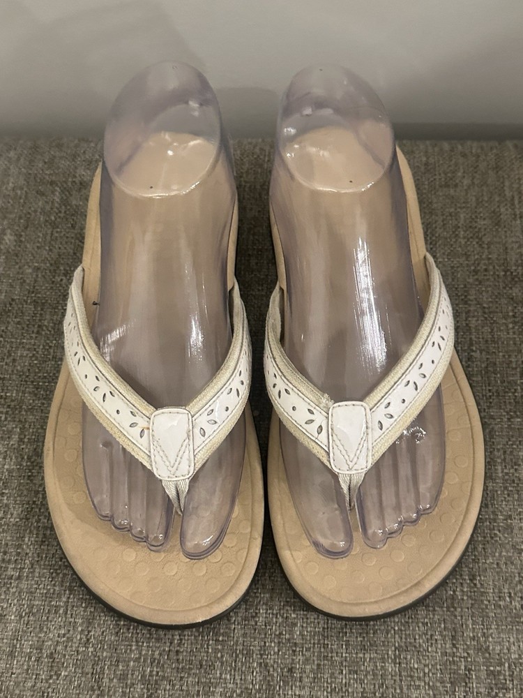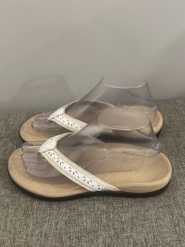 Type: Sandal AU Shoe Size: 7 Customized: No Closure: Slip On Country of Origin: China Character: Flop Features: Arch Support, Comfort US Shoe Size: 7 EU Shoe Size: 38 Color: White Brand: Vionic Accents: Logo Heel Style: Flat Department: Women Upper Material: Leather UK Shoe Size: 5 Pattern: Solid Vintage: No Style: Thong Heel Height: Low (1-1.9 in)