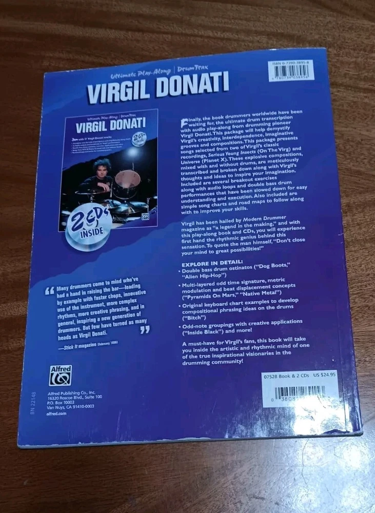 This music book and accompanying CDs are the ultimate play-along for drummers. Featuring the work of Virgil Donati, a renowned musician in the field of drumming, this set is perfect for those interested in contemporary musical genres like musicals. Produced in the United States, this set is a must-have for drummers looking to improve their skills and expand their repertoire. The book includes sheet music for a variety of songs, while the CDs provide accompanying tracks to play along with. Don't miss out on this incredible opportunity to learn and grow as a drummer with one of the best in the business.Being sold in as is stated condition with no returns or refunds.If you have any questions please ask me,thank you.