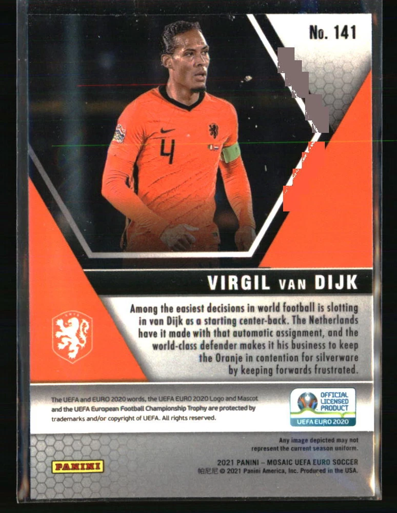 Season: 2021 Manufacturer: Panini Team: Netherlands Graded: No Autographed: No Year Manufactured: 2021 Set: 2021 Panini Mosaic UEFA EURO 2020 Sport: SOCCER Player|Athlete: Virgil van Dijk Card Number: 141 Type: Sports Trading Card