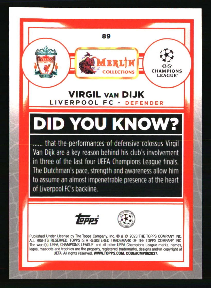 Year Manufactured: 2022 Season: 2023 Type: Sports Trading Card Graded: No Team: Liverpool Sport: SOCCER Autographed: No Set: 2022-23 Merlin Chrome UEFA Club Competitions Card Number: 89 Player|Athlete: Virgil van Dijk