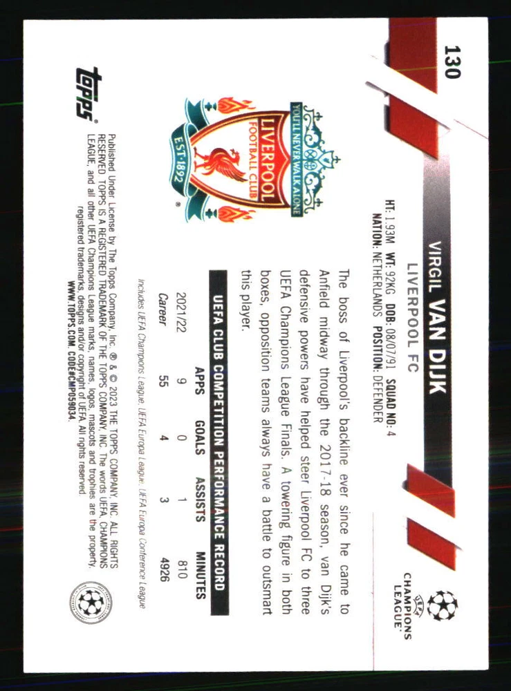 Manufacturer: Topps Year Manufactured: 2022 Player|Athlete: Virgil van Dijk Season: 2022 Card Number: 130 Type: Sports Trading Card Set: 2022-23 Topps UEFA Club Competitions 1st Edition Graded: No Sport: SOCCER Team: Liverpool FC Autographed: No
