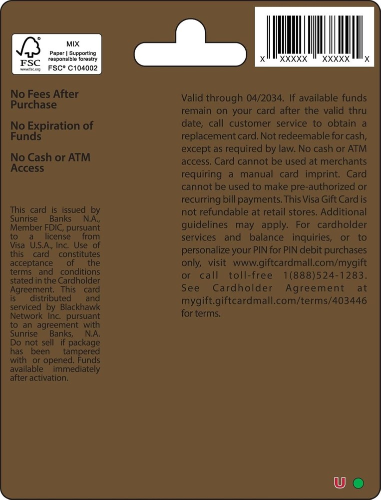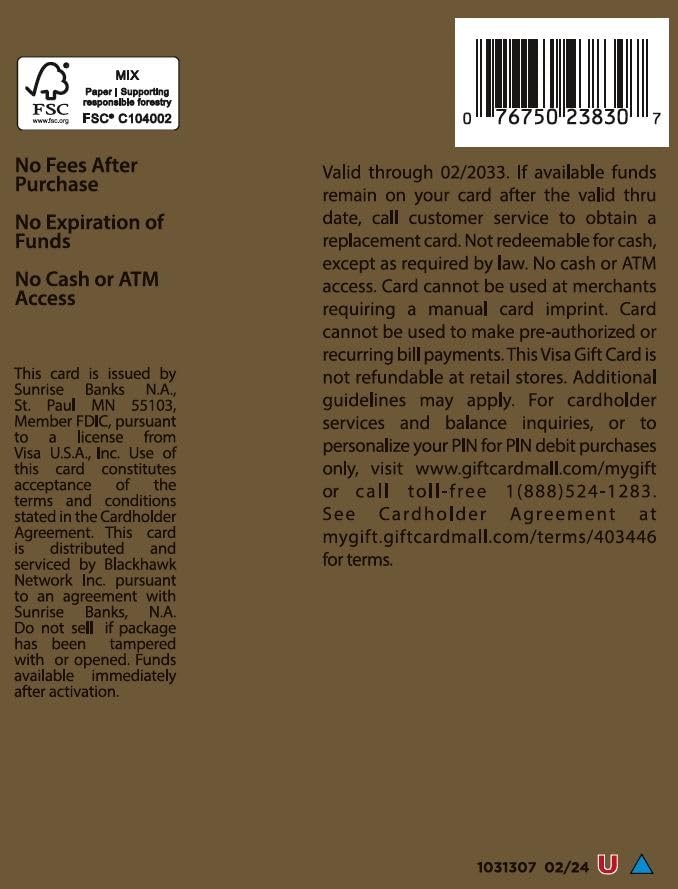 This card is non-reloadable. No cash or ATM access. Cards are shipped active and ready for use. Funds do not expire. If available funds remain on your card after the valid thru date has passed, please call customer service for a replacement card. A one-time purchase fee applies at the time of checkout. No fees after purchase. To protect the money loaded to this card, the gift card recipient should register with Visa. To register your card, view FAQ’s, or find more information about your Visa gift card, please visit mygift.giftcardmall.com. This item is not eligible for refund, resale, or return. Available for sale within the United States only (not available to Puerto Rico residents). Additional shipping restrictions apply to Hawaii, Kansas, New Mexico, South Dakota, US Virgin Islands, Vermont, and West Virginia. Do not provide any gift card details (example: claim code) to someone you do not know or trust. There are a variety of scams in which fraudsters try to trick others into paying with gift cards. Double check the URL before entering card details online. We want to make sure our customers are aware of potential scams that may involve asking for payment using gift cards. Be Informed by clicking on the link below to learn more Designs may vary. For additional information on the Cardholder Agreement and Bank Disclosures please see Certificate of Compliance in the product page.