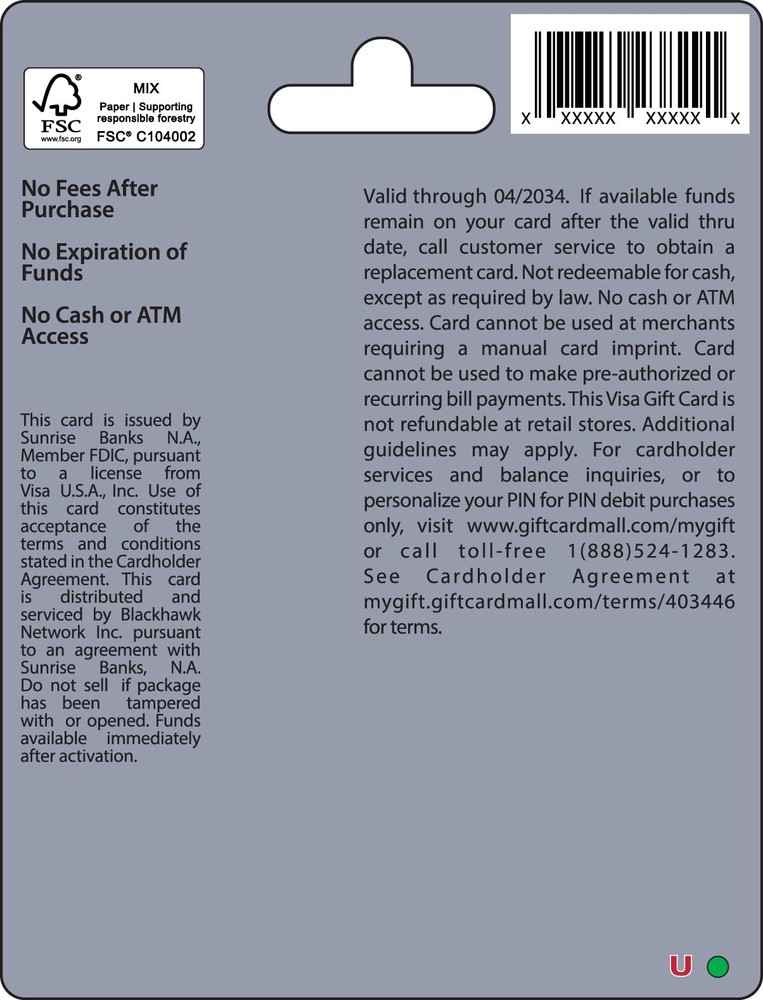 Visa $50 Gift Card (plus $4.95 Purchase Fee) Product Details This card is non-reloadable. No cash or ATM access. Cards are shipped active and ready for use. Funds do not expire. If available funds remain on your card after the valid thru date has passed, please call customer service for a replacement card. A one-time purchase fee applies at the time of checkout. No fees after purchase. To protect the money loaded to this card, the gift card recipient should register with Visa. To register your card, view FAQ’s, or find more information about your Visa gift card, please visit mygift.giftcardmall.com. This item is not eligible for refund, resale, or return. Available for sale within the United States only (not available to Puerto Rico residents). Additional shipping restrictions apply to Hawaii, Kansas, New Mexico, South Dakota, US Virgin Islands, Vermont, and West Virginia. Do not provide any gift card details (example: claim code) to someone you do not know or trust. There are a variety of scams in which fraudsters try to trick others into paying with gift cards. Double check the URL before entering card details online. We want to make sure our customers are aware of potential scams that may involve asking for payment using gift cards. Be Informed by clicking on the link below to learn more Designs may vary. For additional information on the Cardholder Agreement and Bank Disclosures please see Certificate of Compliance in the product page Experience the convenience of gifting with our Visa $50 Gift Card. This non-reloadable card offers instant access to funds, with no cash or ATM withdrawal options. Perfect for any occasion, it comes with a one-time purchase fee of $4.95. Cards are shipped active and ready to use, with funds that never expire. For added security, we recommend registering the card with Visa. Due to shipping restrictions, it may not be available in certain states and territories. To ensure your safety, we advise against sharing gift card details with unknown parties. The card's design may vary.