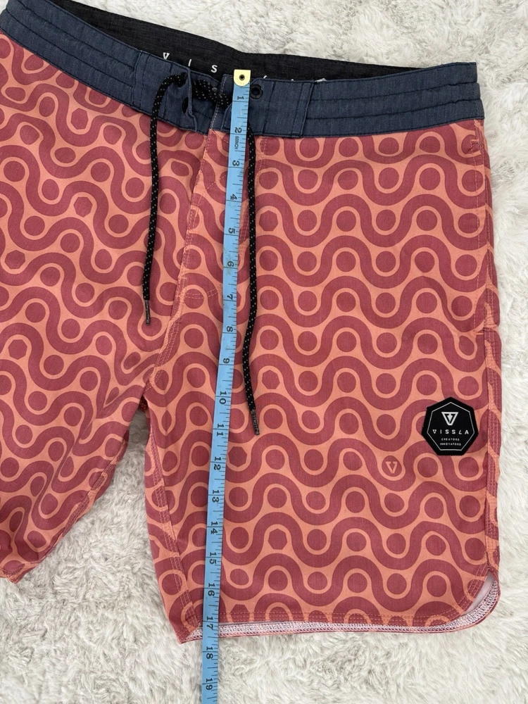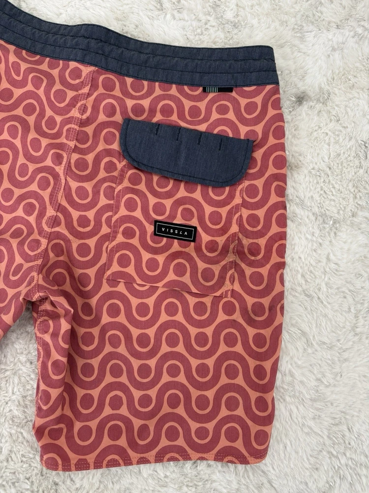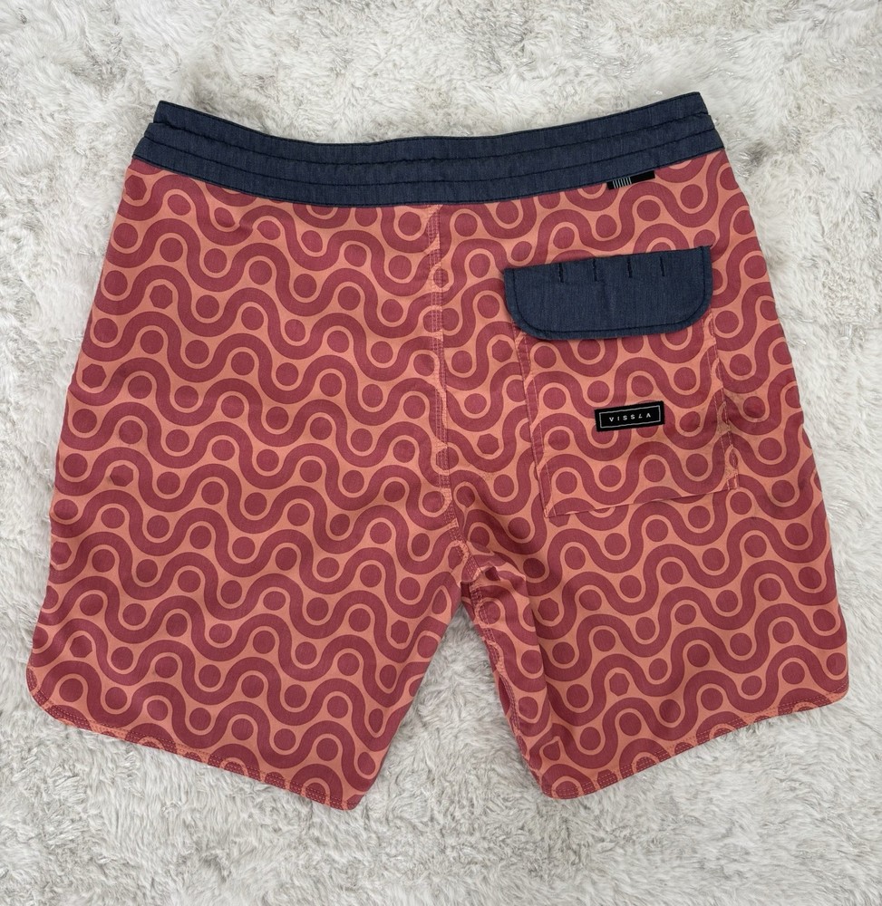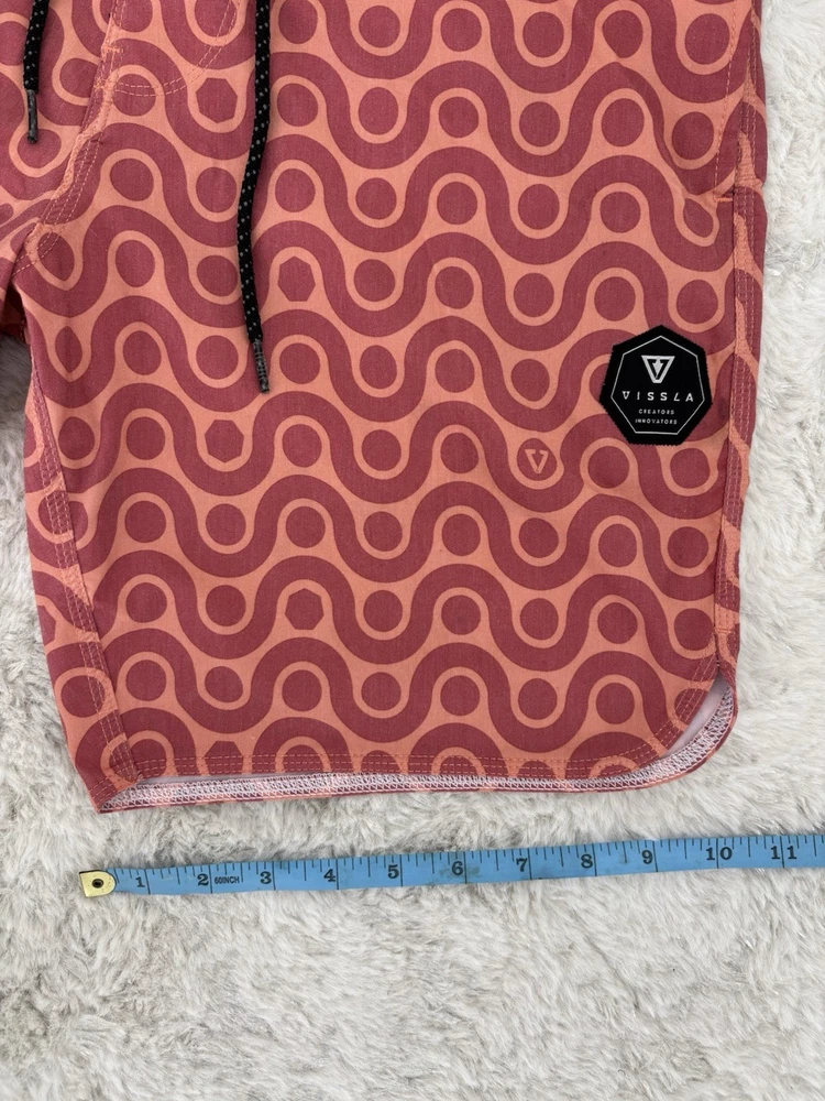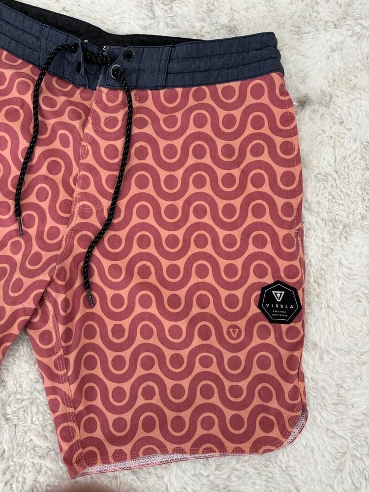 Vissla men’s boardshorts, size 30. Great-looking orange patterned surf/board shorts with stretch fabric and quick-dry material. Features drawstring waist and rear pocket with flap closure. Condition: Good pre-owned condition with normal light wear from use. No holes or major flaws. Details: • Brand: Vissla • Size: 30 • Color: Orange with geometric pattern • Material: Coconut poly-cotton stretch blend • Quick-dry fabric • Back pocket with closure