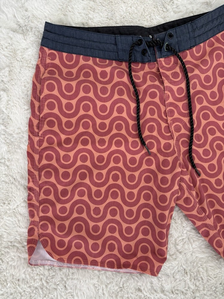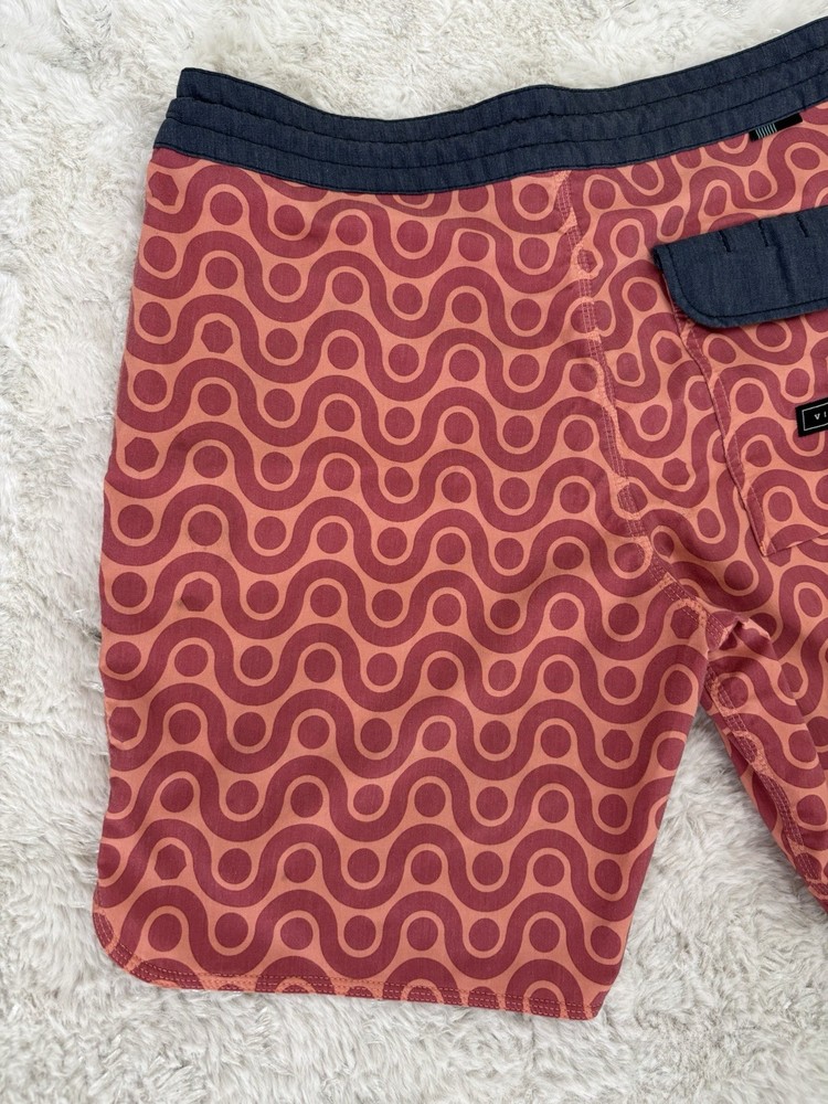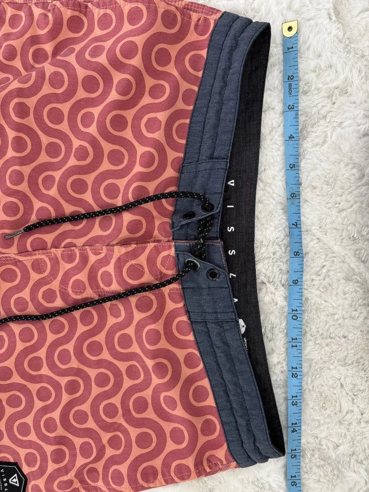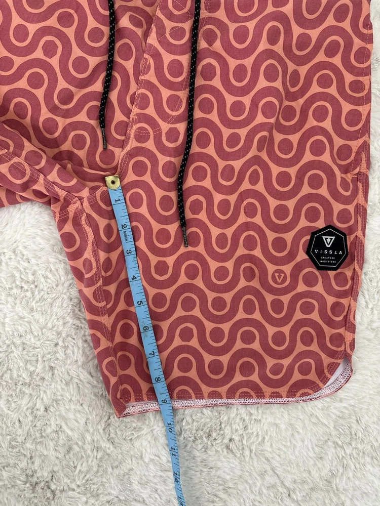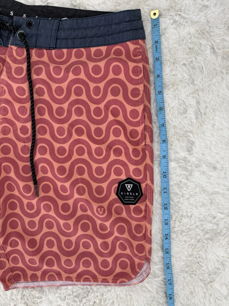 Vissla men’s boardshorts, size 30. Great-looking orange patterned surf/board shorts with stretch fabric and quick-dry material. Features drawstring waist and rear pocket with flap closure. Condition: Good pre-owned condition with normal light wear from use. No holes or major flaws. Details: • Brand: Vissla • Size: 30 • Color: Orange with geometric pattern • Material: Coconut poly-cotton stretch blend • Quick-dry fabric • Back pocket with closure