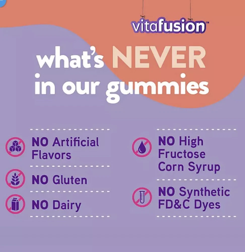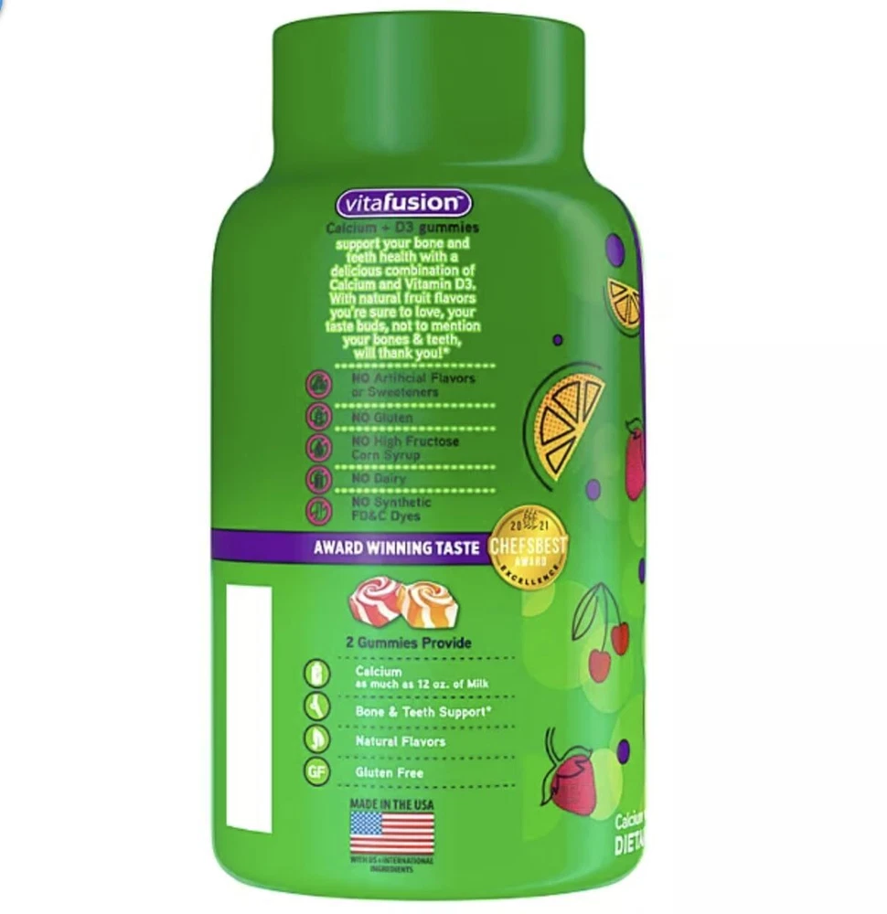 Vitafusion Calcium + D3 Gummies (200 Count) Indulge in a delicious calcium treat. A fusion of essential nutrients and natural fruit and cream flavors, two Vitafusion Calcium Gummies provide an excellent source of vitamin D and calcium for bones and joints. Each serving supports bone health in the form of a gummy500mg of calcium plus 25mcg (1,000 IU) of vitamin D. Each serving has as much calcium as two 6-oz. glasses of milk. At vitafusion, we believe taste and nutrition can be fused together to deliver the best vitamin experience, ensuring its an easy and delicious part of your day. For more than 12 years, weve been helping people to live happy and healthy lives with our gummy vitamins and supplements. Vitafusion is the only gummy vitamin brand with products that have been awarded the ChefsBest Excellence Award for taste. Features Outstanding source of vitamin D3 and calcium Supports bone and tooth health Easy and convenient to use Natural fruit and cream flavors Fast and Free Shipping You're already purchasing the item. Why pay additional for shipping, especially slow shipping? We get your order shipped out within 1-business day and delivered to your doorstep as quickly as possible. Competitive Pricing With our dynamic pricing model, our prices are always competitive. Our prices are some of the lowest that you will find on the internet. Rest assured that you're getting a good deal when purchasing with us. 30-day Money Back Guarantee We are committed to making sure that you leave this transaction satisfied. If you're unhappy with the product for any reason, you may return it back for your money-back or a replacement within 30 days. No questions asked!