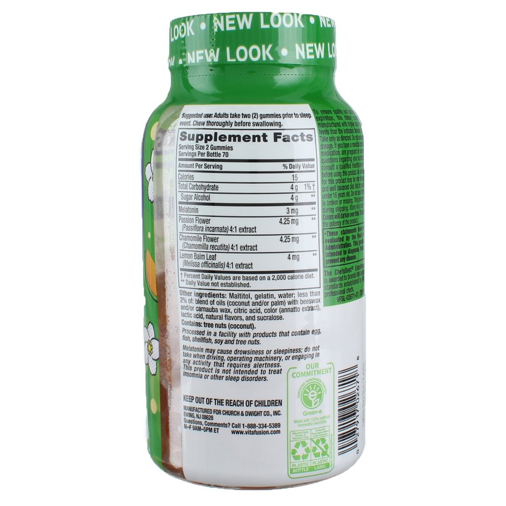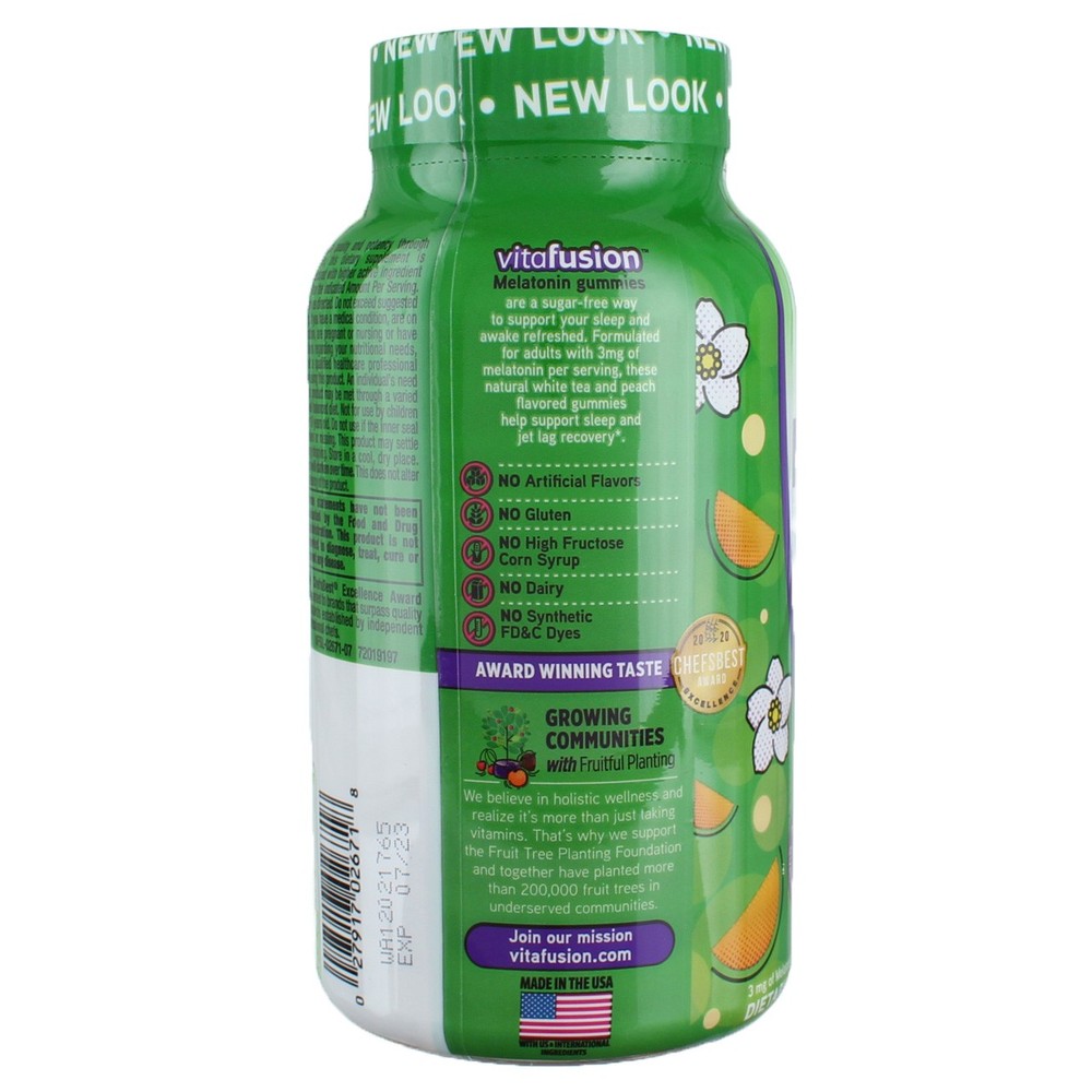 4 Pack Vitafusion Gummy Vites Melatonin, Natural White Tea & Peach, 3 mg, 140 Ct Product Description Vitafusion‚Ñ¢ Melatonin Sugar Free. Made with natural white tea with passion fruit flavors. 2 Gummies provide awake refreshed, help with jet lag. #1 Gummy vitamin brand, sleep support gummies. Free from gluten. Ingredients Other: Maltitol, Water, Gelatin; Less than 2% of: Beeswax, Citric Acid, Color (Annatto Extract), Fractionated Coconut Oil, Lactic Acid, Natural Flavors, and Sucralose. Allergens Contains tree nuts (coconut). Processed in a facility with products that contain egg, fish, shellfish, soy and tree nut. Suggested Use Suggested Use: Take two (2) gummy supplements prior to sleep event. Chew thoroughly before swallowing. Warnings Melatonin may cause drowsiness or sleepiness; do not take when driving, operating machinery, or engaging in any activity that requires alertness. This product is not intended to treat insomnia or other sleep disorders. Take only as directed. Do not exceed suggested dosage. If you have a medical condition, are on medication, or are pregnant or nursing, please seek the advice of a qualified health care professional before using. Not for use by children under 16 years old. Do not use if inner seal is broken or missing. This product may settle during shipping. Do not expose to excessive heat or moisture. Colors will darken over time. This does not alter the potency of the product. Keep out of reach of children. Disclaimer The product descriptions and instructions provided by vitabox.com are for informational purposes only and are qualified in their entirety by the information available from manufacturers of the products. You should carefully read all product packaging, and contact the manufacturer with any questions before using a product. While we endeavor to ensure that product descriptions are current, manufacturers sometimes change their products. We are not liable for inaccuracies or misstatements about products. We do not provide medical advice or recommendations. You should not use the information provided by vitabox.com for diagnosing or treating a health problem or disease. If you have or suspect that you have a medical problem, immediately contact your health care provider. Information and statements regarding dietary supplements have not been evaluated by the Food and Drug Administration or any other government agency and are not intended to diagnose, treat, cure, or prevent any disease.