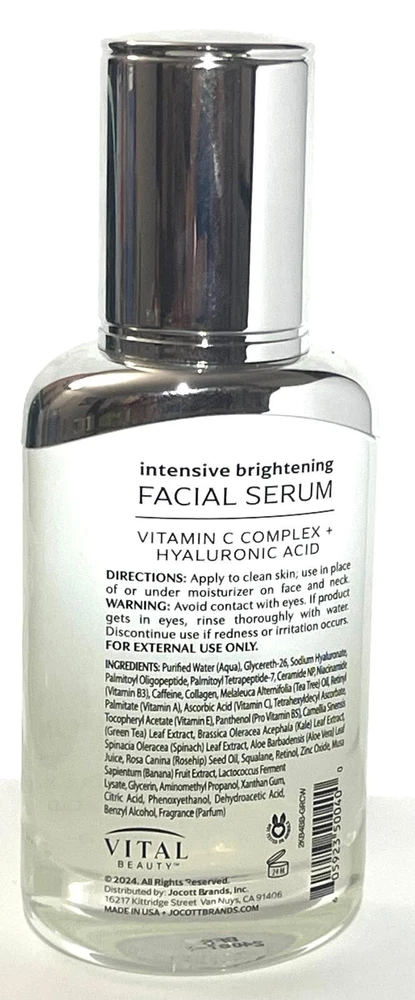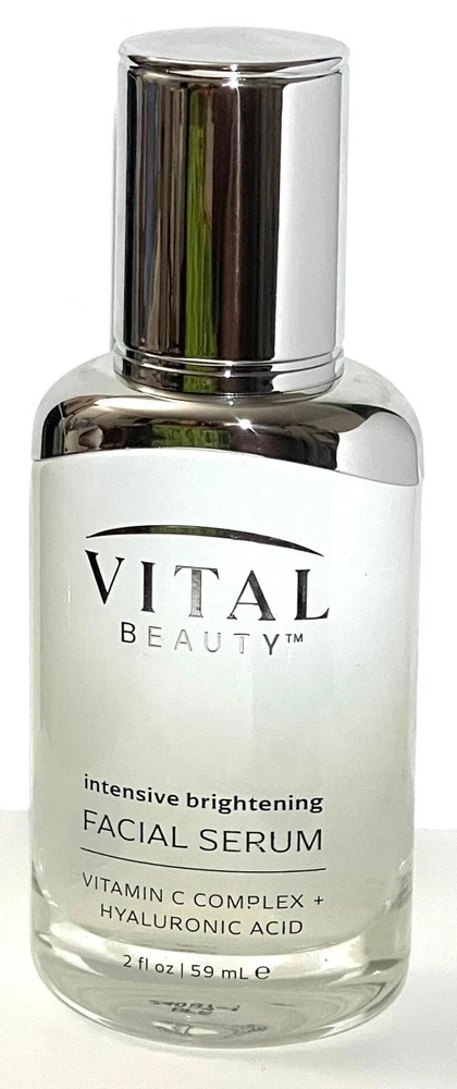 Vital Beauty Intensive Brightening Facial Serum with/ Vitamin C complex + Hyaluronic Acid Contain: Vitamin B3, Vitamin A, Vitamin E, Green Tea leaf extract, Kale leaf extract, Spinach leaf extract, Aloe Vera, Banana fruit extract. Suero facial iluminador intensivo Vital Beauty con complejo de vitamina C y ácido hialurónico Contiene: vitamina B3, vitamina A, vitamina E, extracto de hoja de té verde, extracto de hoja de col rizada, extracto de hoja de espinaca, aloe vera y extracto de fruto de plátano. Free and fast shipping in town