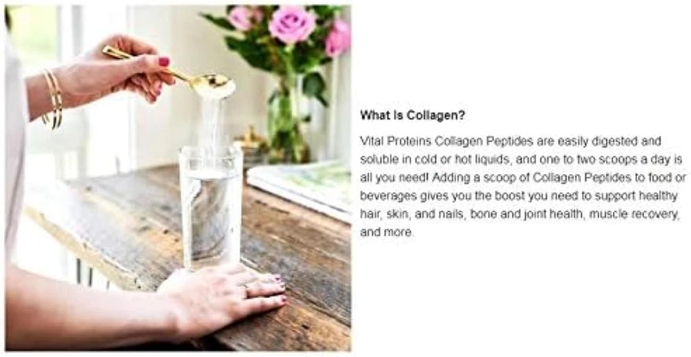 Vital Proteins Natural Whole Nutrition Collagen 34 Servings (Pack of 1) Product Details Product Dimensions : 5 x 5 x 7 inches; 1.5 Pounds Item model number : 00866 Manufacturer : Vital Proteins Brand: Vital Proteins Flavor: Unflavored Primary Supplement Type: Vitamin C Unit Count: 24.0 Ounce Item Form: Powder Item Weight: 1.5 Pounds Item dimensions L x W x H: 5 x 5 x 7 inches Special Ingredients: Collagen Diet Type: Paleo, Gluten Free, Kosher Product Benefits: Nourishing Bioavailable: Digested and absorbed by the body quickly for maximum benefits Beneficial: Helps improve hair, skin, nails, joints and ligaments, and tendon health asy to Use: Soluble in hot or cold liquids, including coffee, smoothies, and baked goods Many Uses: Stir into water, fruit juice, or other beverages, Add to smoothies as protein booster or mix with oatmeal, soups, or sauces Dairy Free , Gluten Free, Low Carb, Kosher Collagen Peptides are neutral in flavor and are great for adding to water, coffee, smoothies, recipes, and more. Our Collagen Peptides are easily digestible, mix in hot or cold liquids, and can be taken any time of day. 20g Collagen per serving. Paleo + Keto Friendly. Grass fed + pasture Raised.