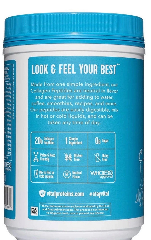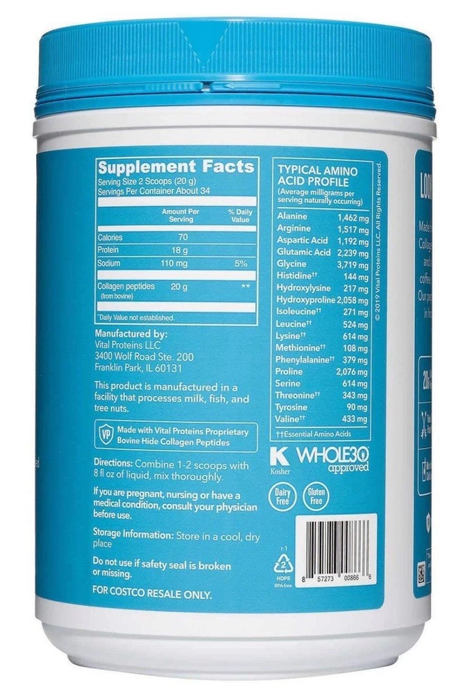 🧪 Ingredients & Nutrition Facts Main Ingredients : Grass-fed bovine hide collagen peptides (hydrolyzed) — no fillers or artificial additives Per Serving (20g / ~4 Tbsp) : Calories : ~70 kcal Protein : ~18–20 g collagen peptides Sodium : ~110 mg Typical Amino Acid Profile (per 20 g): Glycine ~3,700 mg, Proline ~2,076 mg, Hydroxyproline ~2,058 mg, Arginine ~1,517 mg, plus other standard amino acids (leucine, isoleucine, etc.) . No Sugar, Dairy, Gluten , and 0 g Total Carbs/Fat 🌿 Additives & Enhancements (Original Formula) Includes hylauronic acid (80 mg) and vitamin C (100 % DV) to support collagen production, skin hydration, and antioxidant health 🔄 Serving & Use Instructions Suggested usage : 1–2 scoops (≈10–20g) daily; container removal of scoop encourages tablespoon measurement — max 2–4 Tbsp per day (~50 mL). Mixes easily in hot or cold beverages, smoothies, oatmeal, and baked goods Packaging updates : New eco-friendly design — scoop removed to reduce plastic; dissolves best in warm/liquid to prevent clumping in cool drinks 🛡️ Quality & Safety Manufacturing : Produced in a facility that also processes milk, fish, tree nuts, wheatgrass, and peanuts — not recommended for individuals with severe allergies Kosher, Paleo, Keto, Whole30 approved , grass-fed and pasture-raised sourcing . Heavy metals : Independent Reddit user shares that testing showed no detectable metals except trace arsenic well below Prop 65 limits, and Vital Proteins states they batch-test for contaminants ⚠️ User Experience Notes (Community Feedback) Solubility : Some report “odd smell/taste” or poor dispersal, especially in cold drinks — recommended stirring or using warm liquid . Digestive effects : Rare cases of bloating, nausea, or joint pain in sensitive individuals Serving size confusion : Scoopless jars now measure by tablespoons; maximum daily intake advised but basic usage still 10–20 g/day 📏 Item Specifics (Dimensions & Shipping Info) Container Size : 24 oz (680 g), offering about 34 servings of 20 g each. Physical Dimensions : Approx. 5 × 5 × 7 inches; net weight ~1.75 lb (3.6 lb including packaging) . Origin : Made in the USA, from grass-fed, pasture-raised bovine hides Storage Recommendations : Keep sealed in a cool, dry place away from sunlight . Diet & Ranking : Gluten‑free, dairy‑free, sugar‑free, non‑GMO, BPA‑free with Whole30… ranked among top collagen powders by Vogue & Bon Appétit .