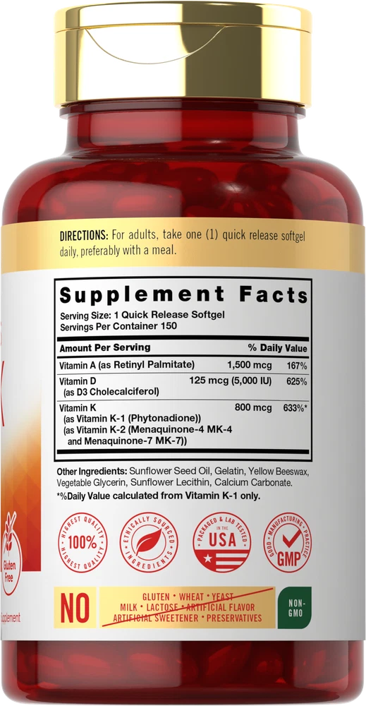 Type: Vitamin UPC: 840250402465 gtin13: 840250402465 Ingredients: Vitamin A, Vitamin D, Vitamin K Brand: Carlyle Formulation: Softgel