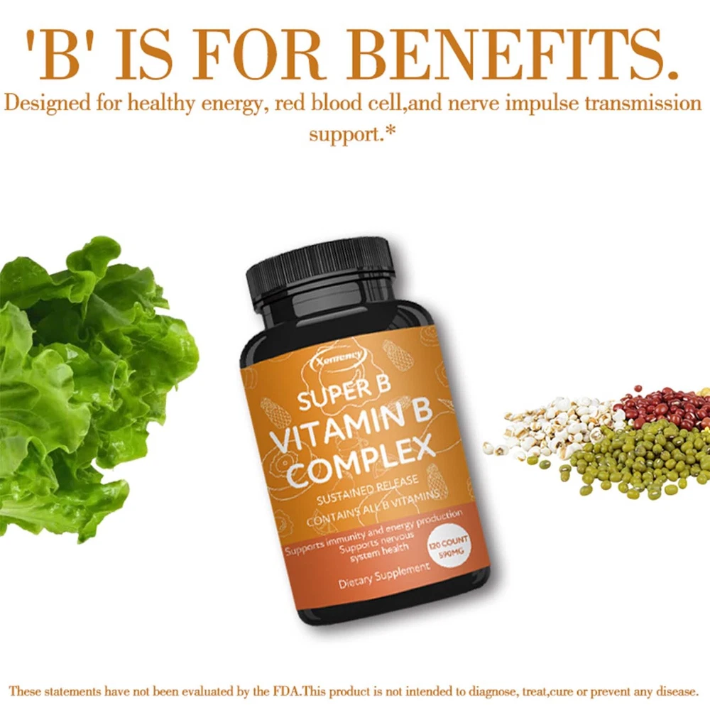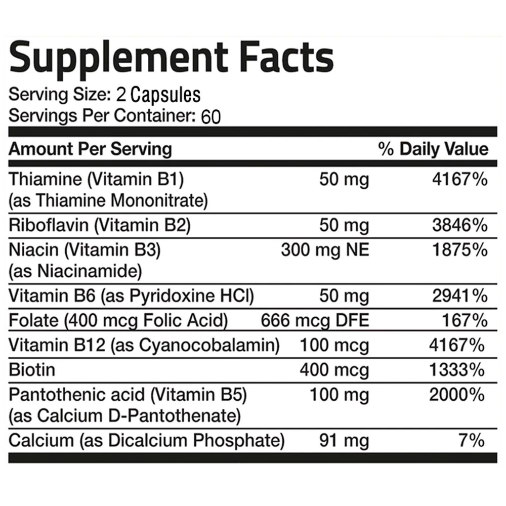Effects: Immune Support, Metabolism Ingredients: Vitamin B Complex Directions: Take 2 capsules once daily after a meal. Shipping: Ships within 48 hours on working days. Shelf life: 2 years Description: ENERGY SUPPORT: Our B-complex vitamin supplement promotes healthy energy production. EFFECTIVE SOURCE OF B-COMplex Vitamins: Our super-strength formula contains all the essential B vitamins. B vitamins are known for their real, long-lasting natural energy. Since the body cannot store B vitamins, make sure you get enough of them every day. Health Needs: Research shows that B vitamins help convert the food you eat into energy, powering many of the body's chemical reactions. B vitamins are also important for the proper functioning of the system. Our vitamin B complex capsules are designed to meet your unique needs. Document