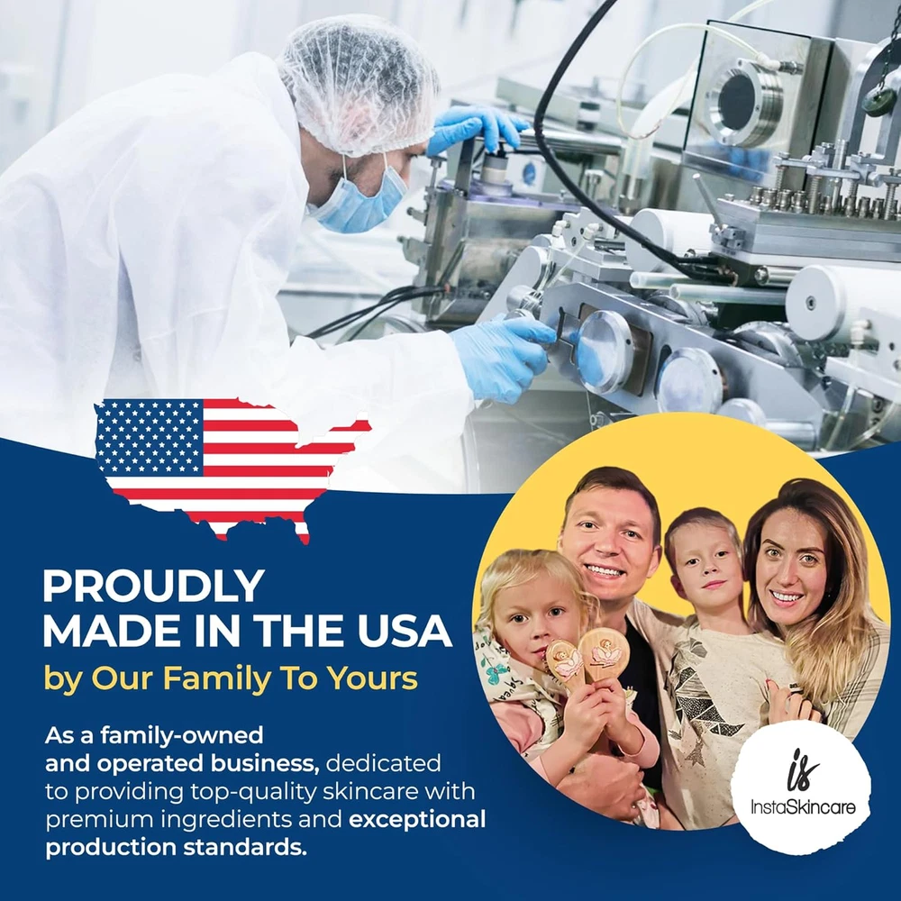 Gentle Skin Revitalization – InstaSkincare Vitamin C Serum for Face with Hyaluronic Acid is packed with antioxidants. Organic Vitamin C Serum evens skin tone, visibly reduces the appearance of discoloration & dull skin, promoting a healthy glow. Powerful Age-Defying Effect - Face Vitamin C Serum minimizes the appearance of fine lines & wrinkles by stimulating collagen production. Regular use of our skin serum visibly enhances skin health & appearance. Optimal Skin Health - Vitamin C serum for face can significantly treat & defend skin from further damage. Use in the morning before moisturizer to protect skin from the negative impact of sun, pollution & makeup. Natural & Safe Formula - Product safety & highest quality are our top priorities. Our Vitamin C face serum is made only from natural & high-quality ingredients: Vitamins C & E, Hyaluronic Acid & Aloe Vera. Safe even for the most sensitive skin! Proudly Made in the USA by a Family-owned and Operated business, dedicated to providing top-quality skincare with premium ingredients and exceptional production standards. Product Description