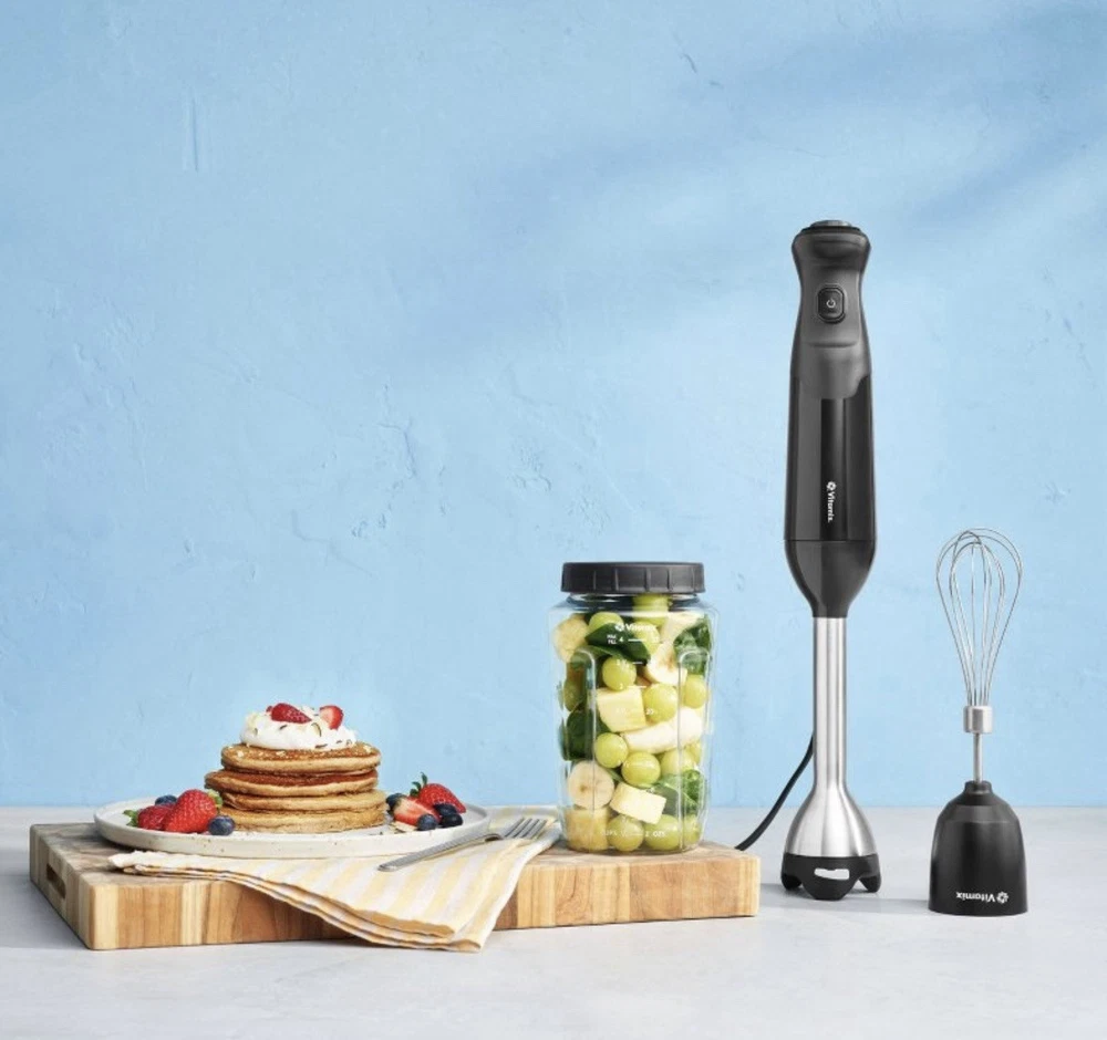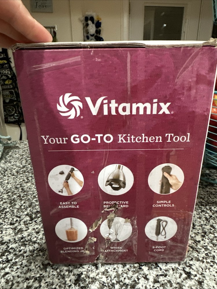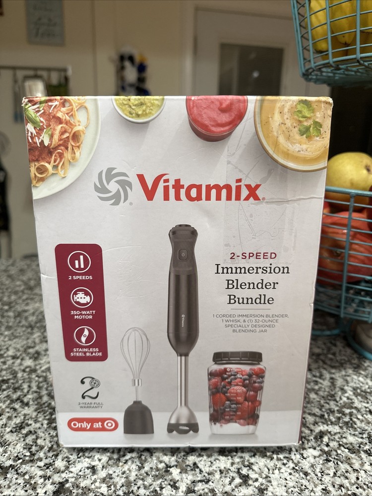 Vitamix 2-Speed Hand Immersion Blender Bundle with Whisk and Jar Black: Stainless Steel, 350W, Hand Held, Food Processor This is a New product. It sealed on top but i had to open on bottom just to make sure everything was right and complete. Durable Motor: The 350-watt motor blends everything from single-serving smoothies to sauces and soups. • Precise Textures: Two speeds and a two-pronged blade help you create ideal textures for every blend. • Unique Bell Guard: Our specially designed bell guard reduces suction and helps ingredients flow easily through the blades while protecting pots, pans, and your favorite blending containers from scratches. • Blend in Any Container: With our Immersion Blender, you can blend in any container with a 3-inch wide (or larger) opening, including a smoothie cup or a 1-quart wide-mouth Mason jar. • Cord for Convenience: The 2-Speed Immersion Blender has a five-foot cord for ease of use, so you can blend with dependable power. • Whisk Attachment: Quickly whip up aquafaba, batters, meringues, eggs, cream, and more. • 32-Ounce Blending Jar: Blend right in the cup, then take it on the go. The sides of the cup are designed just like a Vitamix blender container, so you'll get a Vitamix-quality blend every time. This easy-to-assemble hand-held blender offers Vitamix performance, two-speed control, a protective bell guard to prevent scratches, a blending jar, and whisk attachment – all at an affordable price. It’s covered by a two-year full warranty, so you’ll be creating healthy, delicious dishes for years to come.