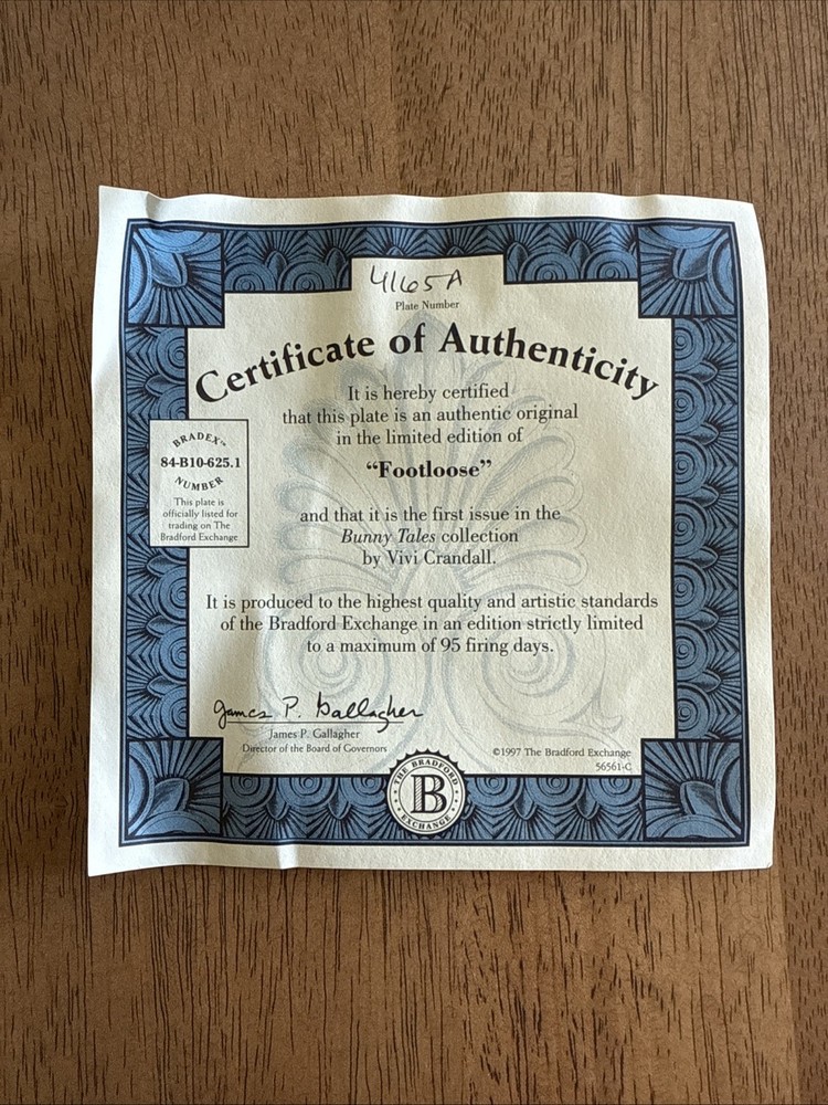 The Vivi Crandall Bunny Tales "Footloose" Collector Plate by Bradford Exchange features a charming woodland pattern with a round shape and multicolor design. Handmade of porcelain, this vintage collector plate from the late 20th century showcases a decorative style with a theme of wild animals. The art pottery production technique used by Bradford Exchange adds to the unique appeal of this collectible item, making it a delightful addition to any American culture-inspired collection.
