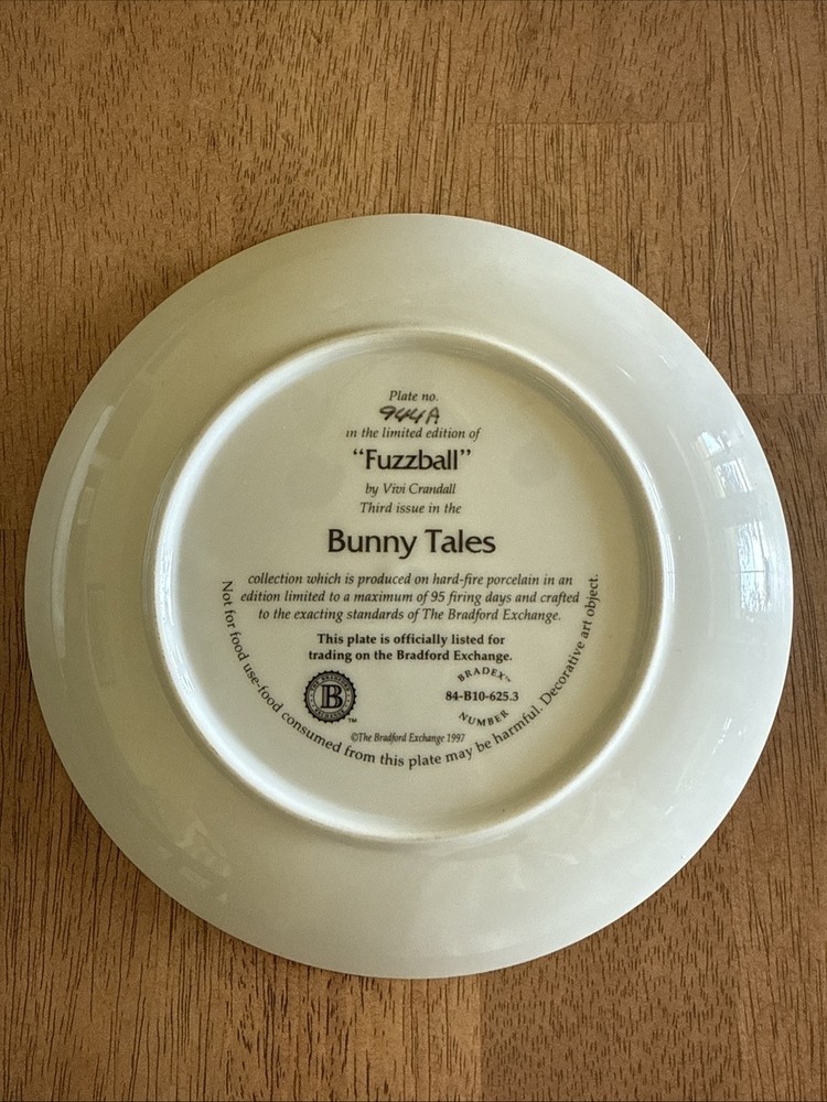 The Vivi Crandall Bunny Tales "Fuzzball" Collector Plate by Bradford Exchange is a vintage decorative piece featuring a charming woodland pattern with a bunny character. Made of porcelain with a multicolor design, this round 8-inch plate is handcrafted in the American style using art pottery techniques. Produced in the late 20th century, this collector's item is perfect for all occasions and adds a touch of whimsy to any collection or decor.