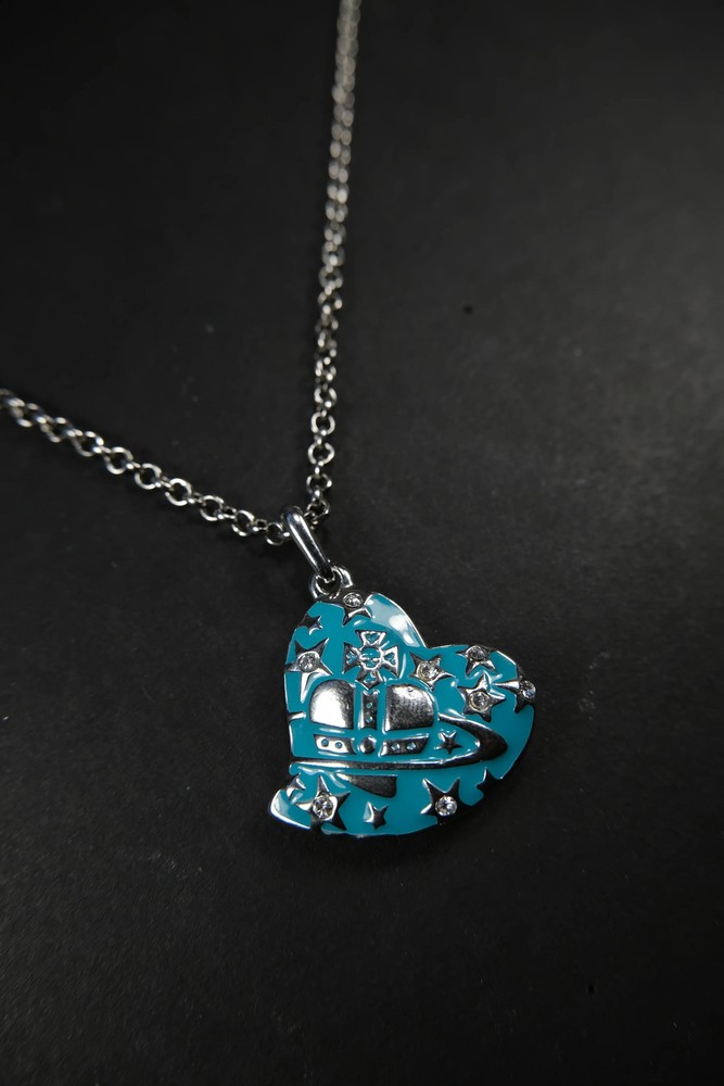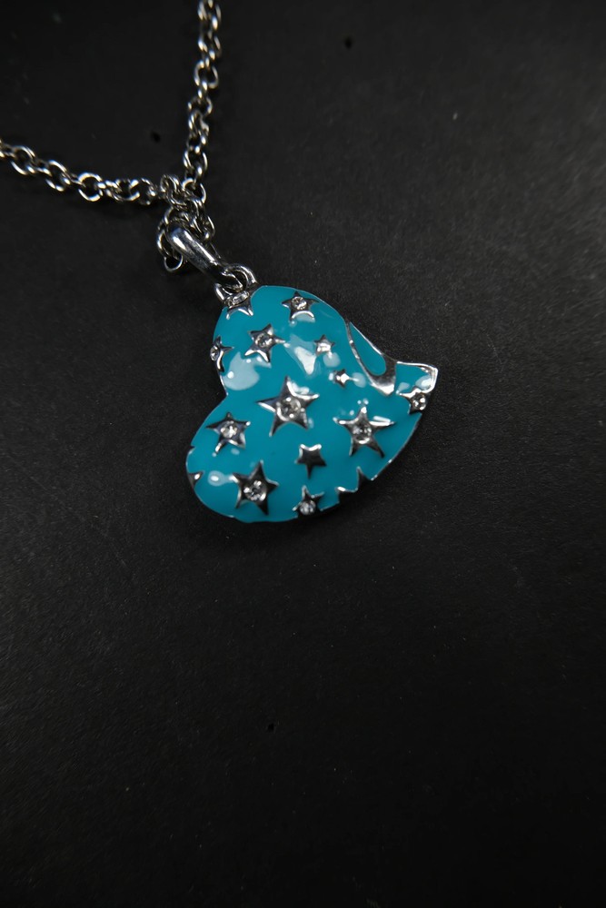 DETAILS Comes with original dust bag Material: Silver coated brass Condition: 9/10 general wear Details: Blue heart with Swarovski crystals MEASUREMENTS Chain Length Length: 17 inches Pendant size: 1.25 x 1.25 inches