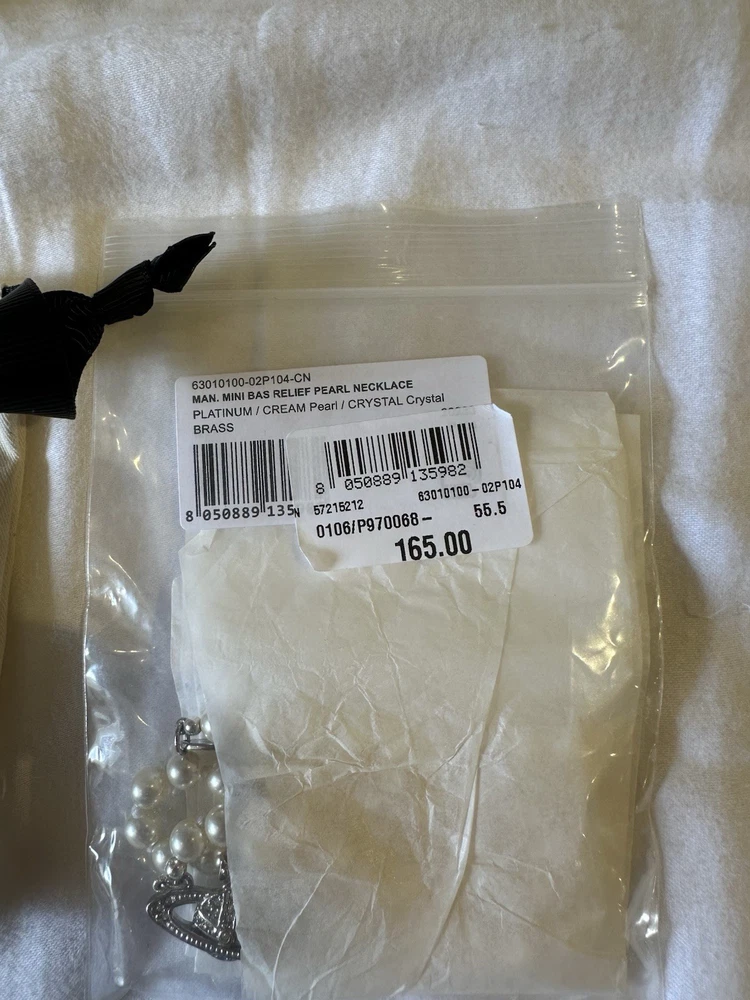 This Vivienne Westwood Silver Pearl Choker Necklace features an oval pendant with six round pearls, creating an elegant and stylish accessory. The necklace is crafted from silver with a ball/bead chain type, and has a length of 42cm. The design is perfect for adding a touch of luxury to any outfit, and is a timeless piece that can be worn for various occasions. Made in Japan, this necklace comes with a box, making it a perfect gift for someone who appreciates high-end fashion.