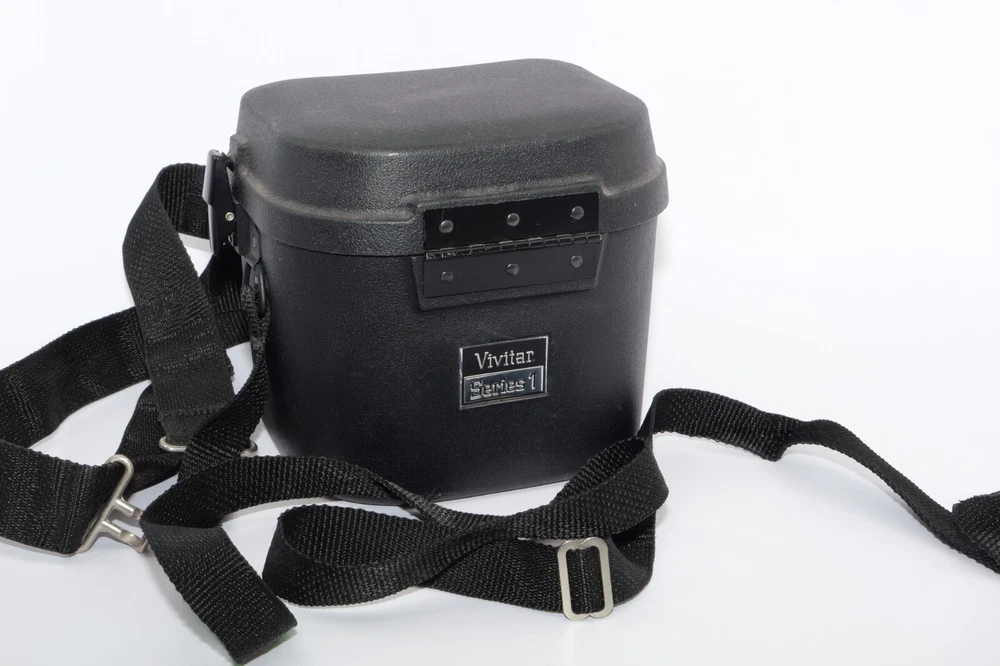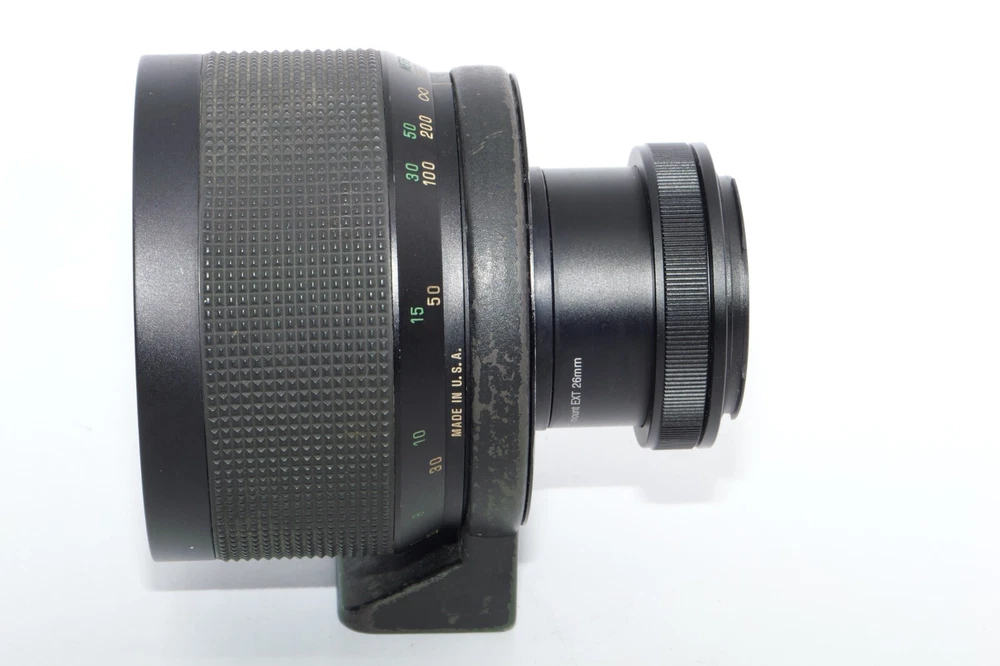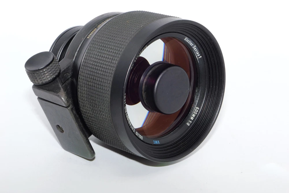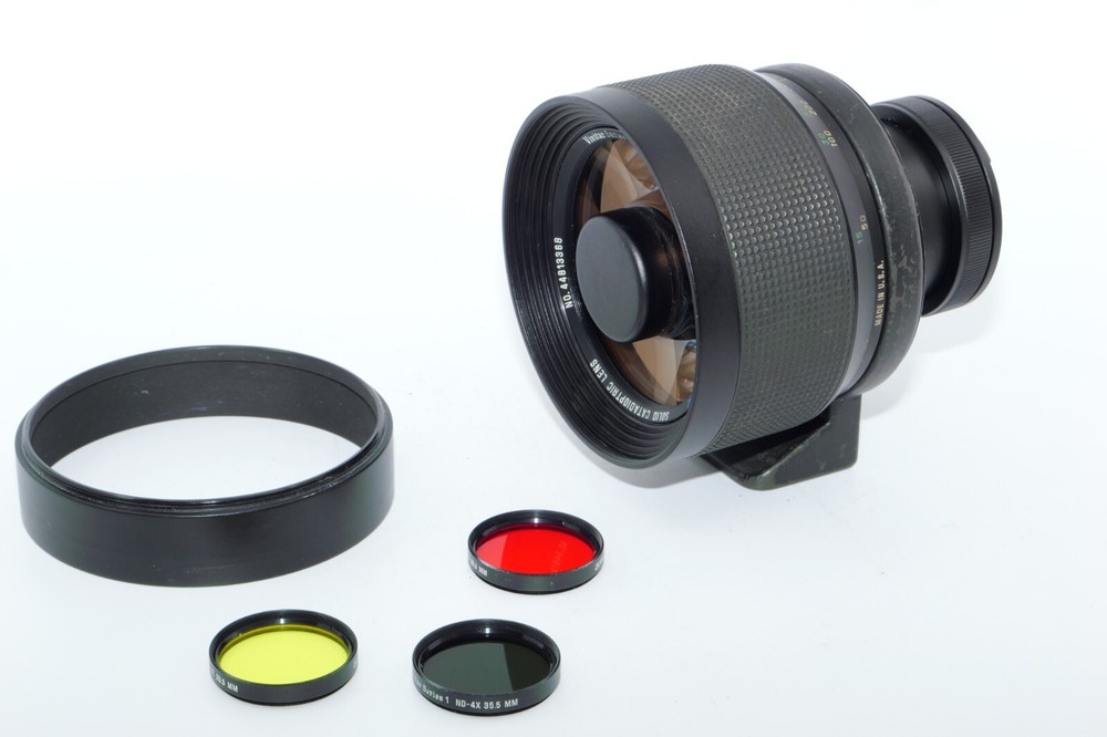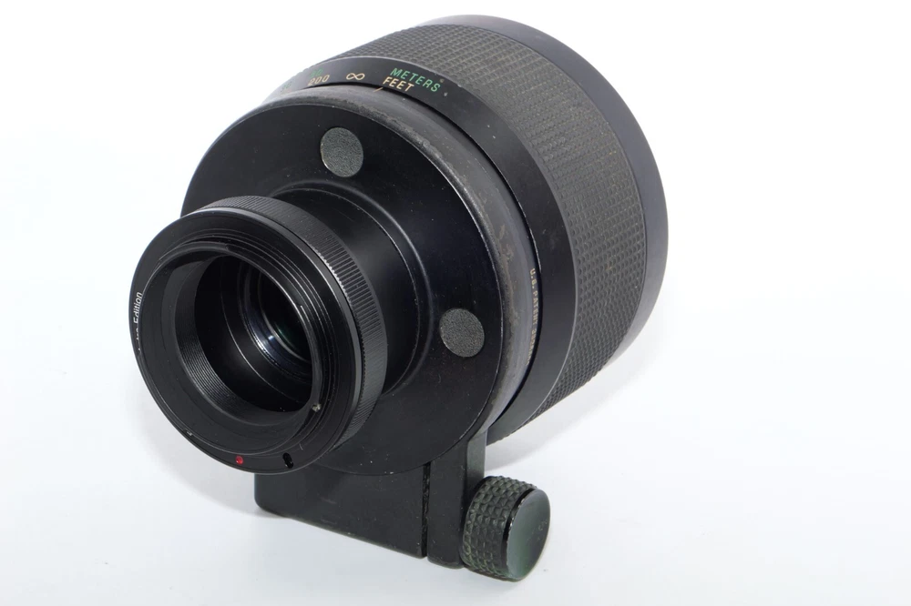Vivitar Series 1 Solid Catadioptric 600 mm f/ 8 MIRROR manual focus lens. Made in USA. Serial # 44813368. This lens will fit Canon R mount mirorless cameras with the included Fotodiox Canon R t-mount adapter. Lens will fit many 35mm manual focus cameras. This lens has a universal t-mount, and will fit most camera brands with the proper t-mount adapter. Also a great lens to use on most mirrorless digital cameras with the proper adapter. This is a unique mirror telephoto lens that has fixed f/8 lens aperture. Quality solid cat optics, and heavy duty build. Focusing with this lens is quick and easy. Uses 35.5mm rear mounted filters. This 600mm solid cat lens is only 5 inches tall when focused at infinity. Minimum focus distance is about 9 meters. Lens is Ex- or 7.5 of 10 cosmetic condition. No dings or dents. Clean glass. Clean mirror without any separations. Smooth focus. This very compact heavy duty lens is seldom seen lens and makes for a fantastic long telephoto lens for 35mm film cameras, dslr cameras, or digital mirrorless cameras with the correct adapter. Lens comes with case (some foam on the inside of the case is deteriorated from age), lens hood, rear 35.5mm UV, red, ND4X, and yellow filters, & new Canon R t-mount adapter, caps. Sells with NO RESERVE at price of $395 . I have more SLR lenses, Medium and Large Format cameras, lenses and accessories on my other auctions and E-Bay Store.