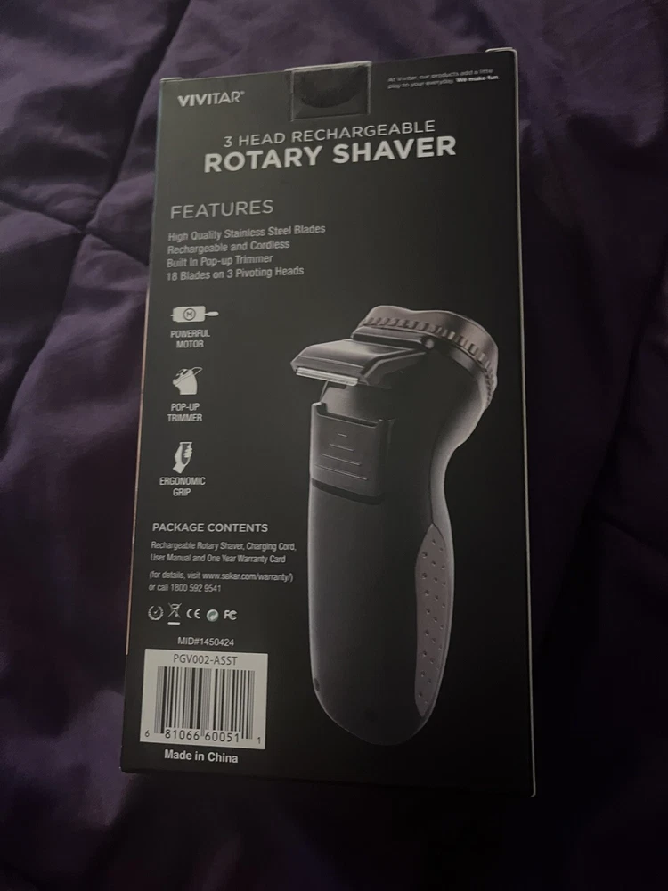 gtin13:681066600511Brand:VivitarMPN:PGV002ORGModel:Blades Rotary ShaverColor:BlackDepartment:MenMotor Type:RotaryFeatures:Rechargeable, pop up trimmer, ergomamic gripUPC:681066600511Number of Heads:3Type:Facial Shaver