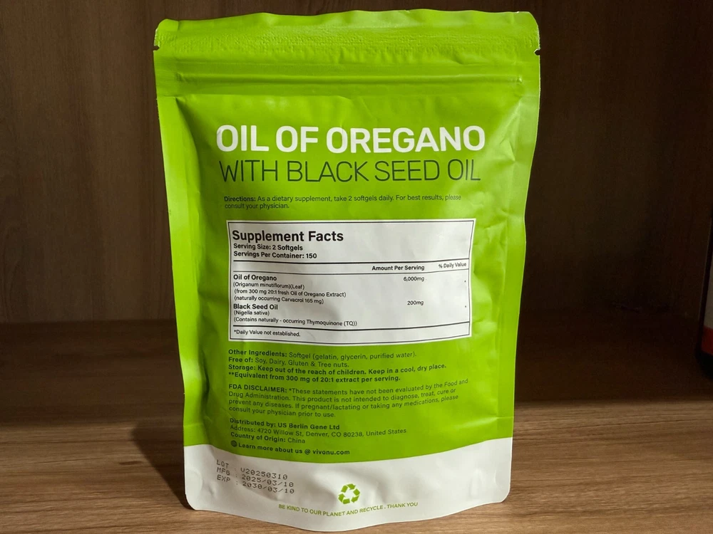 About this item [Oregano Oil Capsules Organic]Each serving of oil of oregano capsules contains oil of oregano with black seed oil. The main ingredients are a natural organic mixture of oil of oregano with black seed oil, including Carvacol and Thymoquinone,support digestive health and help maintain balance in the body contribute to overall wellness [Premium Oil of Oregano Softgels]Our Oregano Oil Softgels are natural, pure and carefully formulated, free of GMOs, soy, dairy, and gluten, unlike many other supplement capsules, ensuring the purity and safety of each capsule without harmful additives [Oregano Oil Extract]Elevate your wellness routine with our fresh Oil of Oregano and Black Seed Oil complex,harnessing the combined strengths of oregano oil and black seed oil to promote balance in the body, promote healthy digestion and respiratory function, potentially providing relief for related concerns.a premium quality supplement that promotes seasonal immune health and harnesses the power of nature's finest gifts [300 Pcs Per Bag]Oil of oregano capsules are easy to swallow, 2 capsules per day, very convenient.Each pack of vivonu oil of oregano with black seed oil contains 300 pills, far more than cheap products on the market, enough to support overall wellness for 150 days [Easy to Absorb]Elevate your health habits with our oregano oil capsules organic, from 20:1 fresh oregano oil extract, to enhance absorption and maximize its benefits(Note: if the capsules are stuck, please shake them slightly to separate, which will not affect product quality and use.Please contact us for any questions)