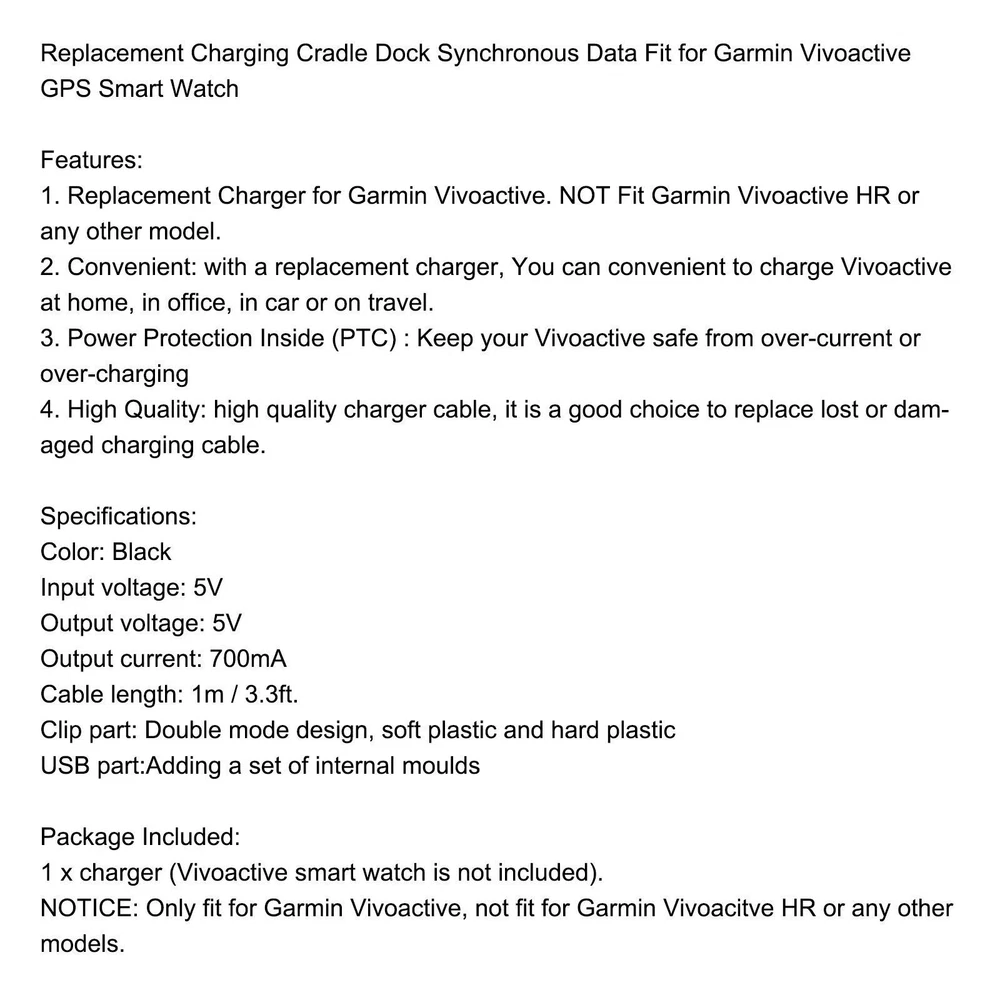 New Bottom Roller Fits Bobcat T190 T650 T320 T300H T200 T750 T300 T250H T550 245.87 USD Free shipping AFR-2000 1/4" Air Compressor Filter Water Separator Trap Tools W Regulator Gauge 14.79 USD Free shipping 250W MSD 8R Lamp Sharpy Beam Moving Head Replacement Bulb Stage Show Lighting 33.79 USD Free shipping Replacement PrintHead Print Head For Canon PRO-100 PRO 100 QY6-0084 USA 107.79 USD Free shipping Folding Back Up Iron Sight Flip Up Front Rear Set Picatinny Rail KAC300 20.87 USD Free shipping Widen Patient Chair Hydraulic Transferred Lift Wheelchair 180°Split Seat 799.99 USD Free shipping Throttle Positioner Switch 163-6710 For Caterpillar 312C 318C 320C Excavator US 23.93 USD Free shipping M365 Electric Scooter Accessories Adjustable Multifunctional Portable Strap 12.79 USD Free shipping Electric Scooter Thumb Throttle Accelerator Brakerake For Ninebot ES1/2/3/4 YU 11.08 USD Free shipping 15683 Hiller Furrower Kit For Land Cultivation Rear Tine Tillers Adjustable Wing 49.99 USD Free shipping DC 100A 100V Digital Amp Volt Meter Voltmeter Ammeter Blue Red LED Current Shunt 16.79 USD Free shipping DC 12-80V 30A PWM Motor Speed Controller Soft-Start/Stop Voltage Ampere Meter 36.79 USD Free shipping A Fantastic Shop Send us a message Our Store Seller Profile Feedbacks Save this seller Contact Vivoactive GPS Smart Watch Charger Replacement Charging Cradle Synchronous Data Replacement Charging Cradle Dock Synchronous Data Fit for Garmin Vivoactive GPS Smart Watch Features: 1. Replacement Charger for Garmin Vivoactive. NOT Fit Garmin Vivoactive HR or any other model. 2. Convenient: with a replacement charger, You can convenient to charge Vivoactive at home, in office, in car or on travel. 3. Power Protection Inside (PTC) : Keep your Vivoactive safe from over-current or over-charging 4. High Quality: high quality charger cable, it is a good choice to replace lost or damaged charging cable. Specifications: Color: Black Input voltage: 5V Output voltage: 5V Output current: 700mA Cable length: 1m / 3.3ft. Clip part: Double mode design, soft plastic and hard plastic USB part:Adding a set of internal moulds Package Included: 1 x charger (Vivoactive smart watch is not included). NOTICE: Only fit for Garmin Vivoactive, not fit for Garmin Vivoacitve HR or any other models. About US About Our Items We strive to describe all items accurately and thoroughly, with the utmost care and attention to detail. However, to ensure a mutually satisfactory transaction, we kindly ask for your assistance in thoroughly reviewing the item description and photos, and addressing any questions before placing a bid. Customer Satisfaction We stand behind our commitment with exceptional service, a 100% money-back guarantee, and a dedication to customer satisfaction. I am readily available to address any inquiries or concerns you may have, both before and after your purchase. Our aim is to ensure your shopping experience is enjoyable and that you're delighted with your purchase. Feedback Your feedback is crucial to our business's success. If you're satisfied with your purchase and the service you received, we would greatly appreciate your positive feedback, along with an overall Detailed Selling Rating (DSR) of 5. Please take a moment to leave us positive feedback. Our eBay account is set up to automatically reciprocate positive feedback once yours is received. If you're considering leaving neutral/negative feedback or opening an eBay/PayPal case, we encourage you to reach out to us immediately. We're committed to resolving any issues to the best of our ability. Shipping Parcel will be shipped using Standard shipping method. For security purposes, items will be shipped exclusively to the confirmed address on Paypal. Please ensure your Shipping address is up to date before proceeding with payment. Estimated delivery time within the United States ranges from 3 to 10 business days, depending on your location. Returns We accept returns within 60 days from the date the buyer receives the item. If the item is found to be defective upon receipt, the customer has up to 30 days from the date of receipt to request an exchange for a new item or a refund. For returns due to a change of mind, we accept items in their original selling condition. However, if the package has been opened due to a mistaken order, it does not qualify for our return policy. Please note that the buyer is responsible for covering the cost of return postage. If you encounter any issues, please reach out to us via eBay message, and we'll respond within 24 hours. USB Data Charger Dock Cable For Fenix 3/Fenix 3 HR/Fenix 3 Sapphire GPS Watch YU 14.56 USD Free shipping Portable Magnetic Charger Replacement Charging Dock For OnePlus Watch Accessorie 11.79 USD Free shipping USB Charger Data Sync portable Charging Cable for Virb X XE GPS Action Camera 18.79 USD Free shipping 1m USB Data Charger Replacement Charging Clip Cable For vivosmart 3 Smart Watch. 14.87 USD Free shipping