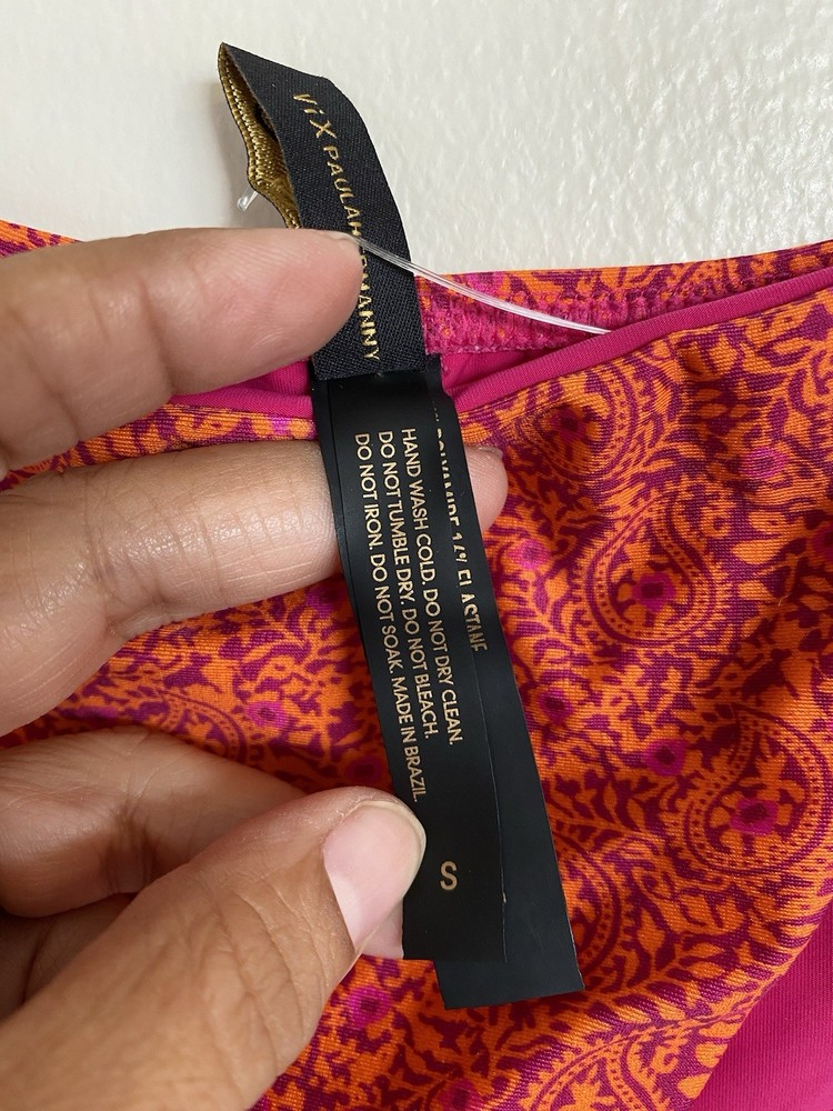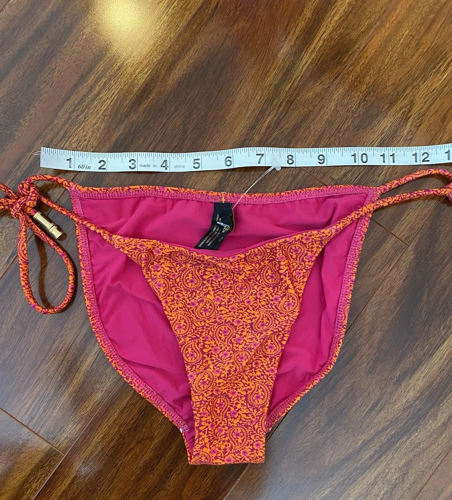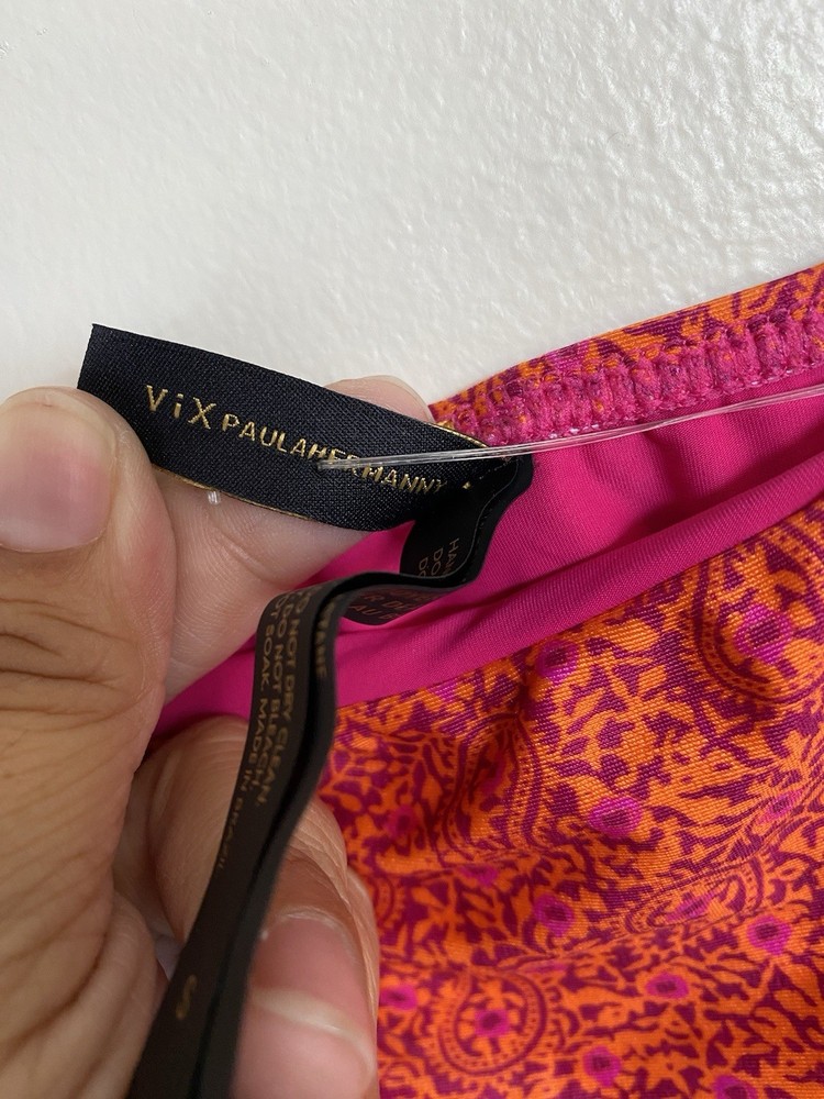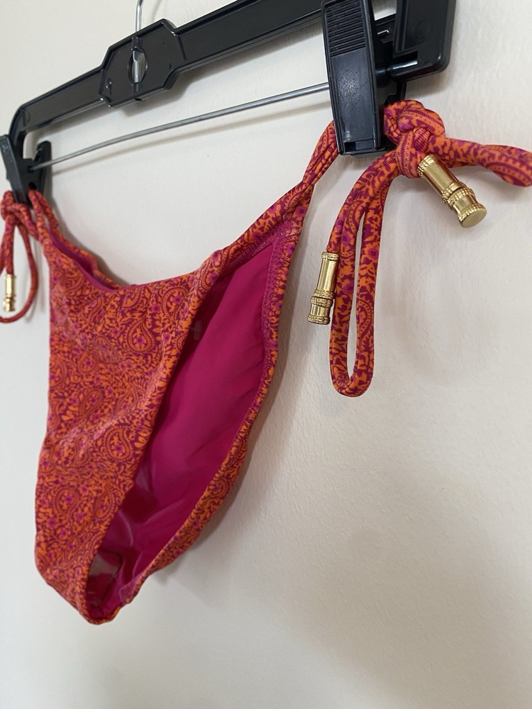 The Vix Paula Hermanny Bikini Bottom is a stylish swimwear piece featuring a vibrant floral pattern in pink and orange with gold accents. This bikini bottom is designed for women in size small, with a regular size type. The straps and beaded accents add a touch of elegance to the metal theme of the bikini, making it a fashionable choice for beach days or poolside lounging.