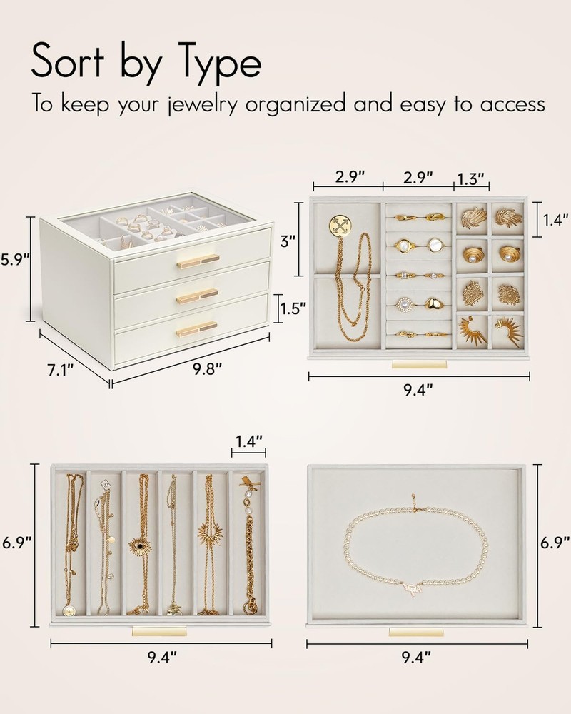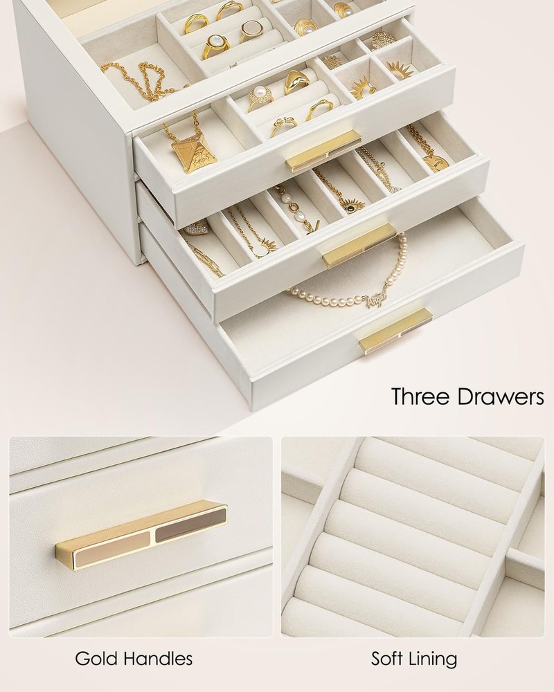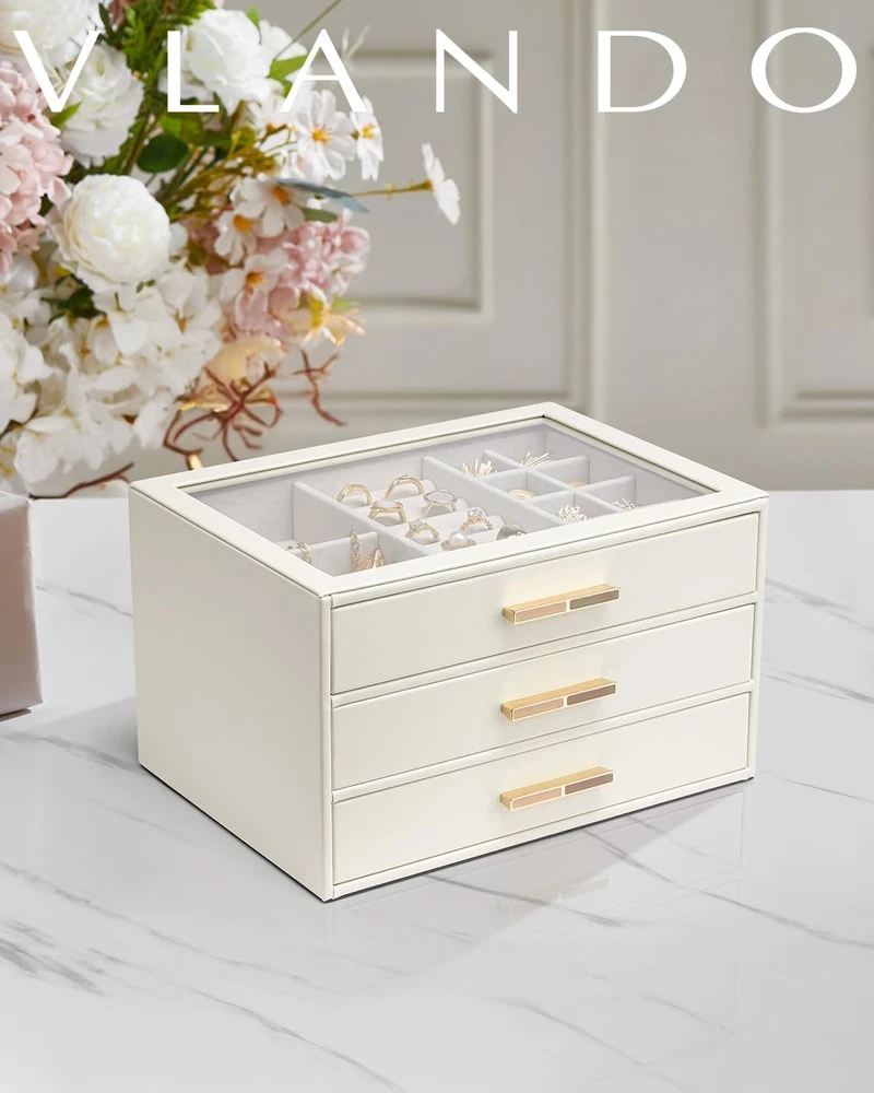 Vlando Jewelry Box for Women Girls,Jewelry Organzier,3 Drawers,Glass Lid Jewelry Organizer Storage for Gem Diamond Necklaces Rings Earrings Bracelets White - Buy Now with Fast Shipping! Vlando Jewelry Box for Women Girls,Jewelry Organzier,3 Drawers,Glass Lid Jewelry Organizer Storage for Gem Diamond Necklaces Rings Earrings Bracelets White Product Details Color: White Brand: Vlando Material: Faux Leather Style: Modern Special Feature: Adjustable Product Dimensions: 9.8"D x 6"W x 7.1"H Target Audience: Women Shape: Rectangular Finish Type: Polished Inner Material: Velvet Color: White Brand: Vlando Material: Faux Leather Style: Modern Special Feature: Adjustable Product Dimensions: 9.8"D x 6"W x 7.1"H Target Audience: Women Shape: Rectangular Finish Type: Polished Inner Material: Velvet Number of Drawers: 3 Number of Compartments: 3 Jewelry Storage Type: Jewelry Box Manufacturer: VLANDO Occasion: Memorial Day Mounting Type: Table Top Closure Type: Latch Item Weight: 4.77 pounds Size: 3 layer Finish: Polished Special Features: Adjustable Batteries Included?: No Batteries Required?: No Date First Available: September 29, 2024 Key Features ✅ CLEAR GLASS COVER: The large glass cover allows you to display your jewelry and find it quickly when you want to use it, and also prevents dust from getting in, so that your jewelry stays shiny; Size: 9.8''X7.1''X6'' ✅ 3 LAYERS JEWELRY BOX: this jewelry box has 3 layers, each layer has a different layout, small space layout can store your earrings, rings, brooches; large space design can store your bracelets, pearl necklaces, watches, etc., lined with velvet, can prevent your jewelry from friction; ✅ Jewelry to maintain the luster: more closed jewelry box, can effectively prevent the air in, can delay the problem of oxidation and blackened jewelry, so that your jewelry to maintain the luster; ✅ The best choice for gift giving: high quality material, exquisite workmanship, elegant appearance, the jewelry box comes with a gift card, you can write your blessings, do not need to buy an additional card; very suitable for birthdays, anniversaries, Christmas, New Year's Day, Thanksgiving Day as a gift for women, girls, wives, daughters, friends. ✅ MULTI-PURPOSE: The leather jewelry box can be placed on a vanity table or checkroom cabinet to store your earrings, necklaces, rings, brooches, watches and other accessories, and can also be placed in the living room as a display! Product Description