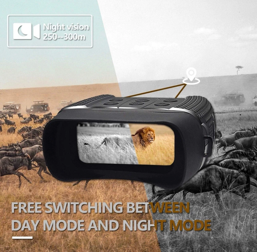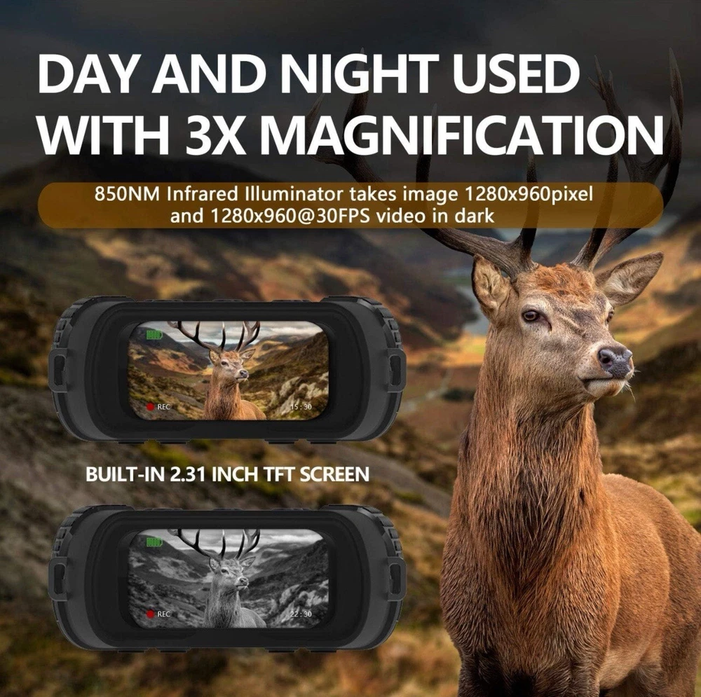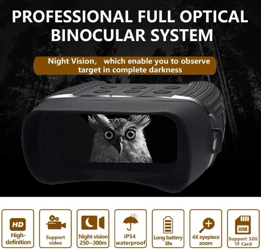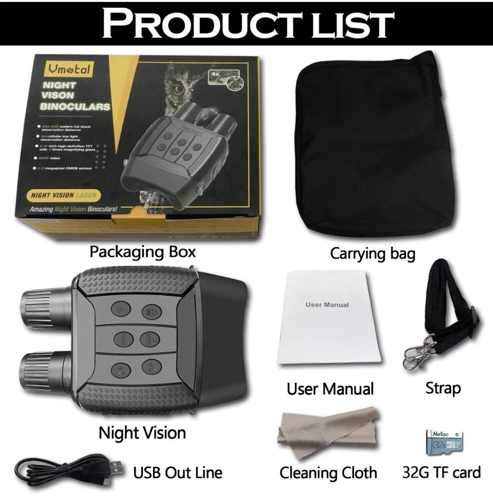 Photo Resolution: 1M(1280x960)by interpolation、VGA(640x480) Video Resolution: 960P(1280x960@30FPS )by interpolation、VGA(640x480@30FPS ) Lens: F1.2 larger aperture, f=25mm,Auto IR filter Lens Angle: FOV=10°,caliber is 24mm Display Screen: Inner screen is 2.31”960*240 TFT LCD, Outer screen is 98x48mm,with 5X large window magnifier Storage Media: Micro SD card, up to 32GB USB Port: Micro USB 2.0 MIC: NO Speaker: NO Auto off: 3 min/ 5 min/ 10 min/OFF IR LED: 3W,850nm strong infrared spotlight ,7 grades infrared adjustment View Distance In Complete Darkness: About 984ft/200-300 meters View Distance In Low Light: 118 inch/3 meters~infinity Digital Zoom: Digital Zoom 4X Power Source: 9V;6*AA alkaline, not include OSD Language: Multiple languages are optional Date Stamps : Support to set date and time. Date and time stamp on photo and video files. Operation Buttons: 6 buttons Operation Temperature: '-4F to +140F Storage Temperature: '-22F to +150F Dimensions & Weight: approx. 8*5.4*2.2inch /1.3lb Package List: Night Vision x1 Carrying bag x1 32G TF card x1 USB Out Line x1 Cleaning Cloth x1 Instruction x1 Strap x1