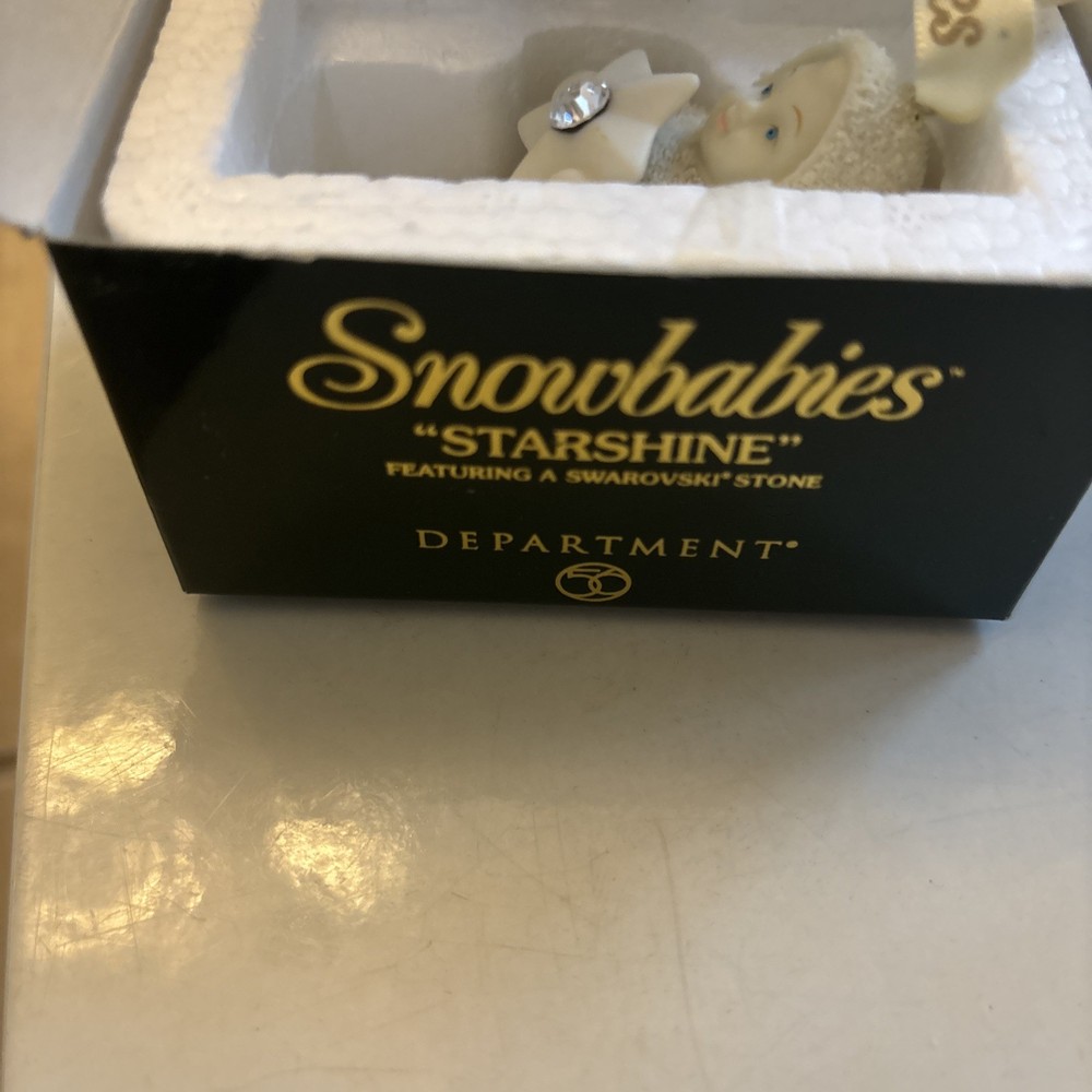 The Vntg 2000 Dept. 56 Snowbabies "Starshine" Swarovski Crystal Ornament is a charming addition to any Christmas decor collection. This small, ivory-colored ornament features a starshine character in slipcast porcelain, adorned with Swarovski crystals for a festive and elegant look. The hanging ornament comes in its original box from 2000 and is part of the Snowbabies collection by Department 56, perfect for adding a touch of holiday magic to any space.
