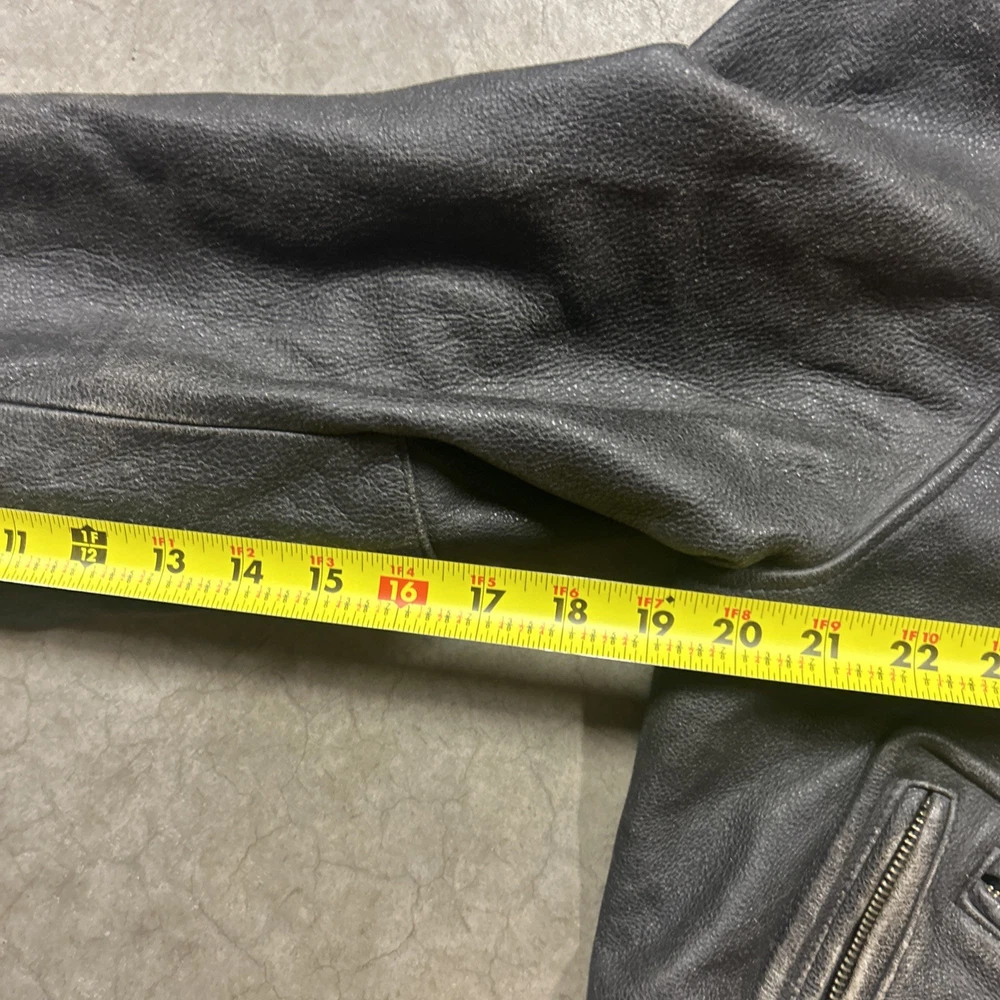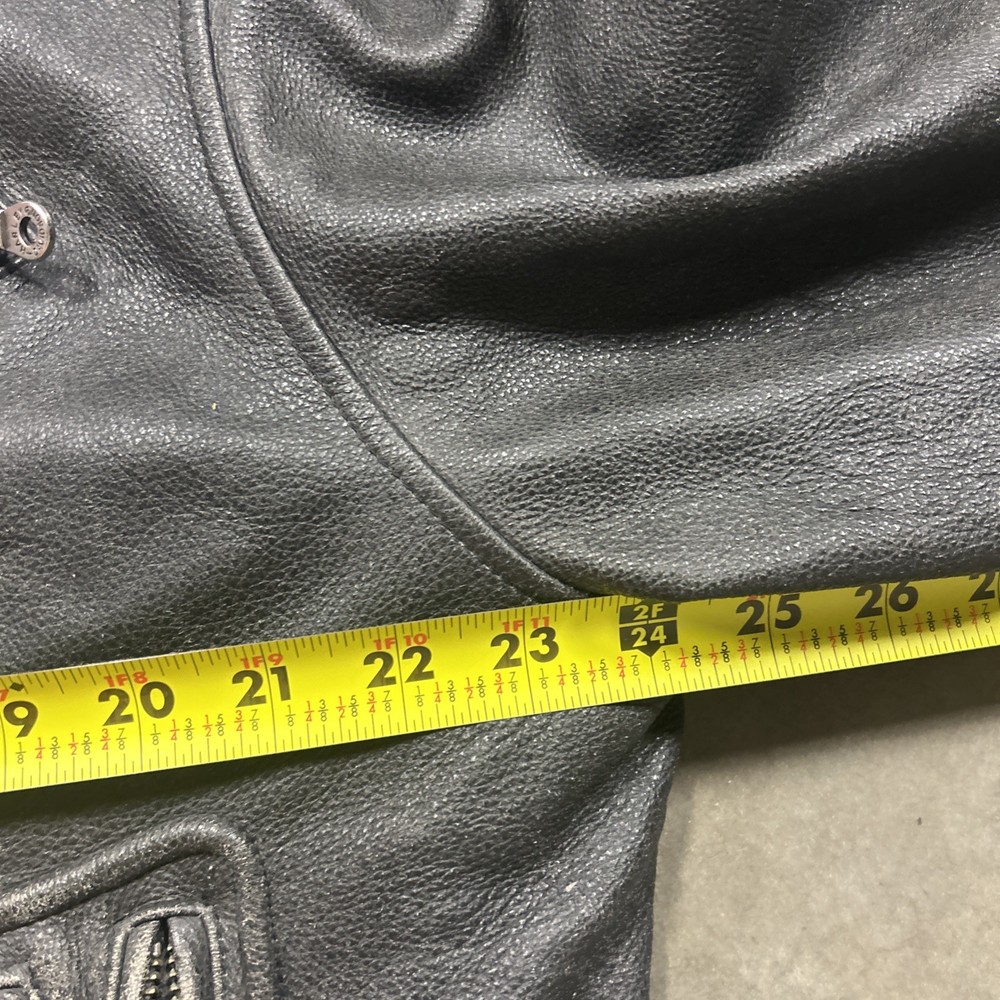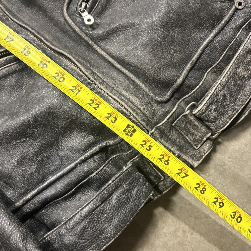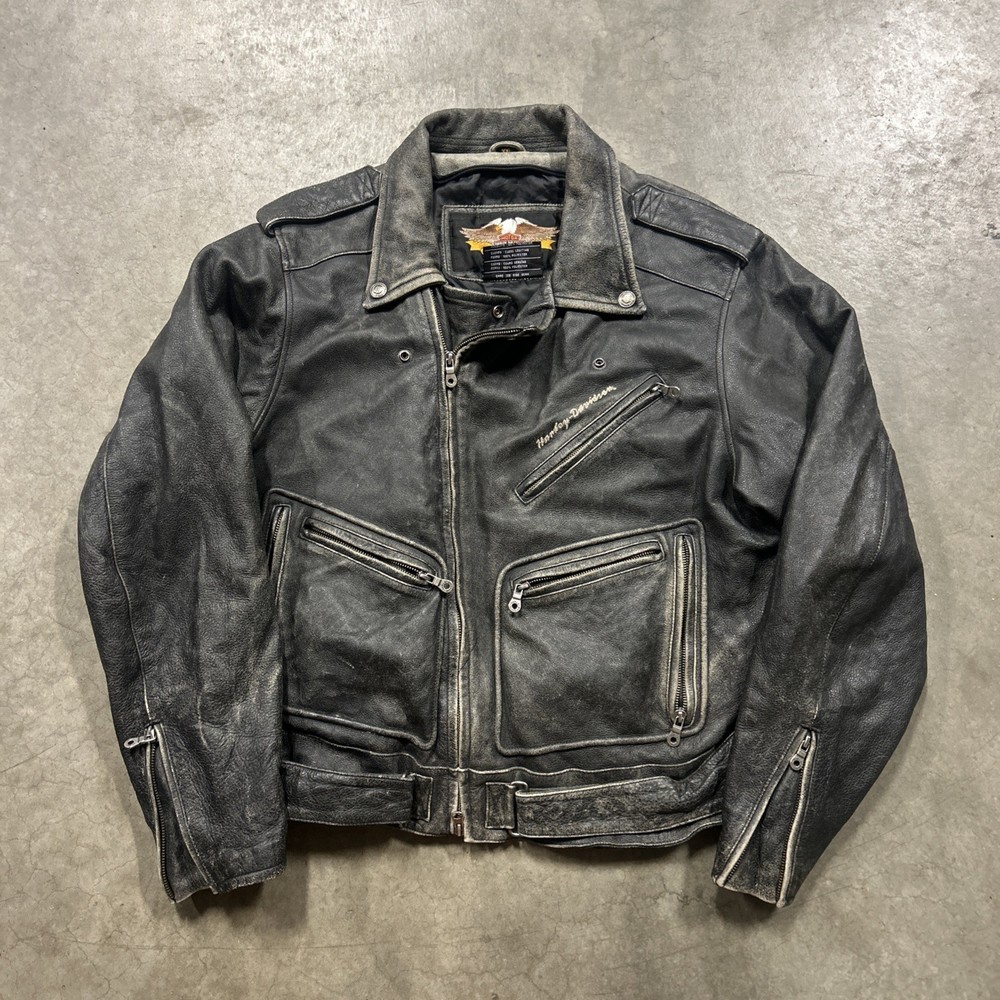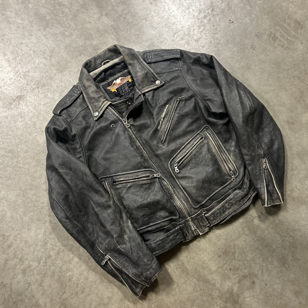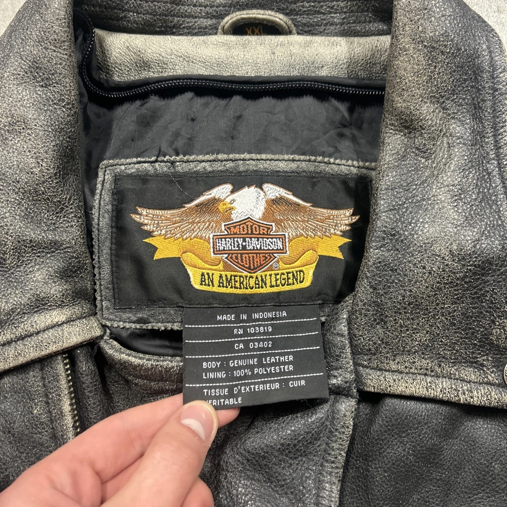 This vintage Harley Davidson 2XL men's distressed leather jacket is a classic piece with embroidered details that reflect its legendary status. The mid-length jacket features a full zipper closure, making it perfect for casual occasions or riding in the winter, fall, or spring. Handmade and part of the Made & Crafted product line, this jacket adds a touch of Motorcycle theme and style to any wardrobe. With its solid black color and distressed accents, this jacket is a must-have for any motorcycle enthusiast or Harley Davidson fan.