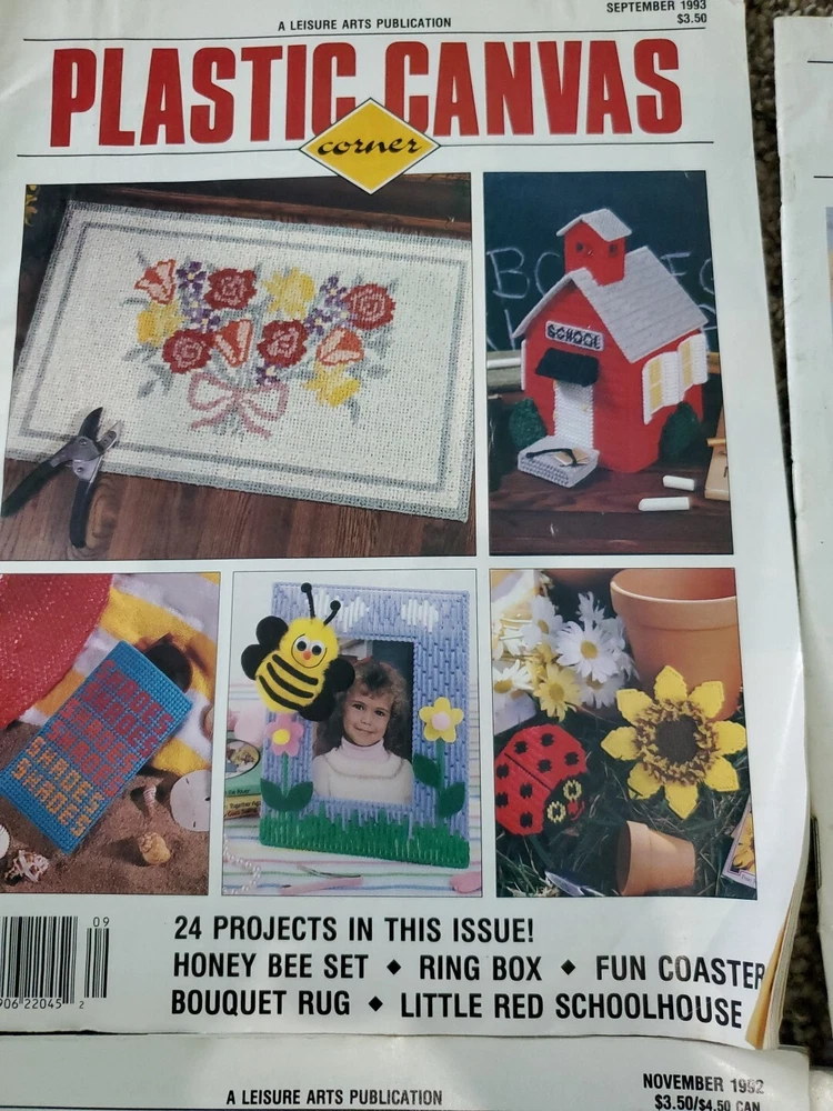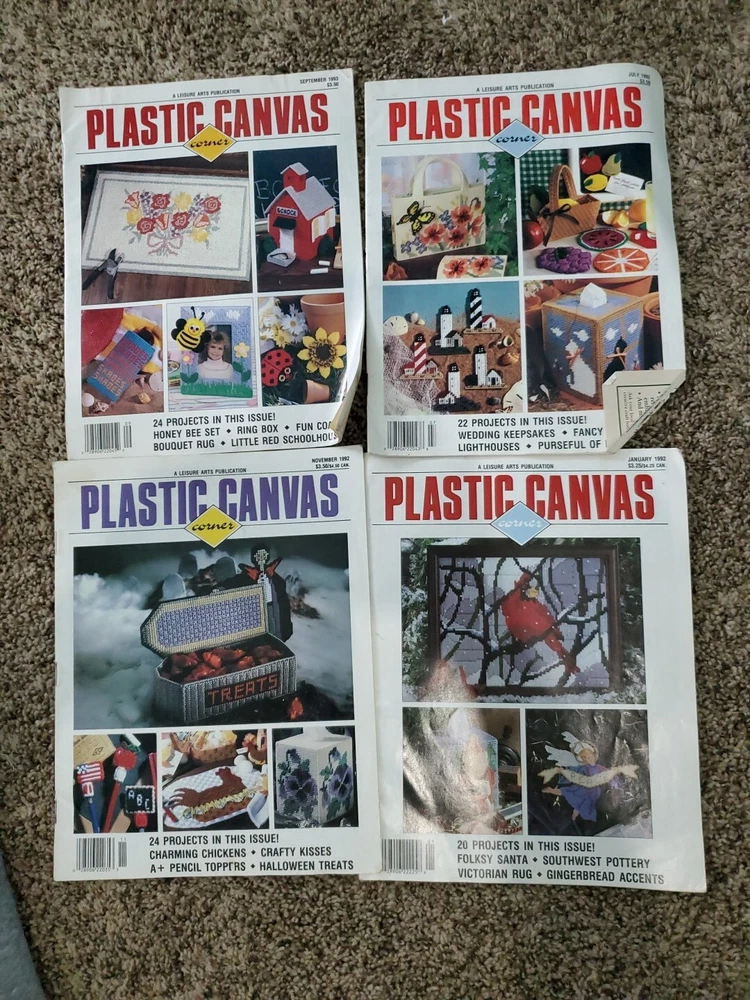 This lot of vintage needlework crafts features four plastic canvas patterns for Christmas and the holiday season. The designs include festive images such as Santa Claus and various animals and insects, making them perfect for any crafter interested in creating holiday-themed cross stitch patterns. The patterns are suitable for mixed brands of needlework materials and are sure to add a touch of charm and whimsy to any project.